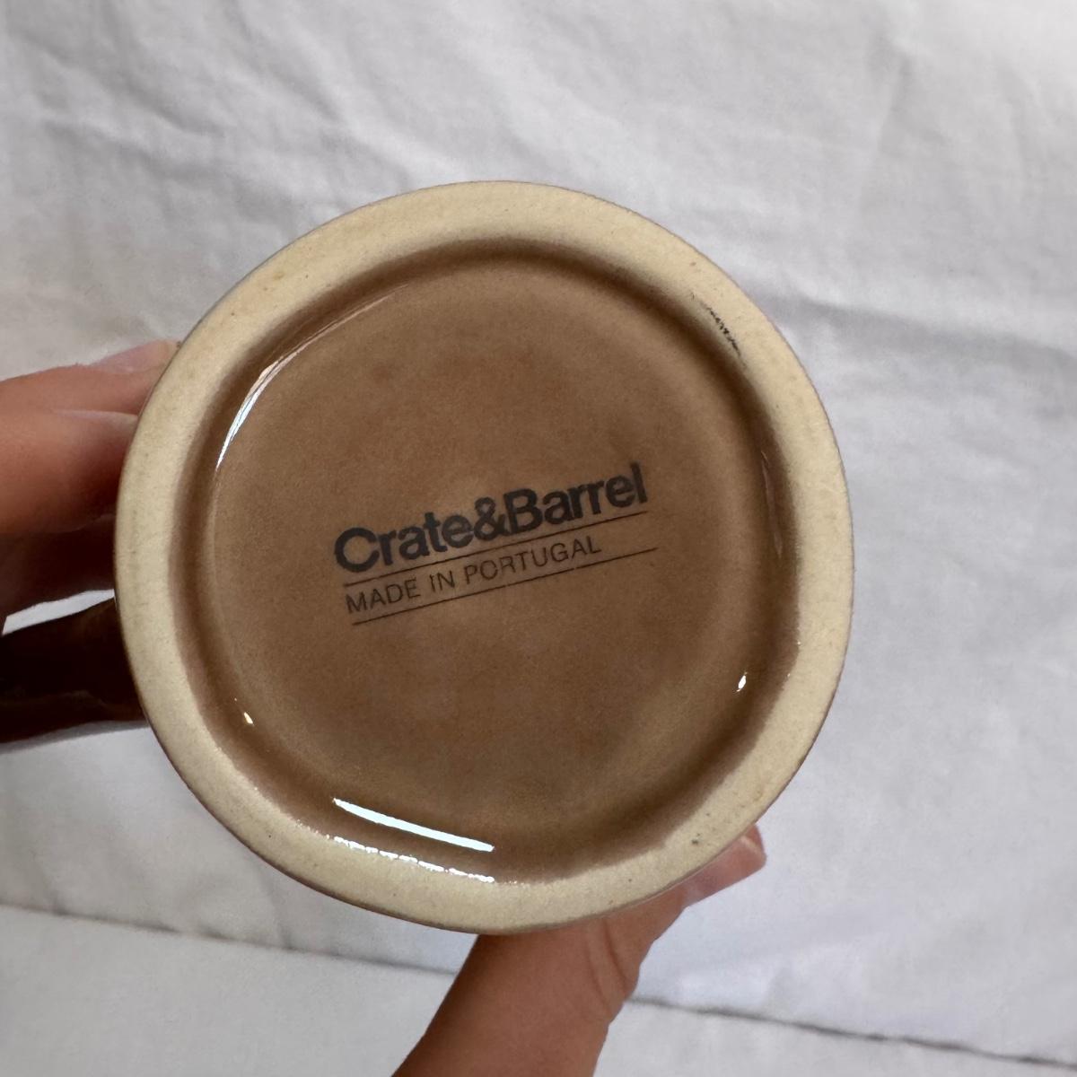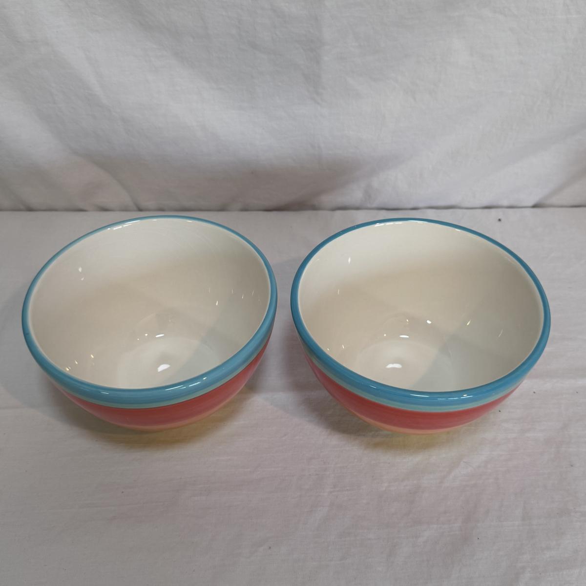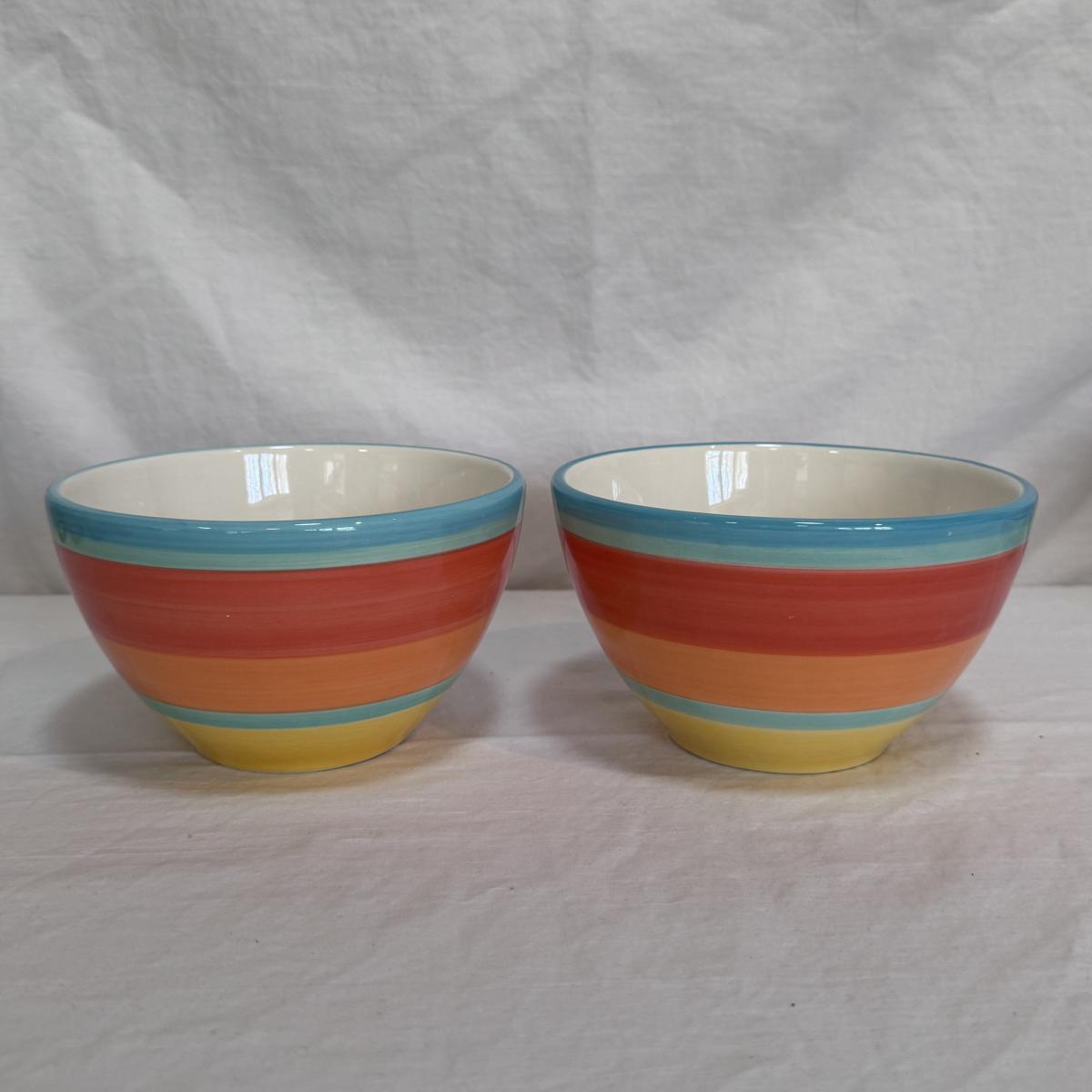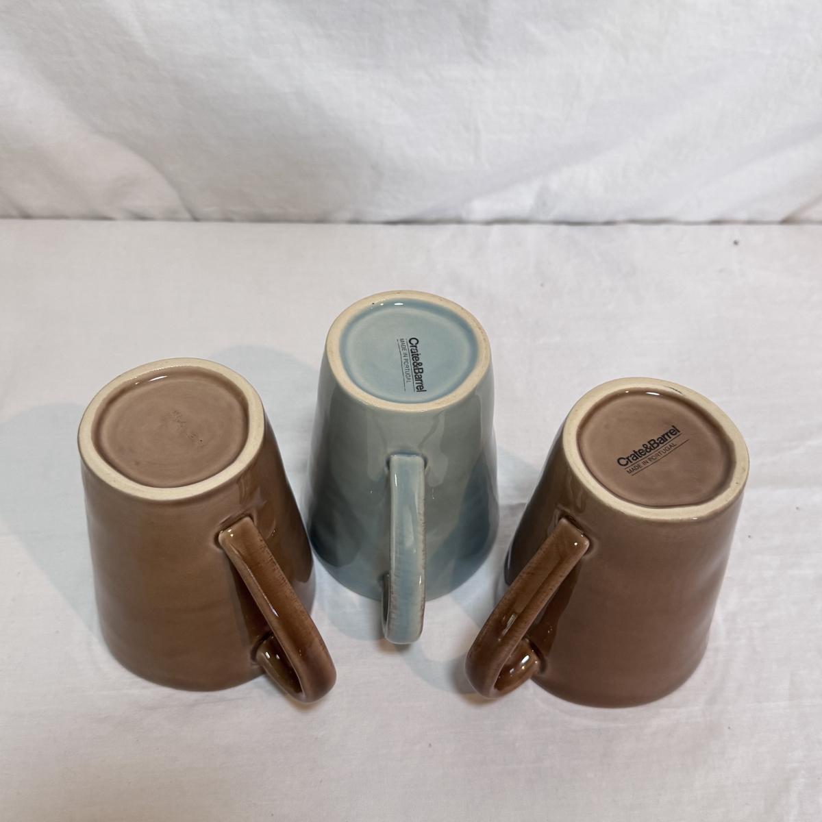 This lot includes eight Crate & Barrel small plates, two multi-colored striped bowls by Crate & Barrel, three mugs (two brown, one light blue) by Crate & Barrel, and four drinking glasses with tiny bubbles and blue rims. Two of the mugs are stamped with Crate & Barrel. The other mug appears to have been stamped, but it has since worn off. The small plates individually measure 6” x 1.5”H. Shipping available.