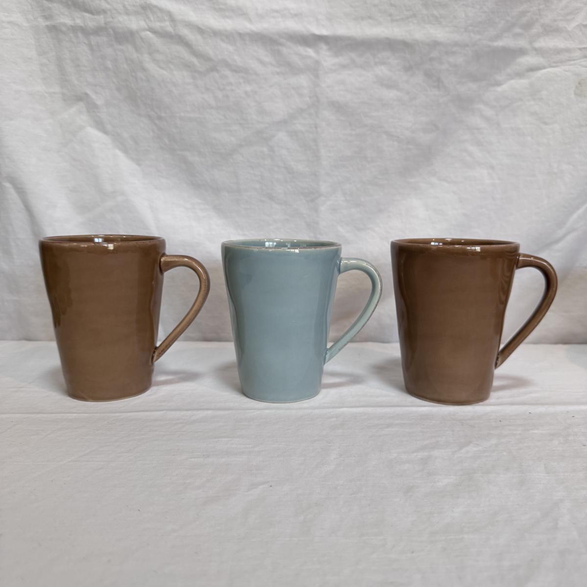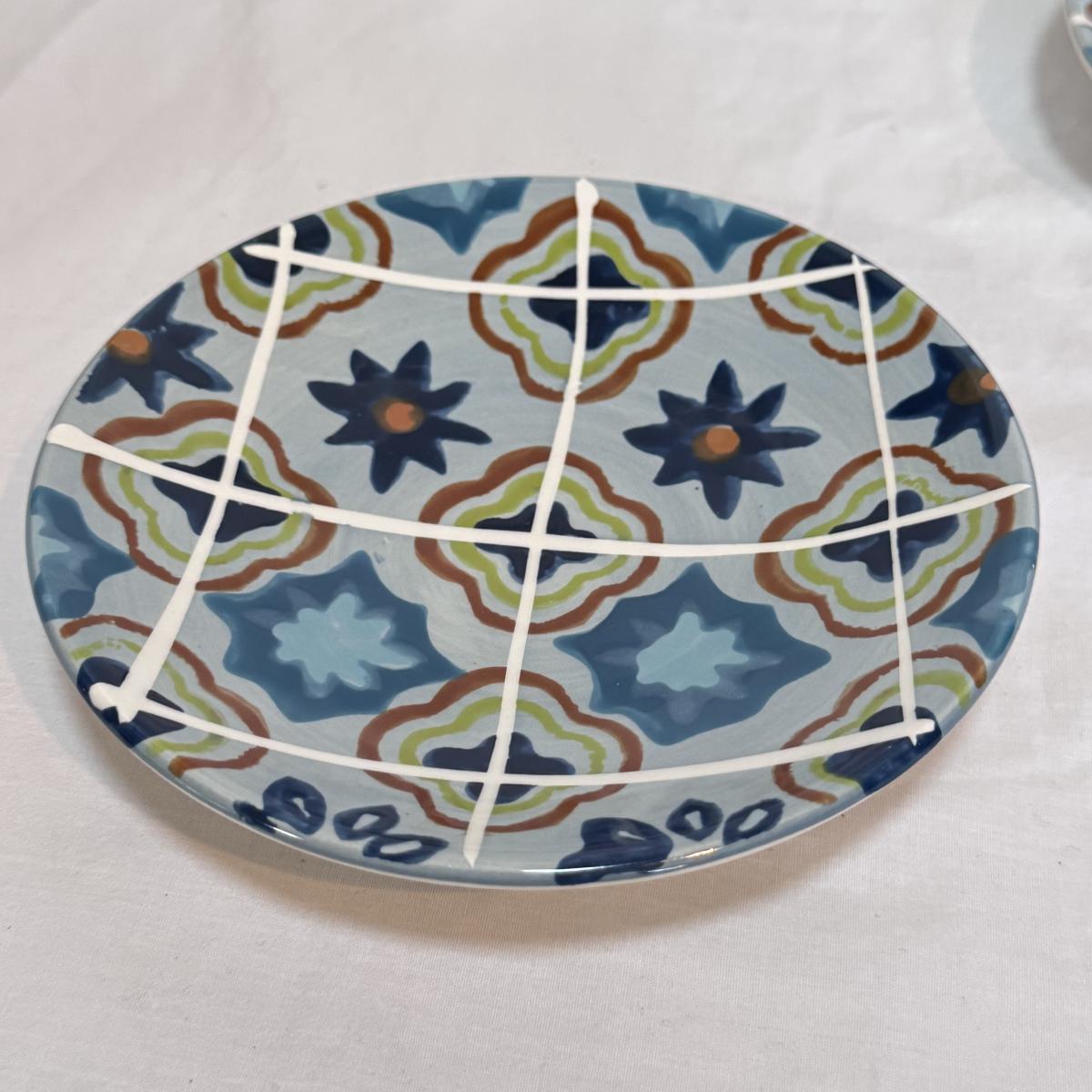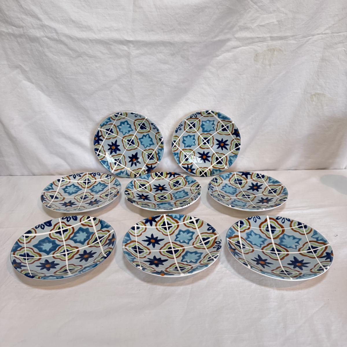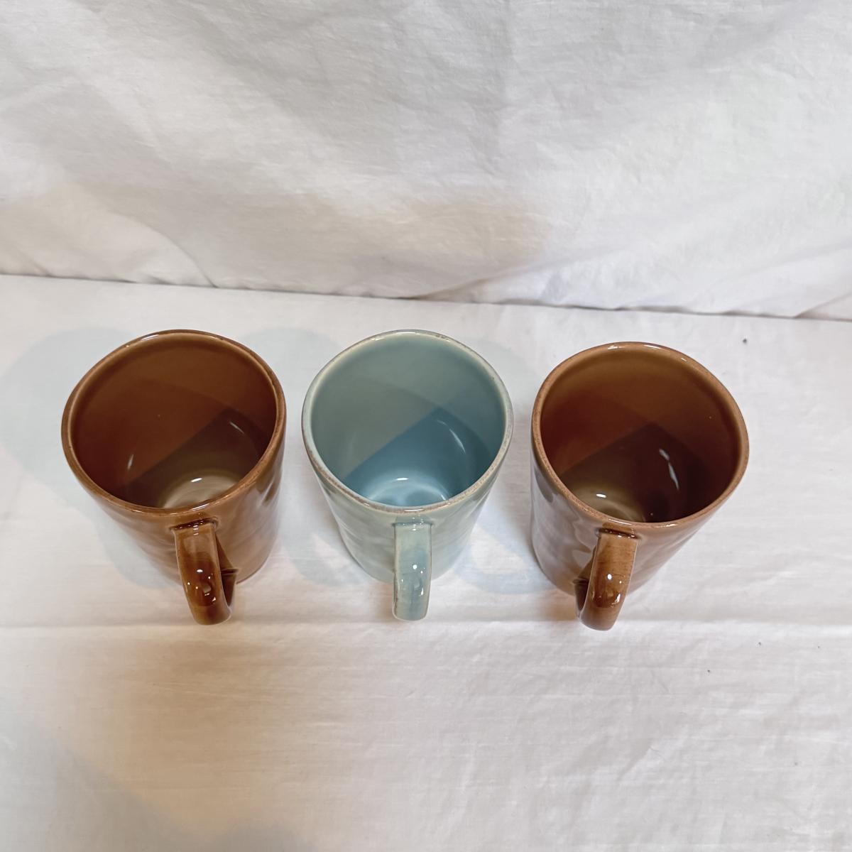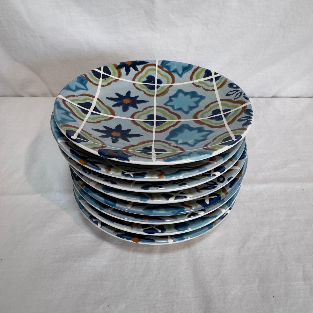 This lot includes eight Crate & Barrel small plates, two multi-colored striped bowls by Crate & Barrel, three mugs (two brown, one light blue) by Crate & Barrel, and four drinking glasses with tiny bubbles and blue rims. Two of the mugs are stamped with Crate & Barrel. The other mug appears to have been stamped, but it has since worn off. The small plates individually measure 6” x 1.5”H. Shipping available.