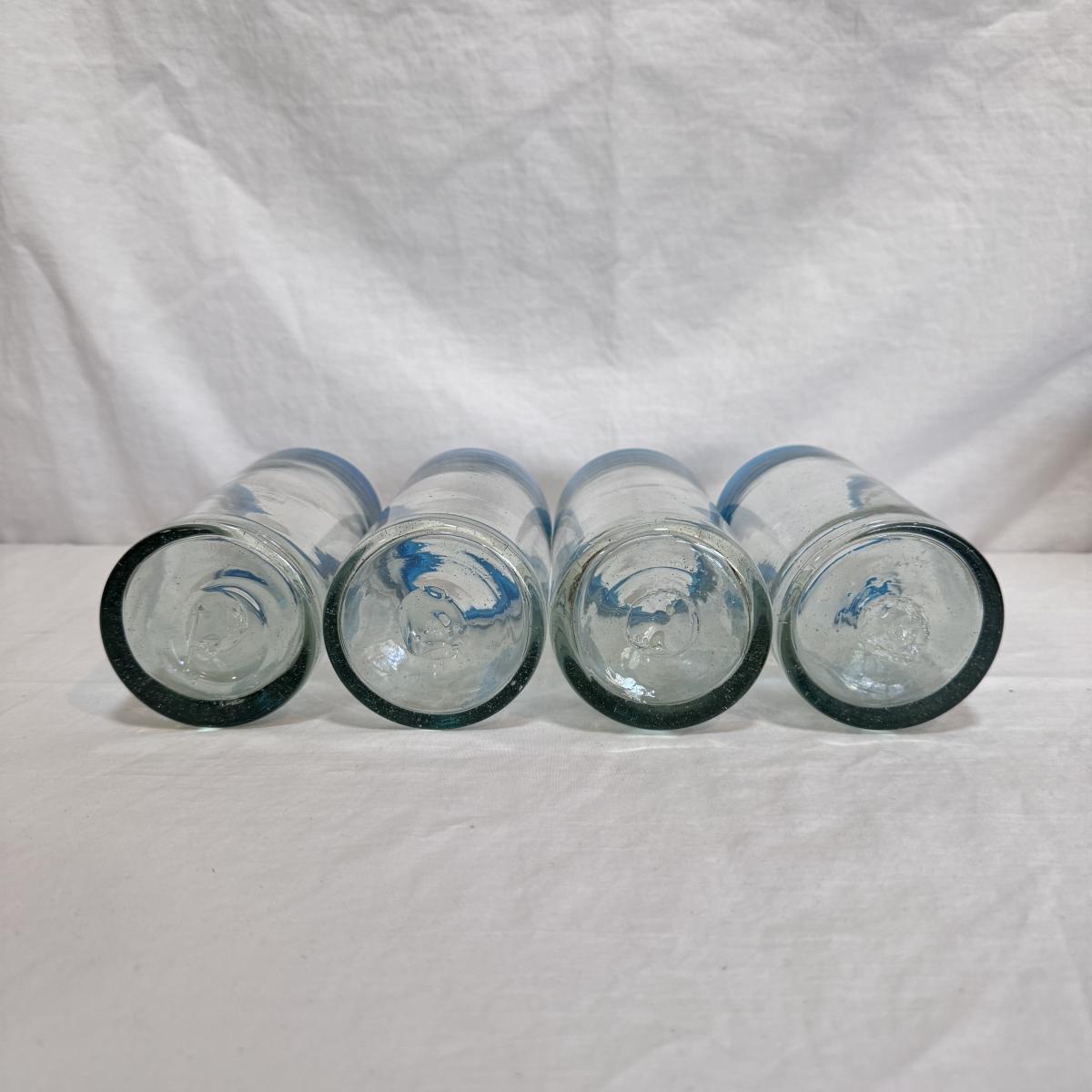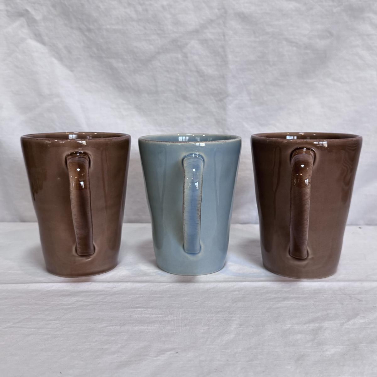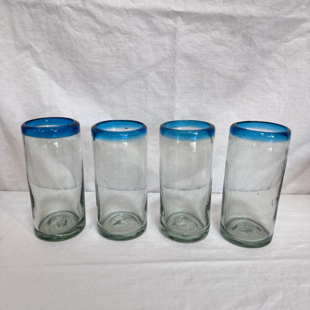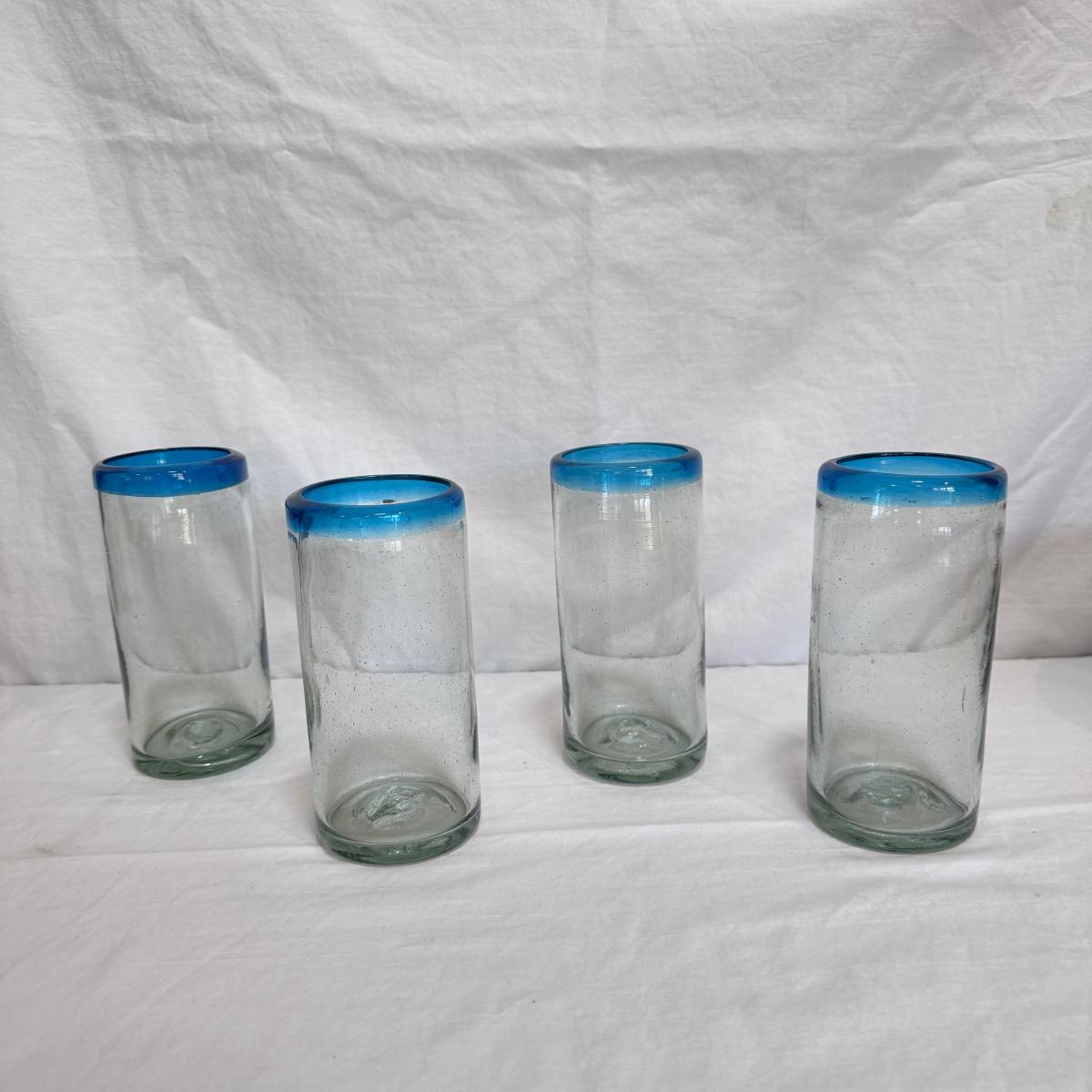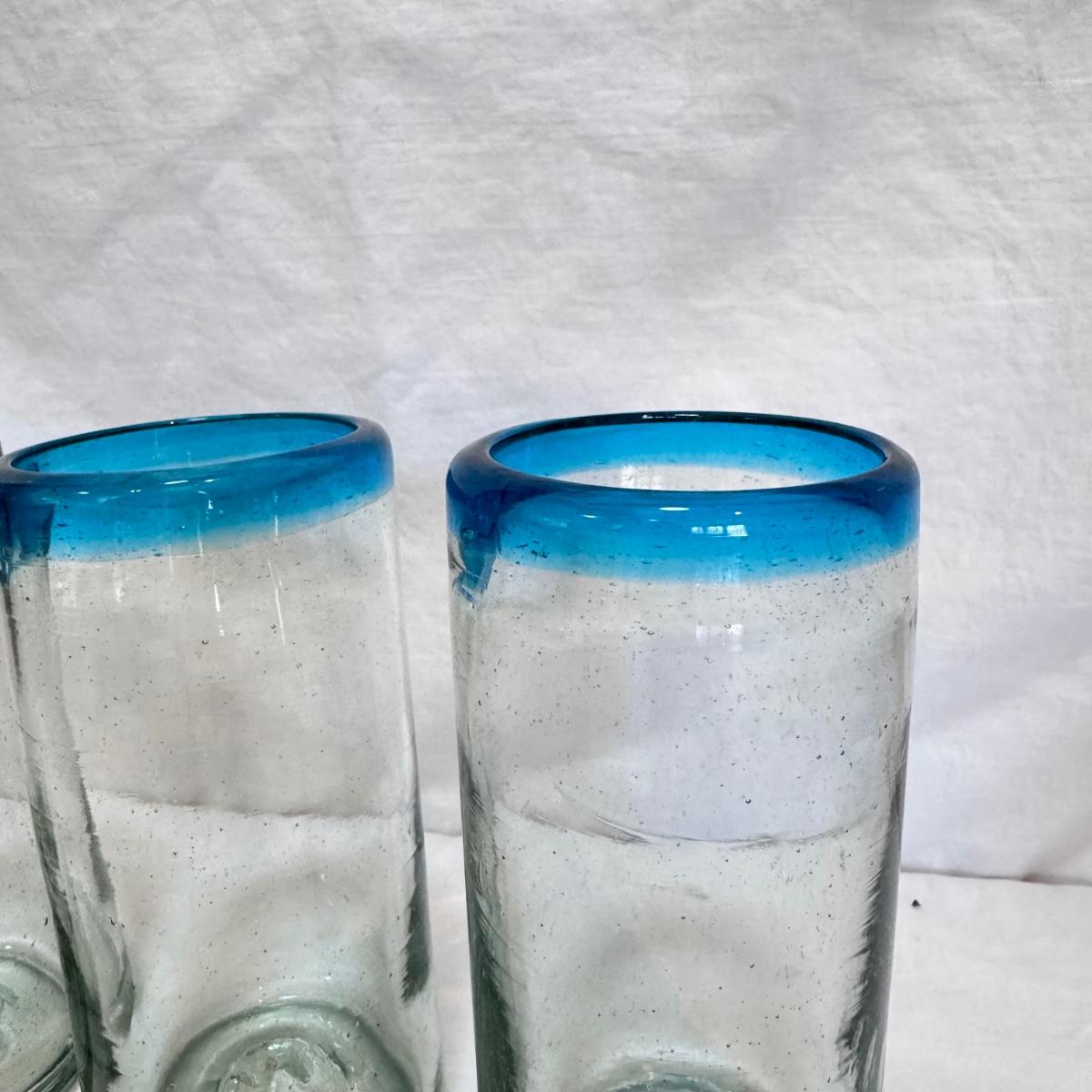 This lot includes eight Crate & Barrel small plates, two multi-colored striped bowls by Crate & Barrel, three mugs (two brown, one light blue) by Crate & Barrel, and four drinking glasses with tiny bubbles and blue rims. Two of the mugs are stamped with Crate & Barrel. The other mug appears to have been stamped, but it has since worn off. The small plates individually measure 6” x 1.5”H. Shipping available.