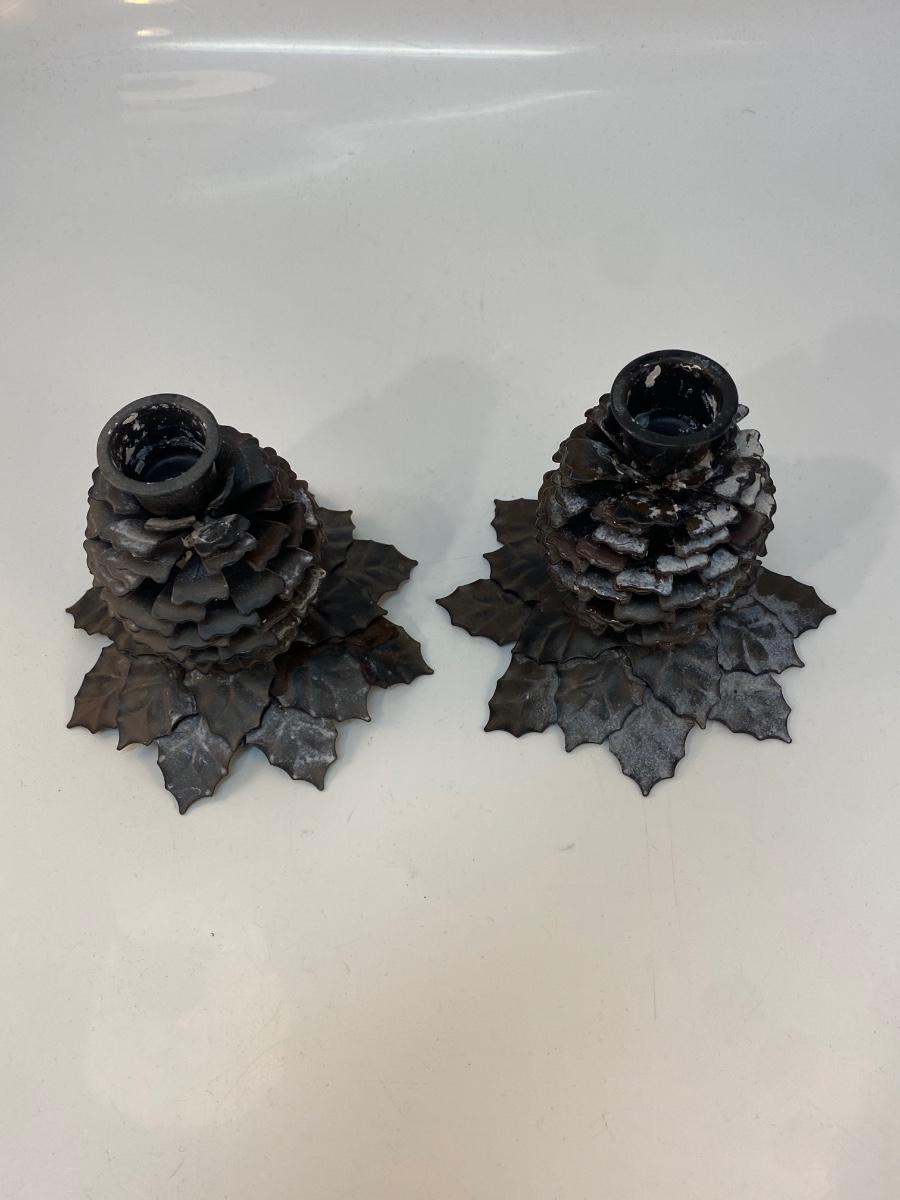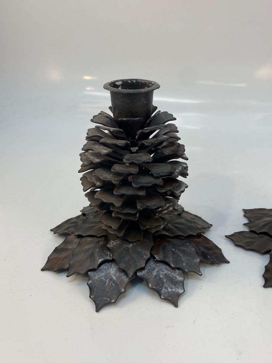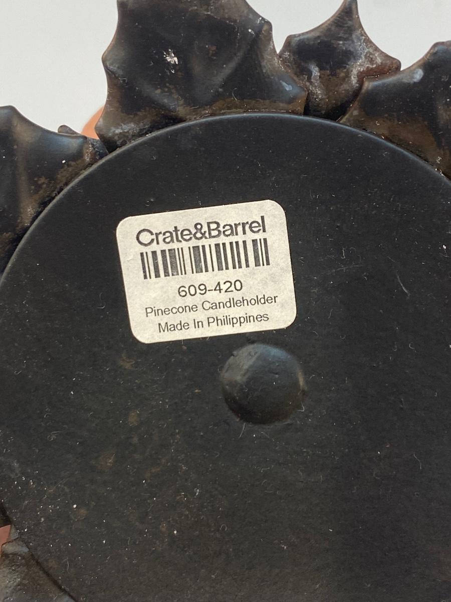 Crate & Barrel Pine Cone Candlestick Holders. In good previously used condition. May have wax on surface from previous use.