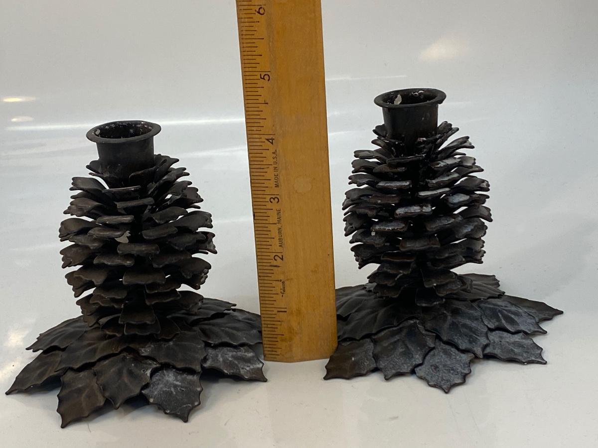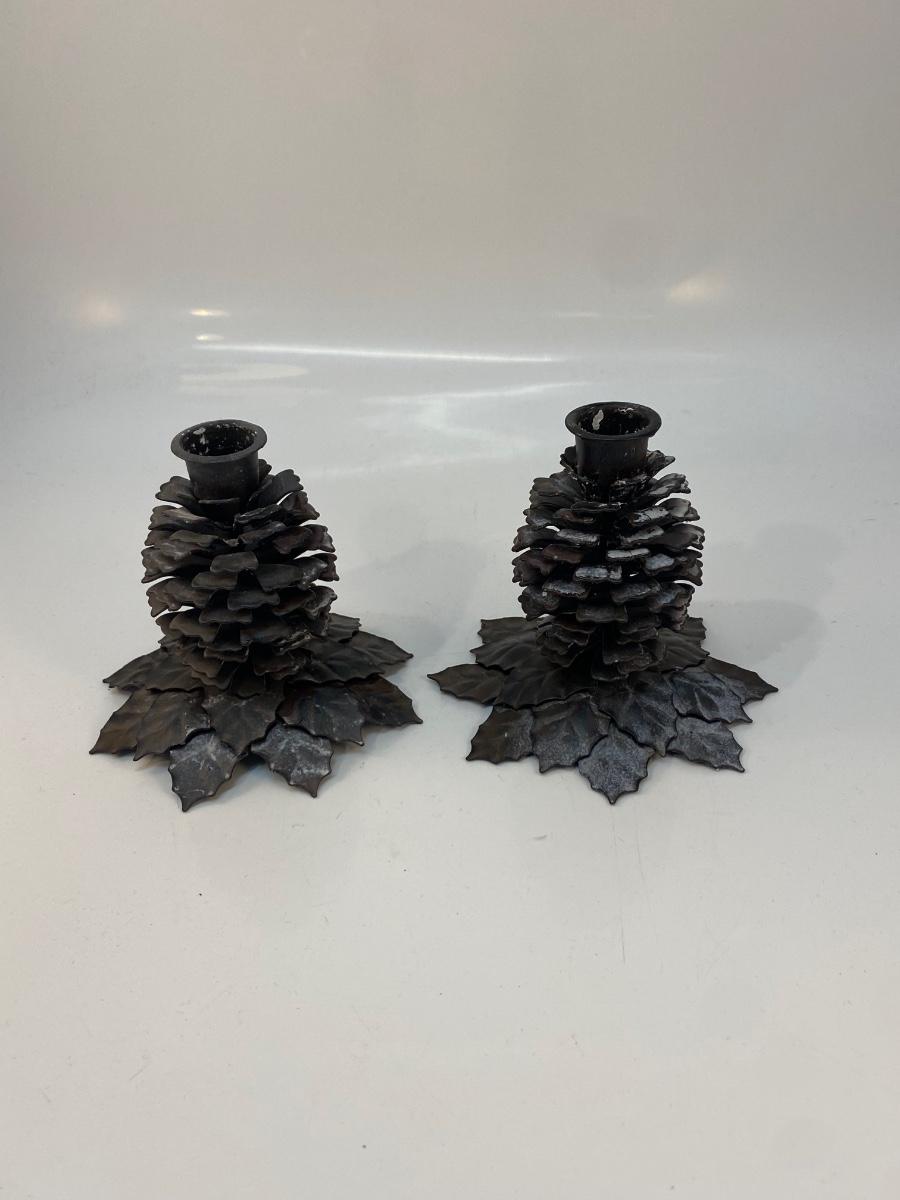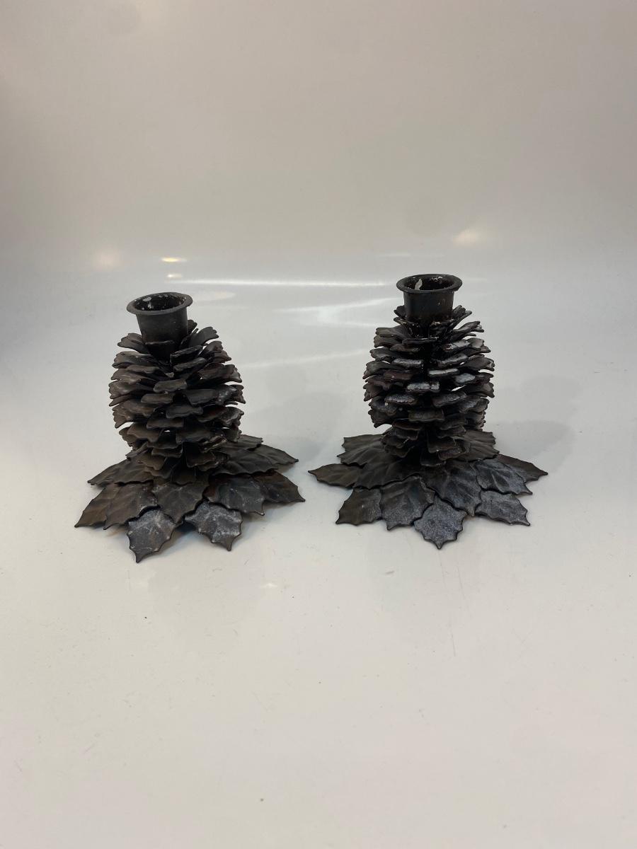 Crate & Barrel Pine Cone Candlestick Holders. In good previously used condition. May have wax on surface from previous use.