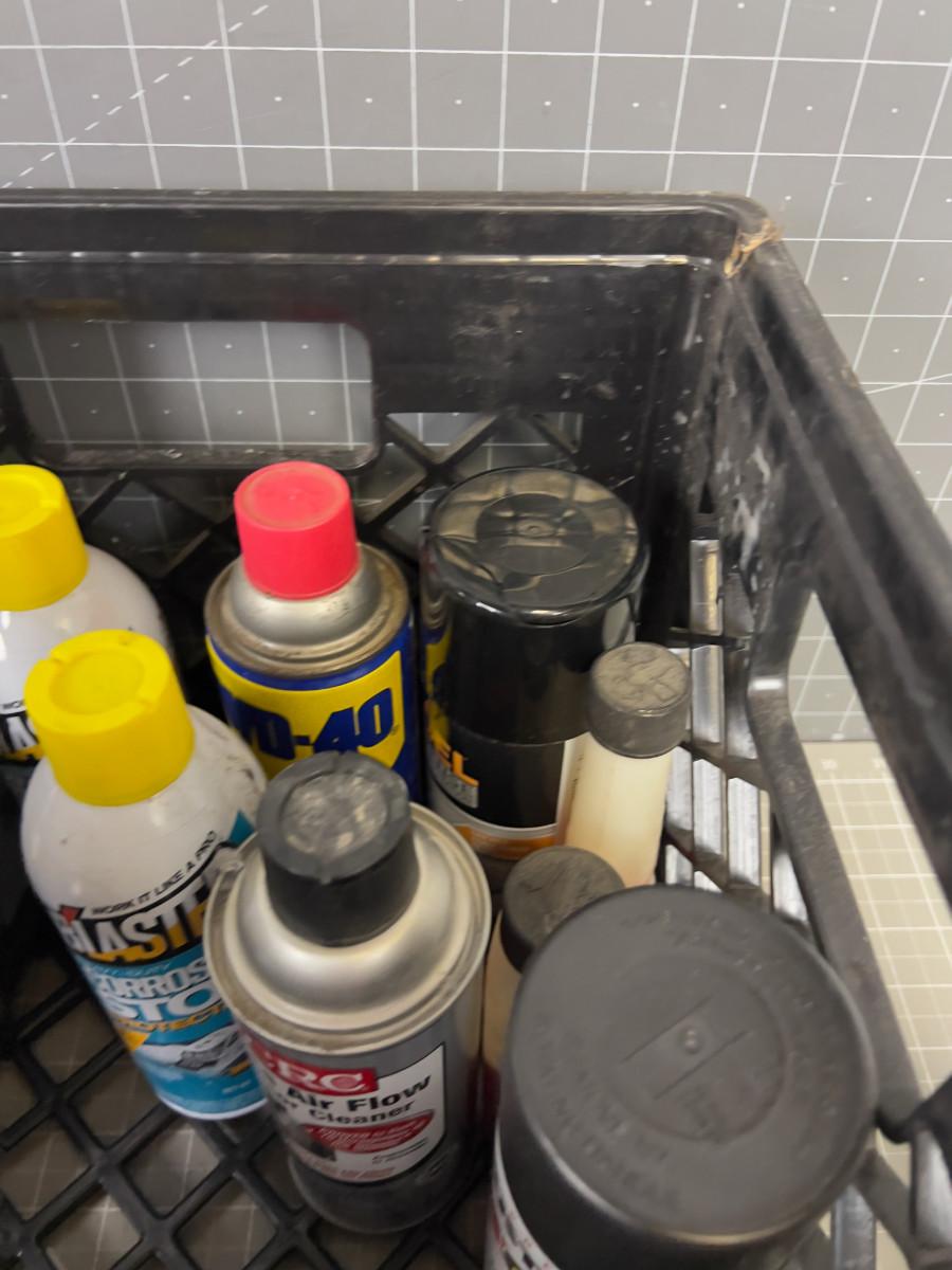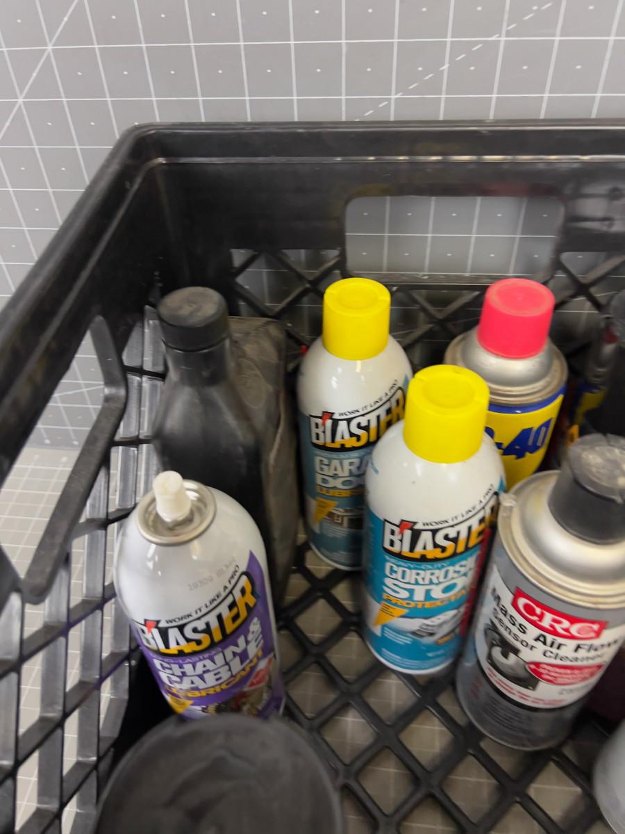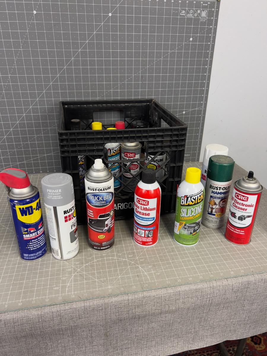 Crate full of Garage Products; Paints, Lubricants, Oils