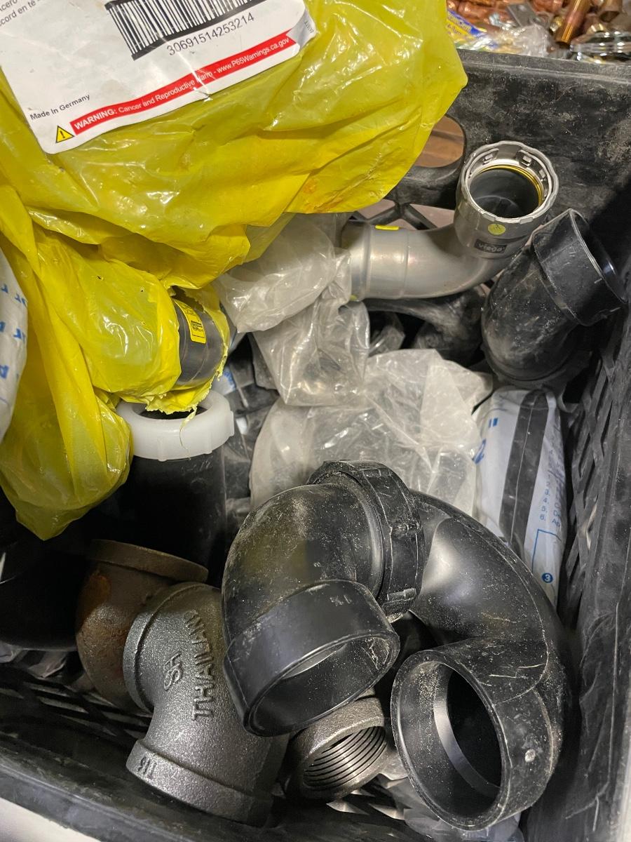 Crate of various plumbing pipe pieces - plastic and galvanized P-Traps & more
