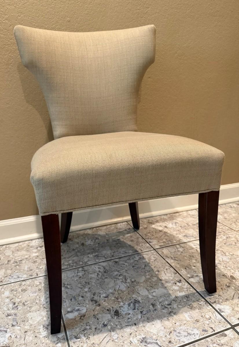 A Classic glamour upholstered dining chair that cuts a striking silhouette. Classic modern hardwood legs are stained a dark finish.