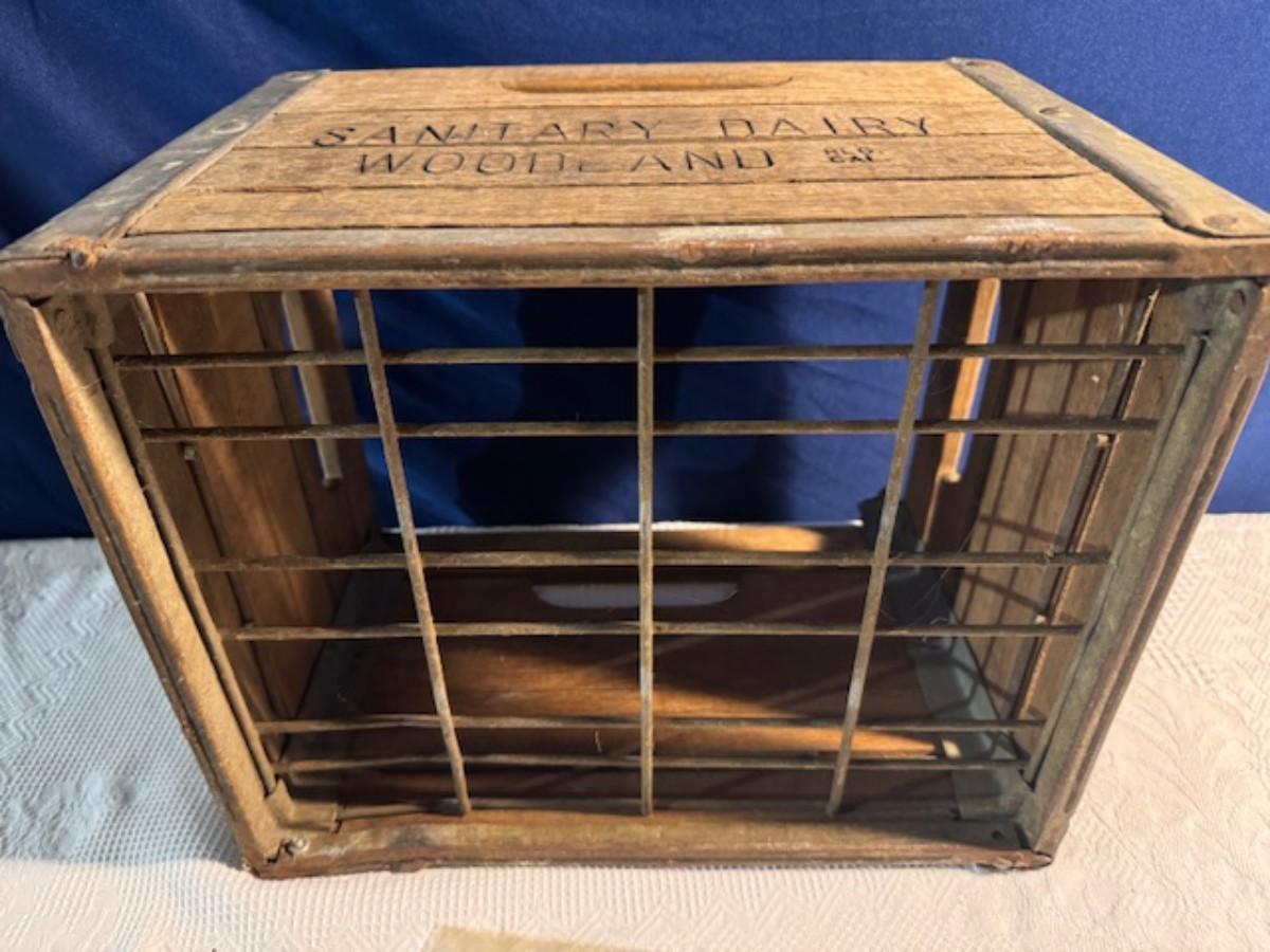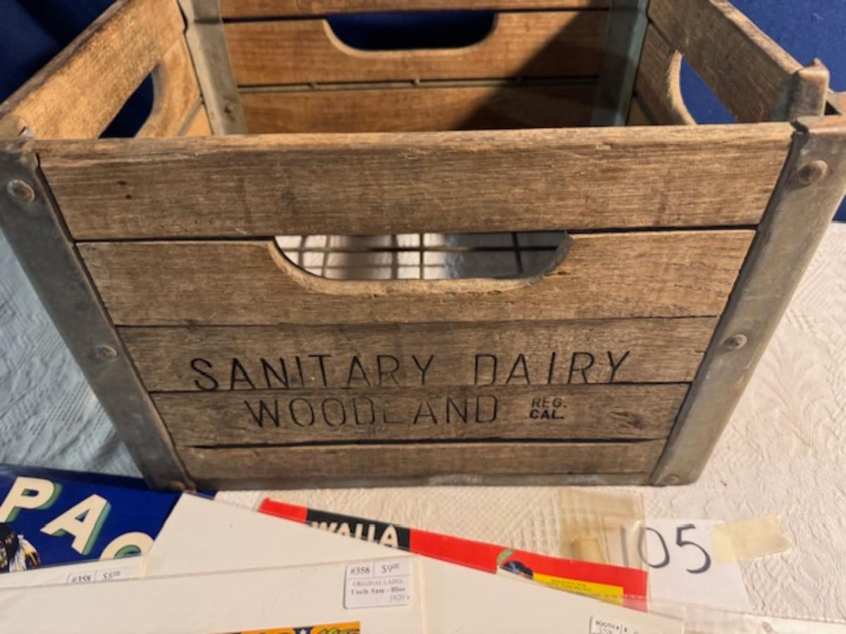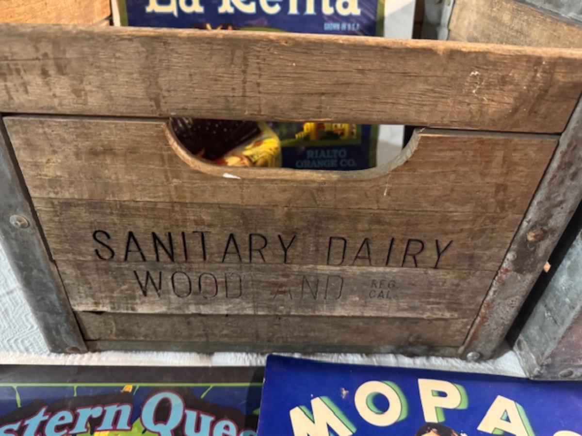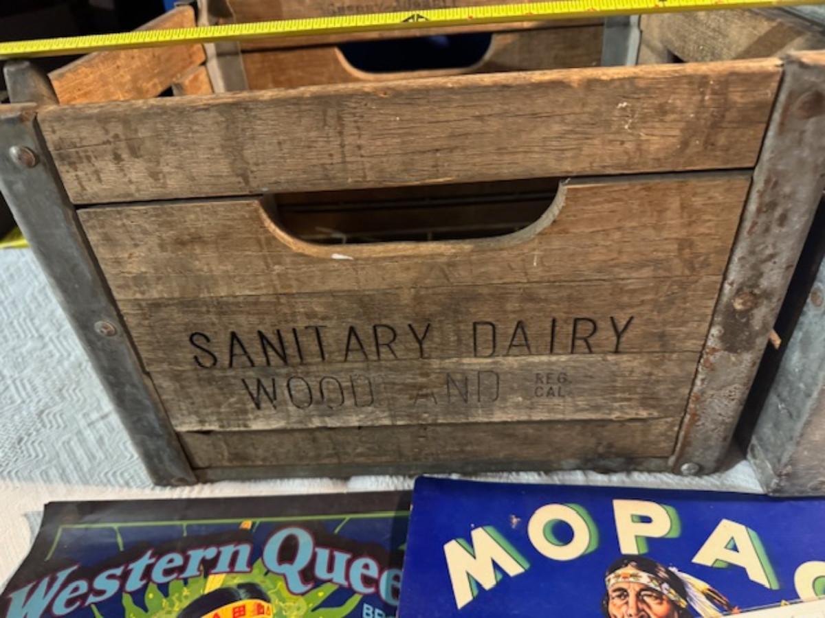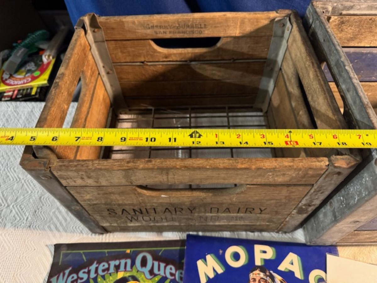 Crate metal and wood Sanitary Dairy Woodland 15" x 12 1/4" x 10", Crate metal and wood 18.5" x 13.5" x 10 1/4". 7 authentic labels (see back of label) new, 12 vintage advertisements as found.