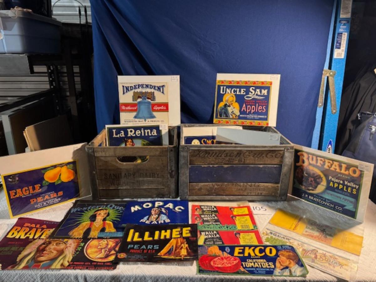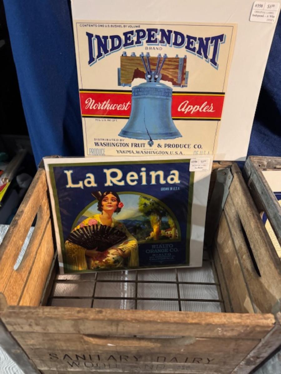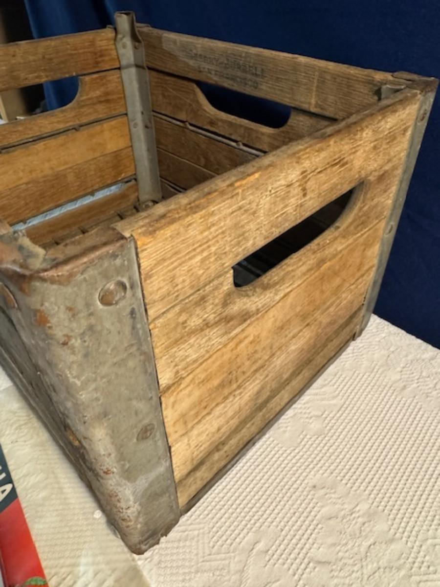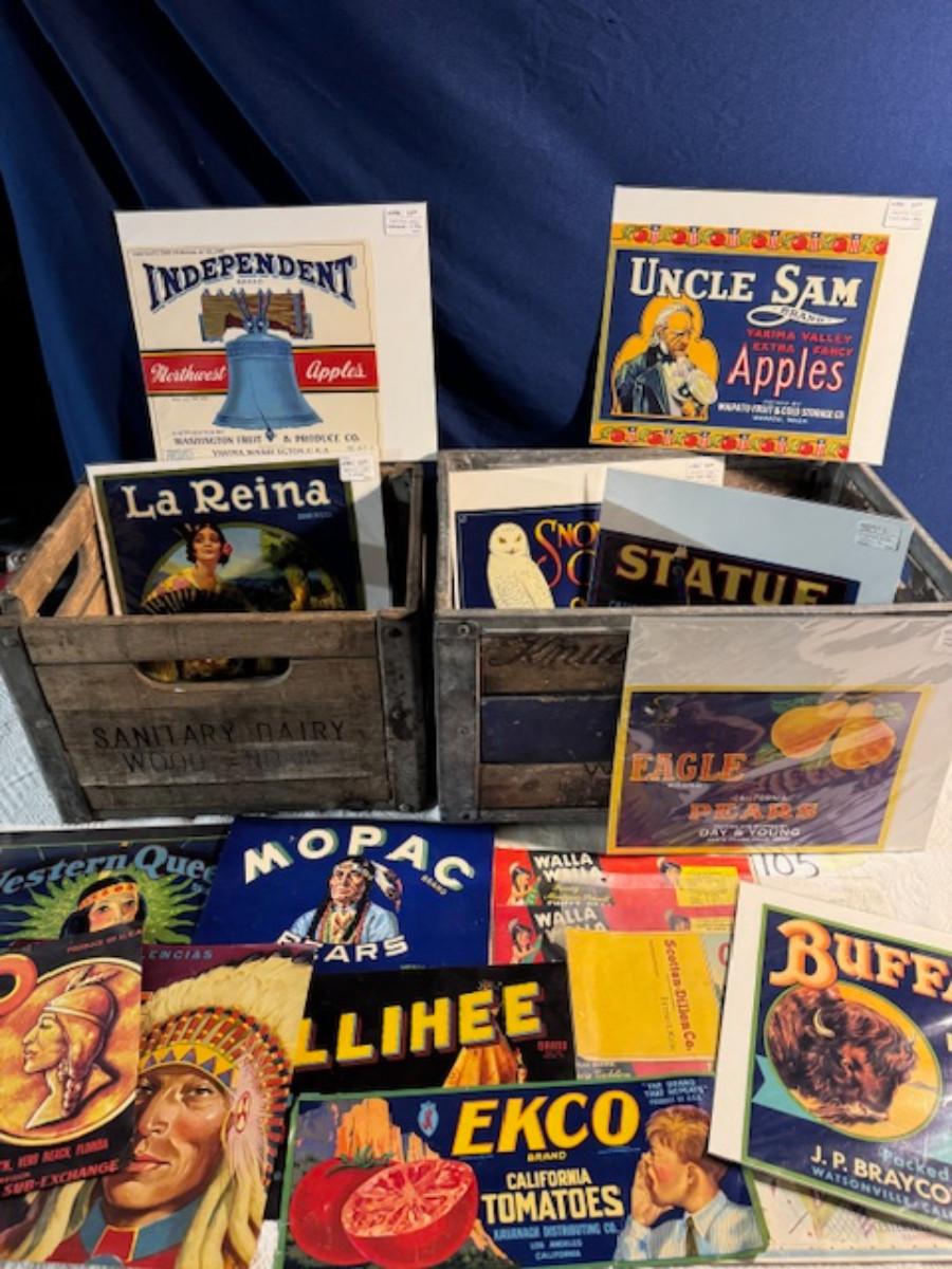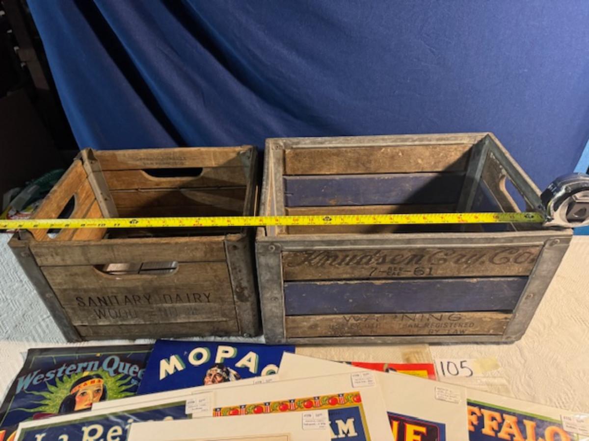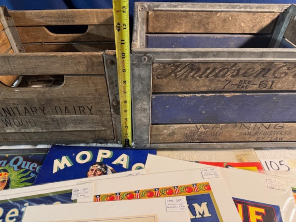 Crate metal and wood Sanitary Dairy Woodland 15" x 12 1/4" x 10", Crate metal and wood 18.5" x 13.5" x 10 1/4". 7 authentic labels (see back of label) new, 12 vintage advertisements as found.