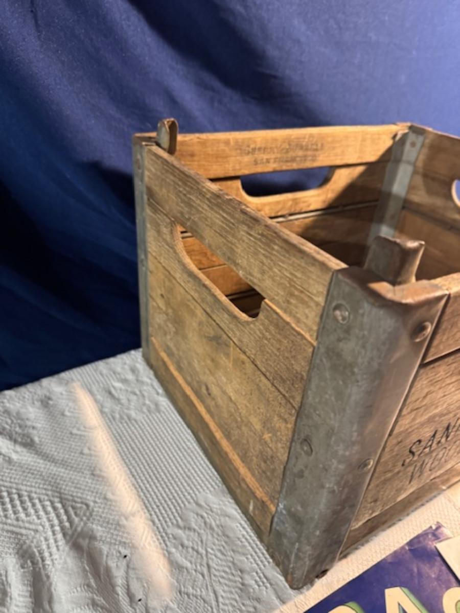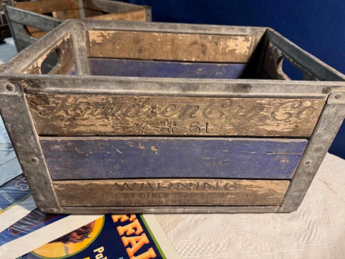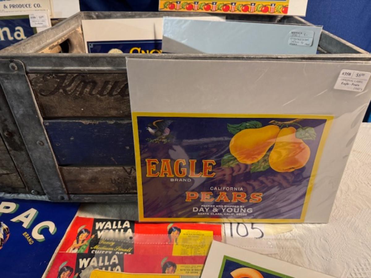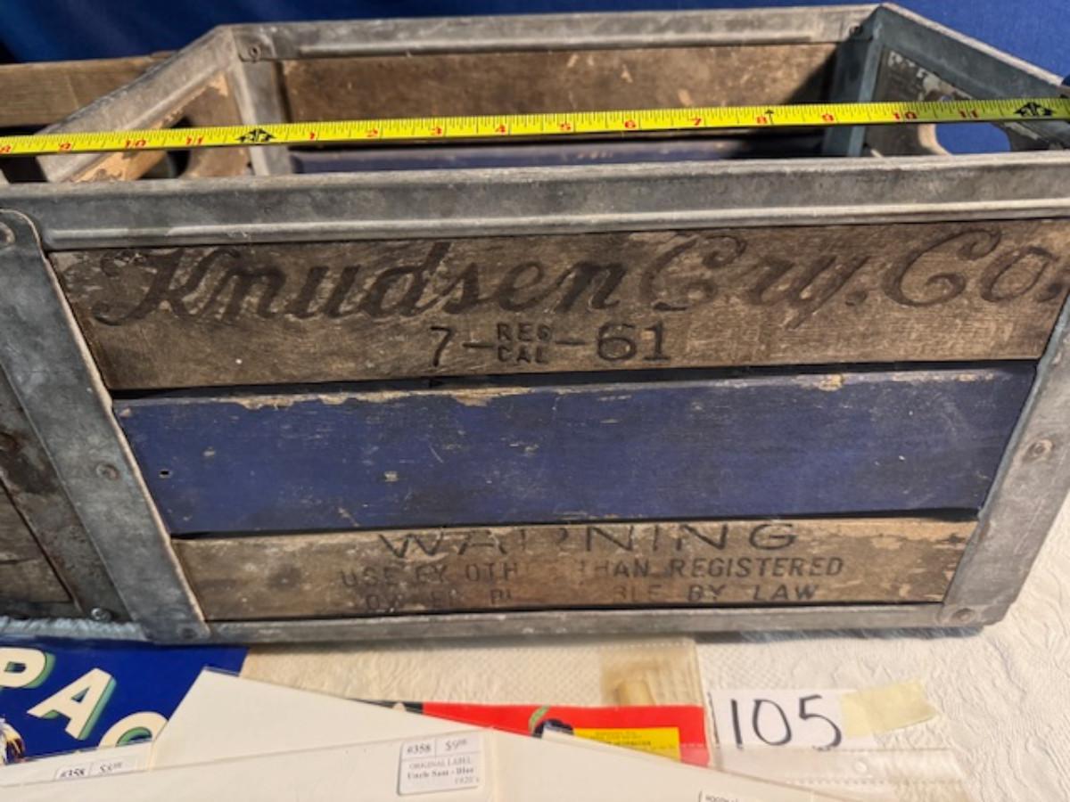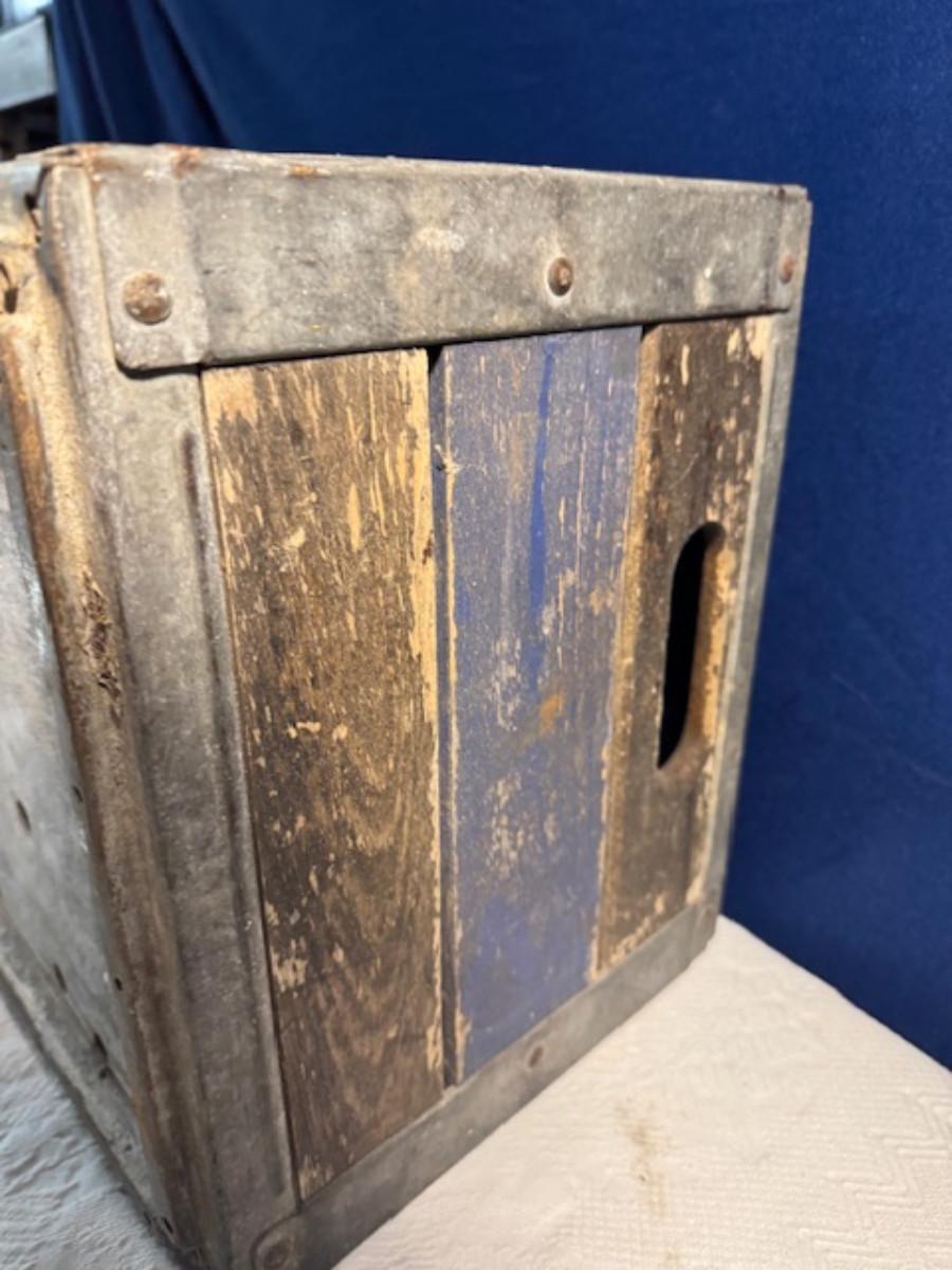 Crate metal and wood Sanitary Dairy Woodland 15" x 12 1/4" x 10", Crate metal and wood 18.5" x 13.5" x 10 1/4". 7 authentic labels (see back of label) new, 12 vintage advertisements as found.