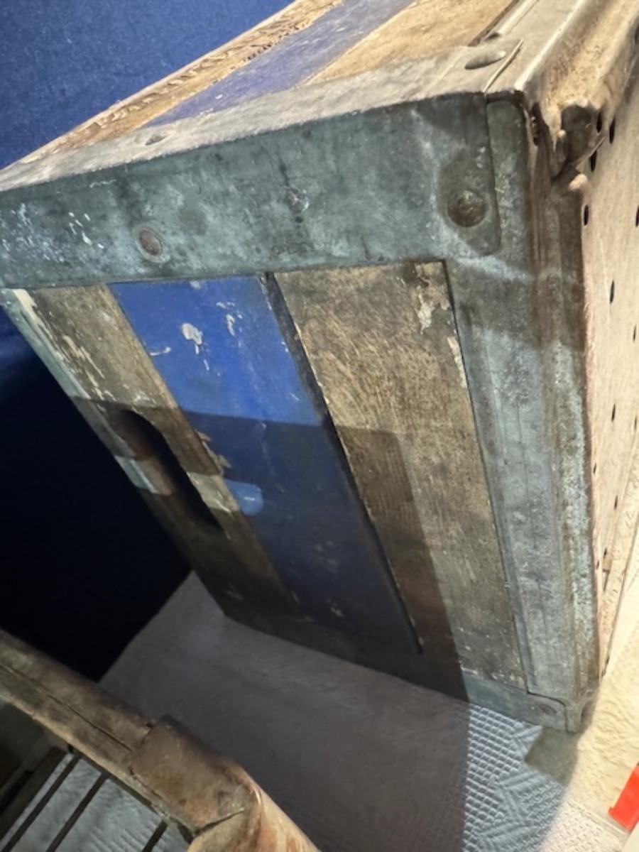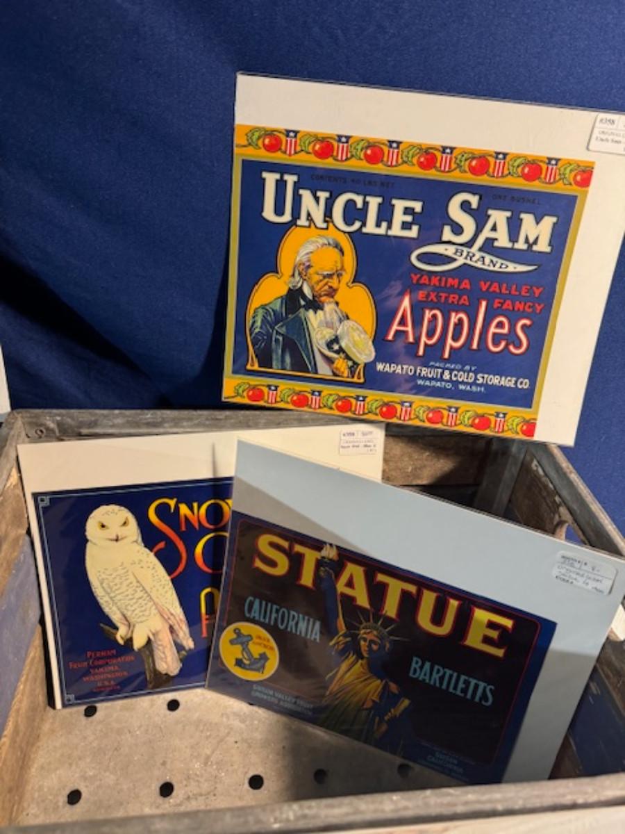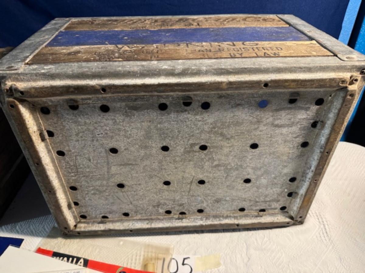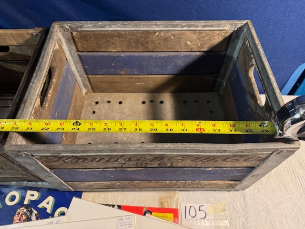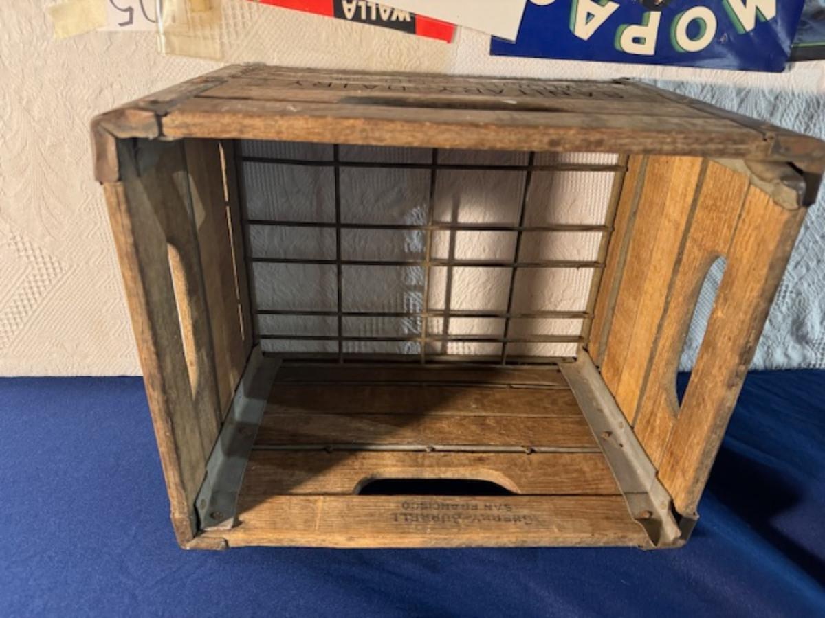 Crate metal and wood Sanitary Dairy Woodland 15" x 12 1/4" x 10", Crate metal and wood 18.5" x 13.5" x 10 1/4". 7 authentic labels (see back of label) new, 12 vintage advertisements as found.