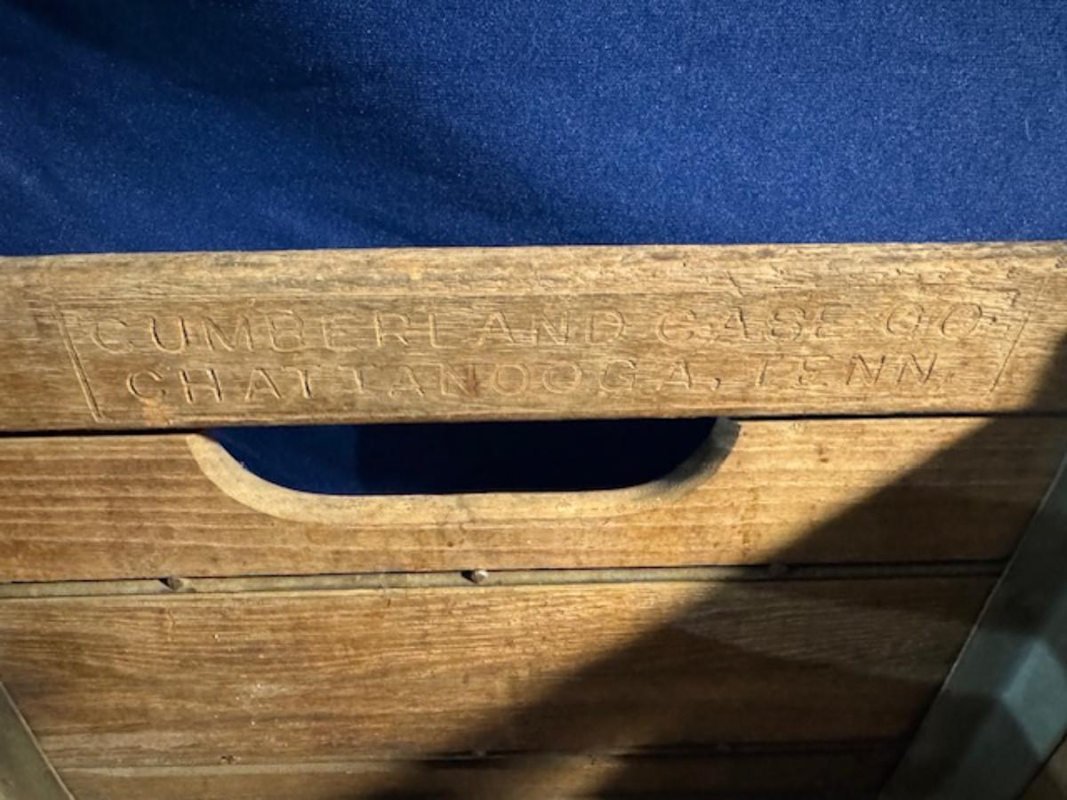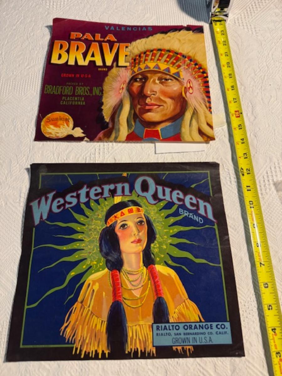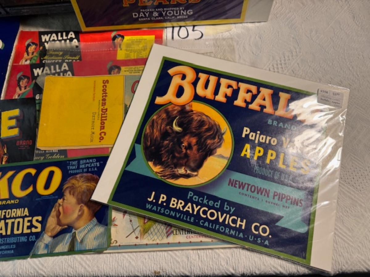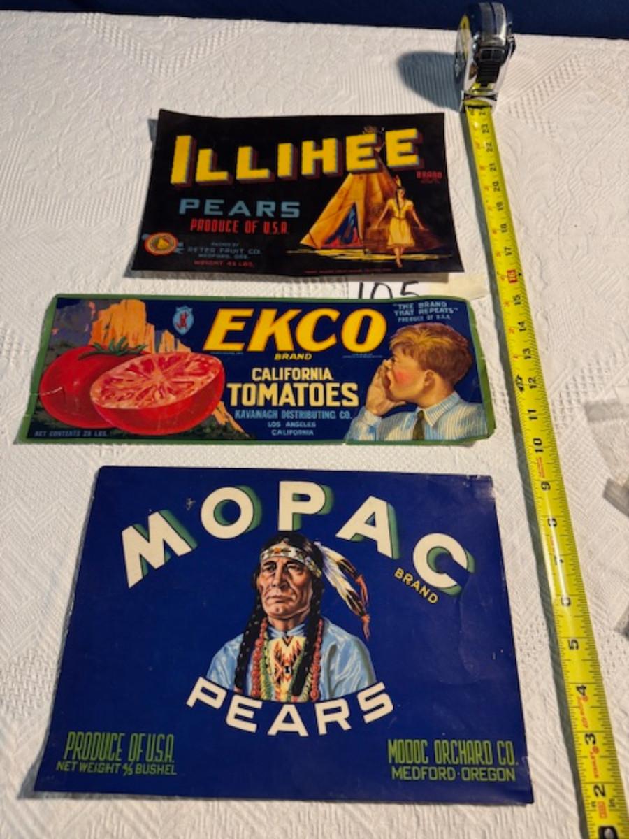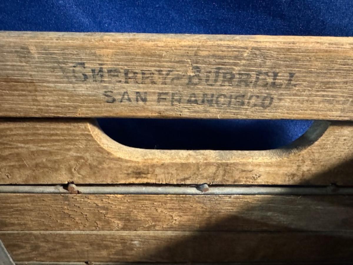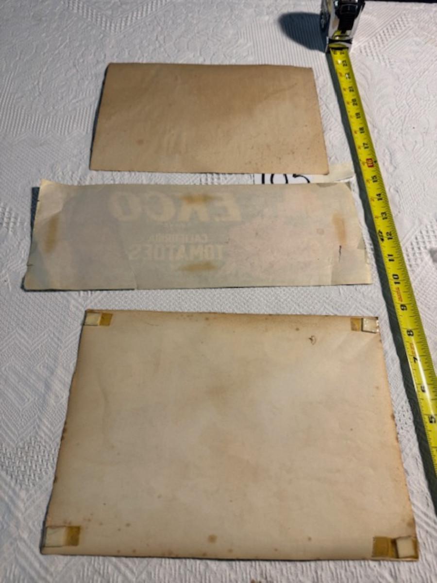 Crate metal and wood Sanitary Dairy Woodland 15" x 12 1/4" x 10", Crate metal and wood 18.5" x 13.5" x 10 1/4". 7 authentic labels (see back of label) new, 12 vintage advertisements as found.