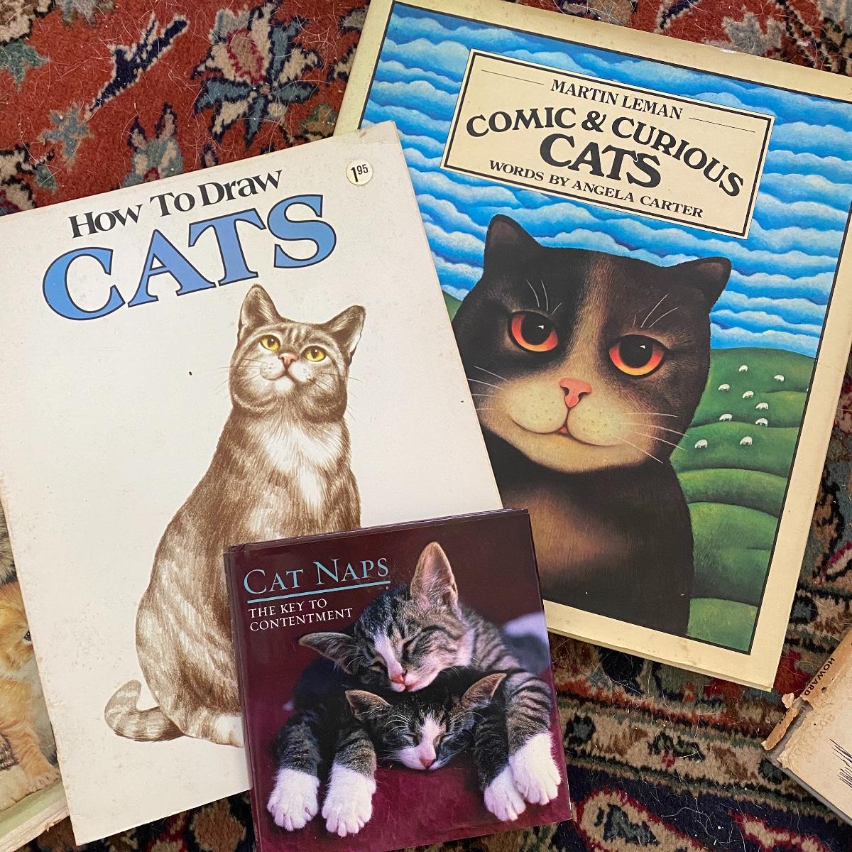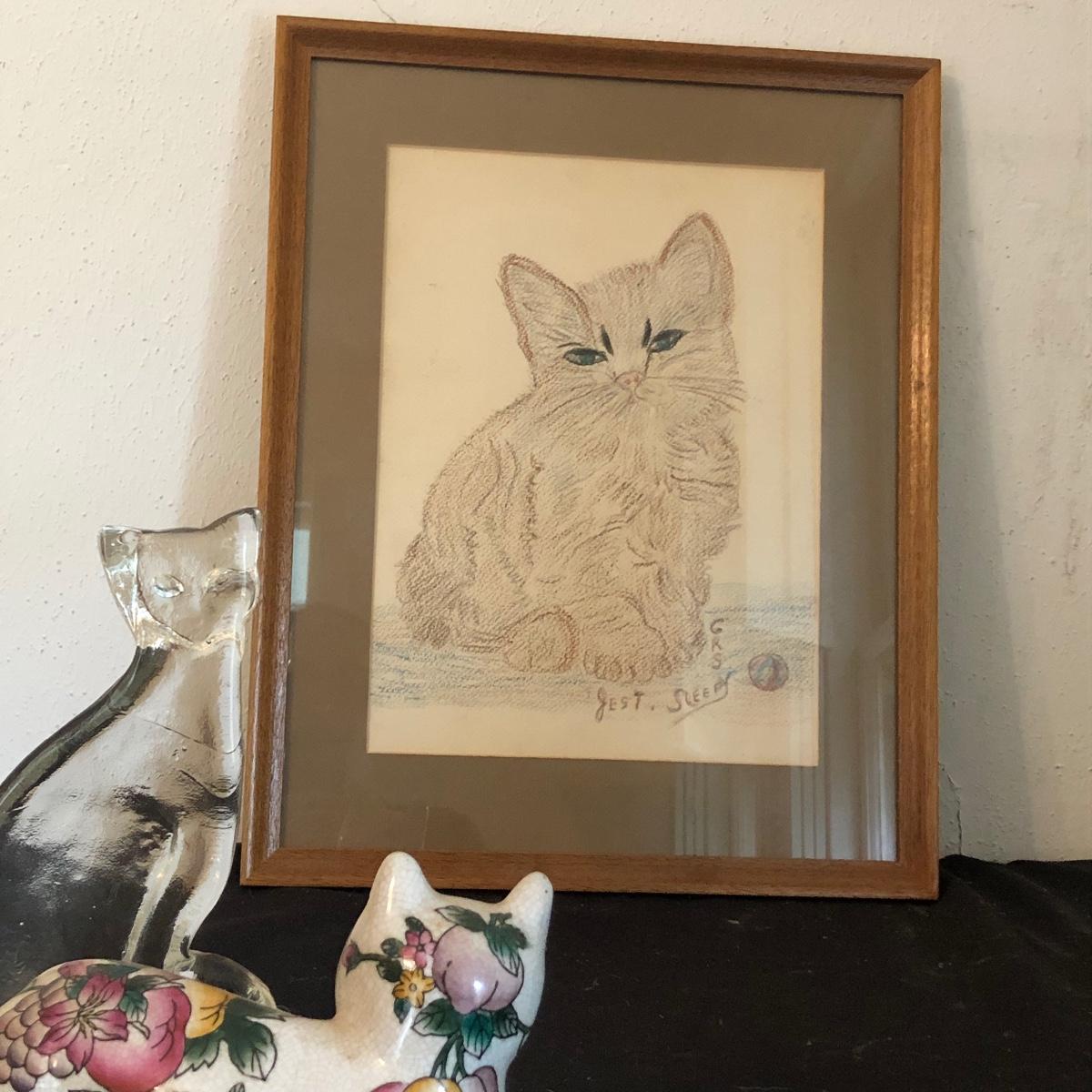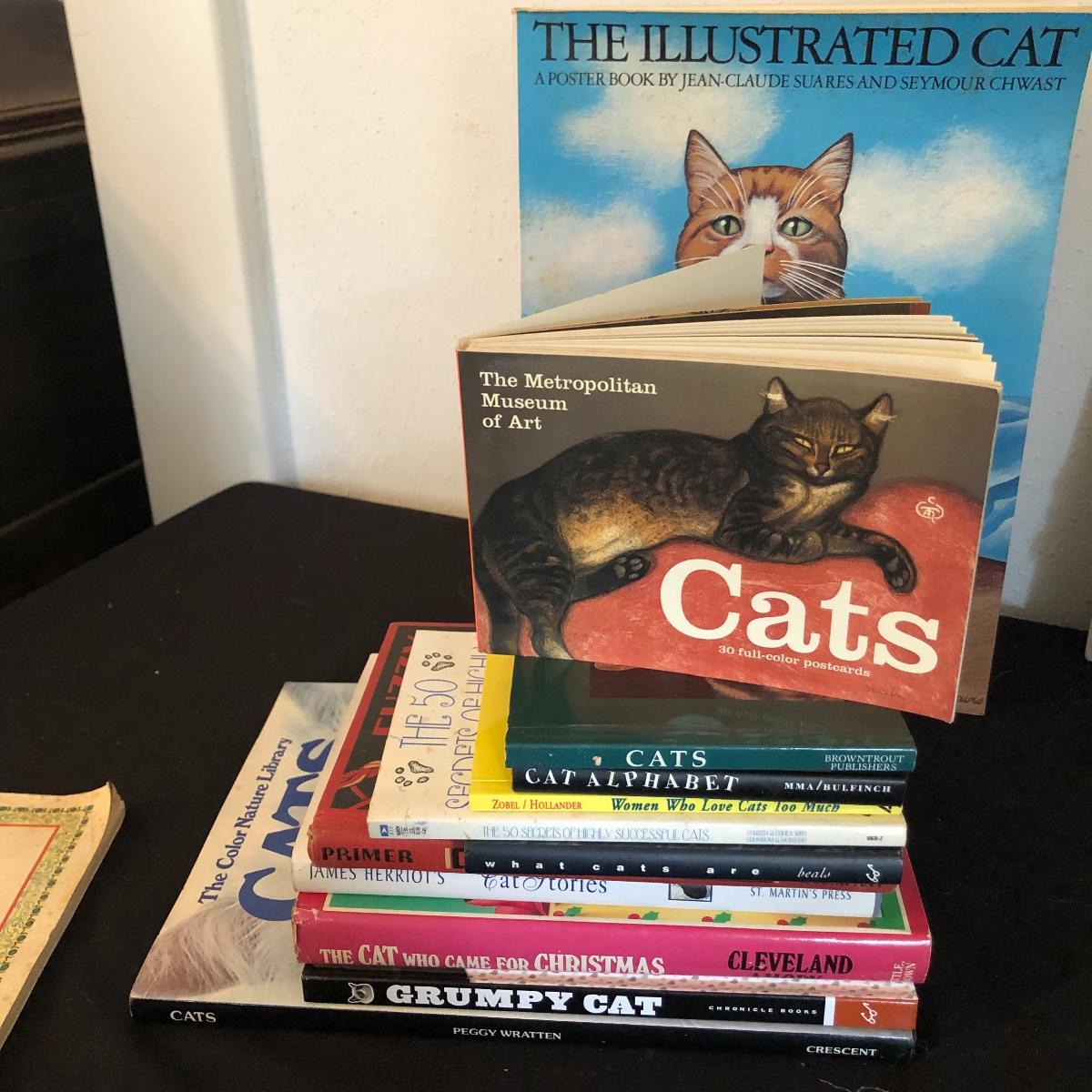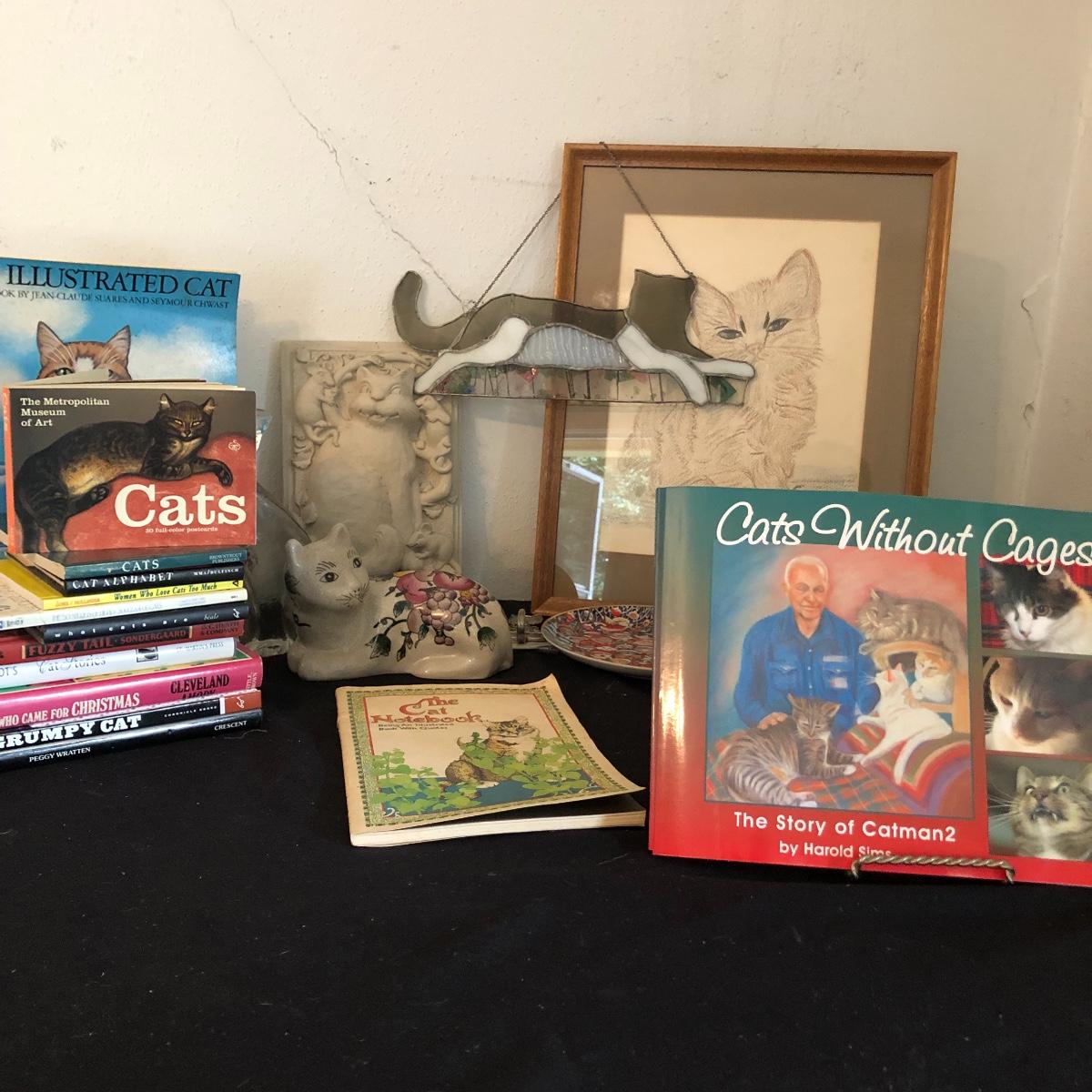 This cat collection has two signed copies of the Story if Catman2 by Harold Sims of Culhowee. Lots of other lovely items in this cat collection, see images. Note both the hanging stained glass like piece and cement piece have cracks, see images.