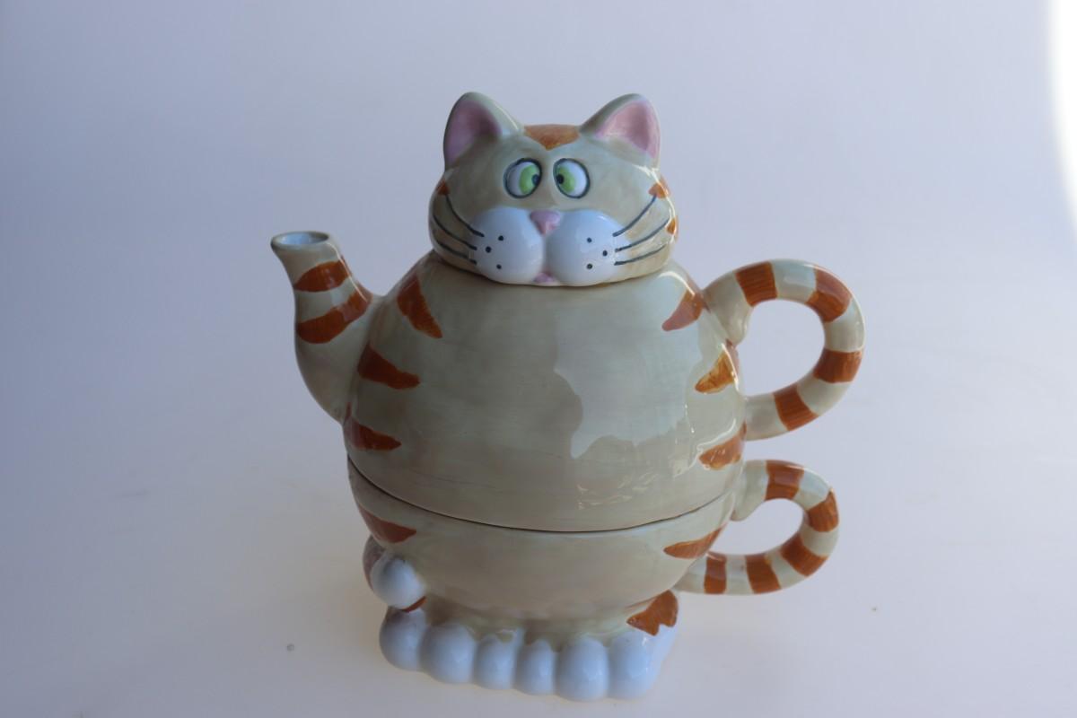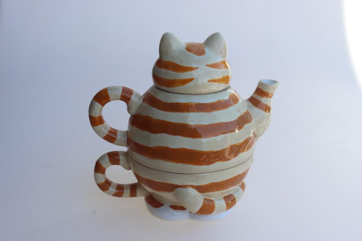A whimsical tea set featuring a playful cat design, perfect for enjoying a cozy tea time for one. The set includes a teapot that nests on top of a matching cup, making it both functional and adorable.