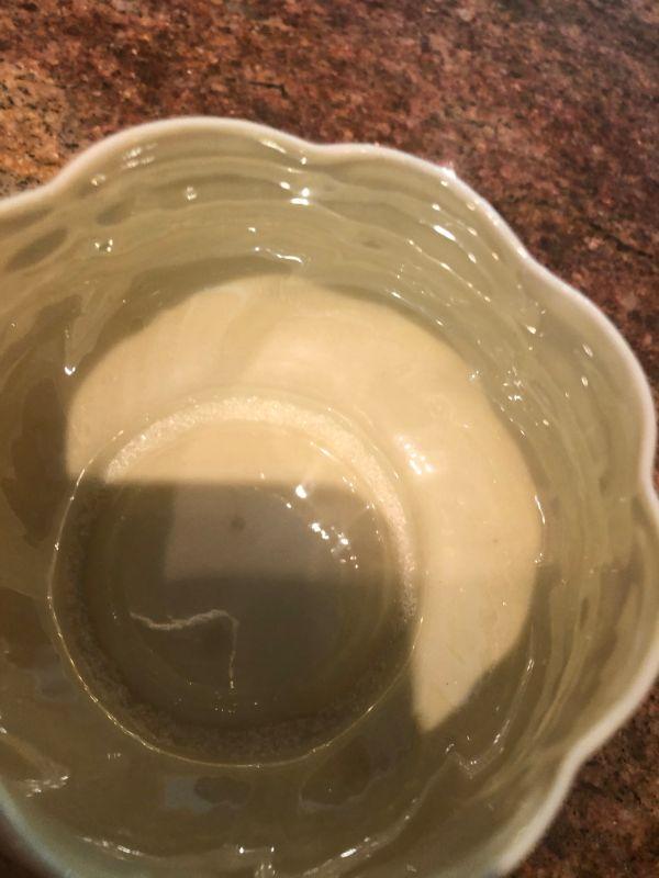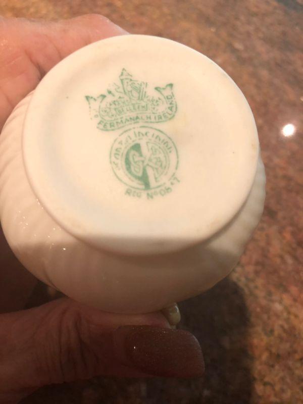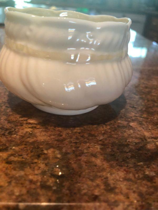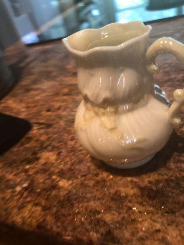 Off white translucent with pale yellow trim. Pitcher 3-1/2" tall and sugar 3" x 2"