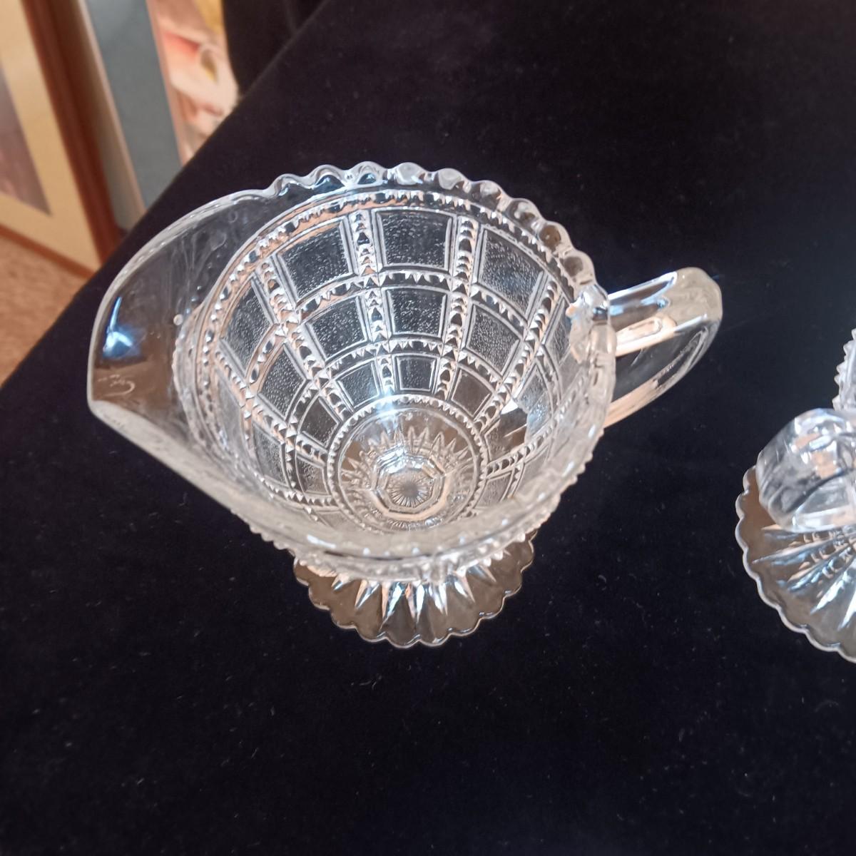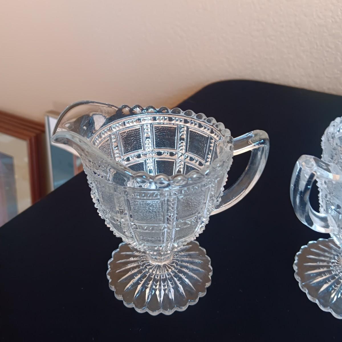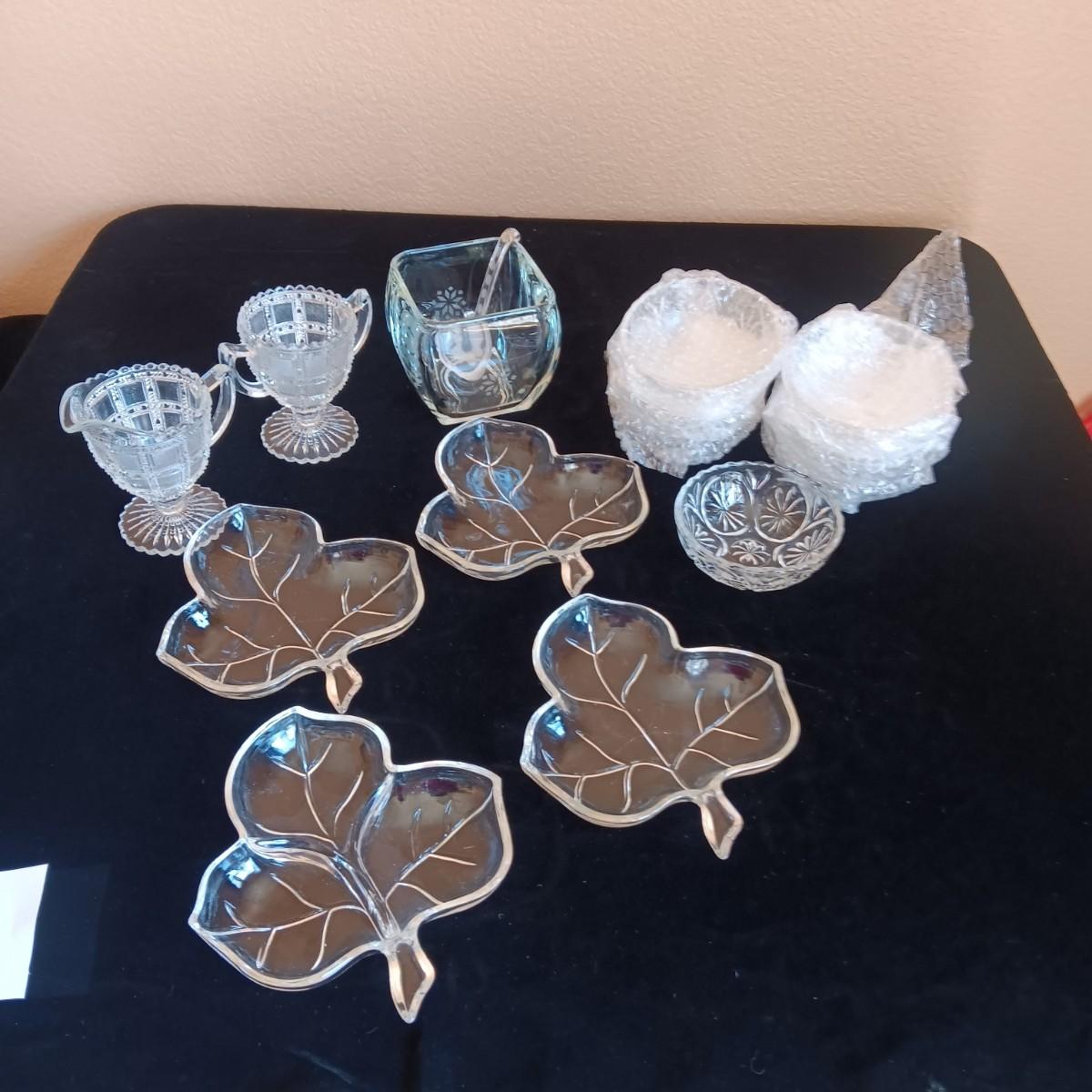CREAM AND SUGAR SET, 7 GLASS BOWLS AND 4 GLASS LEAF PLATES