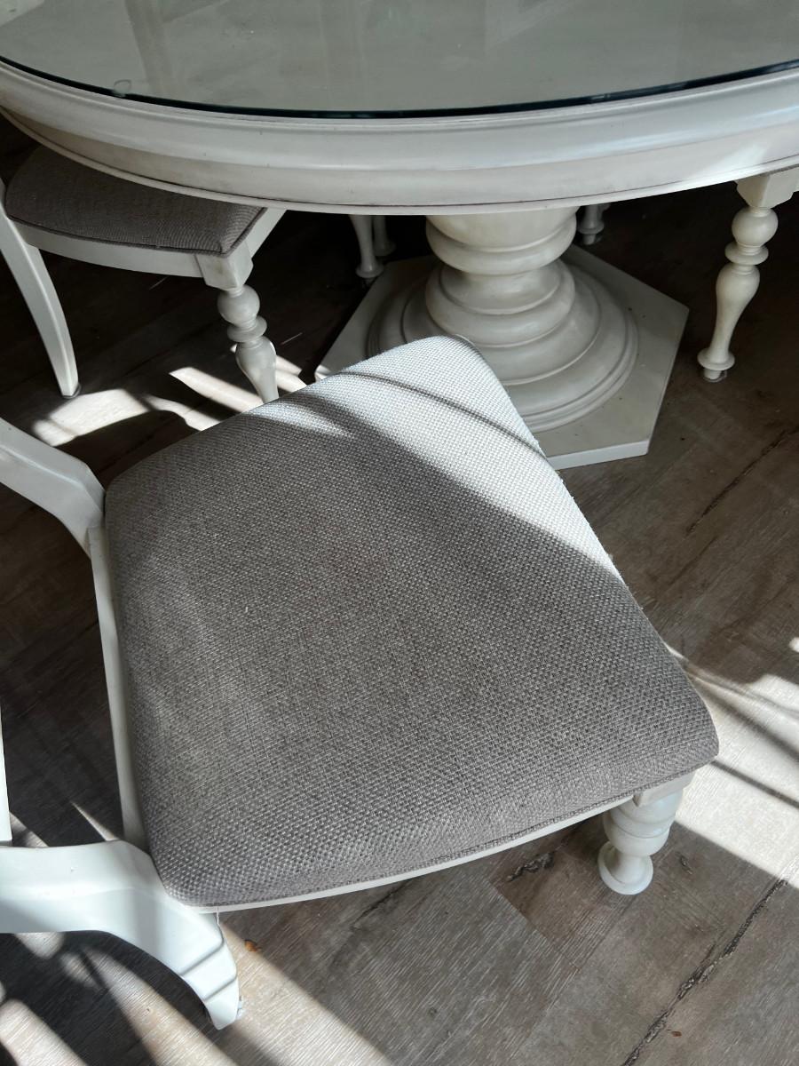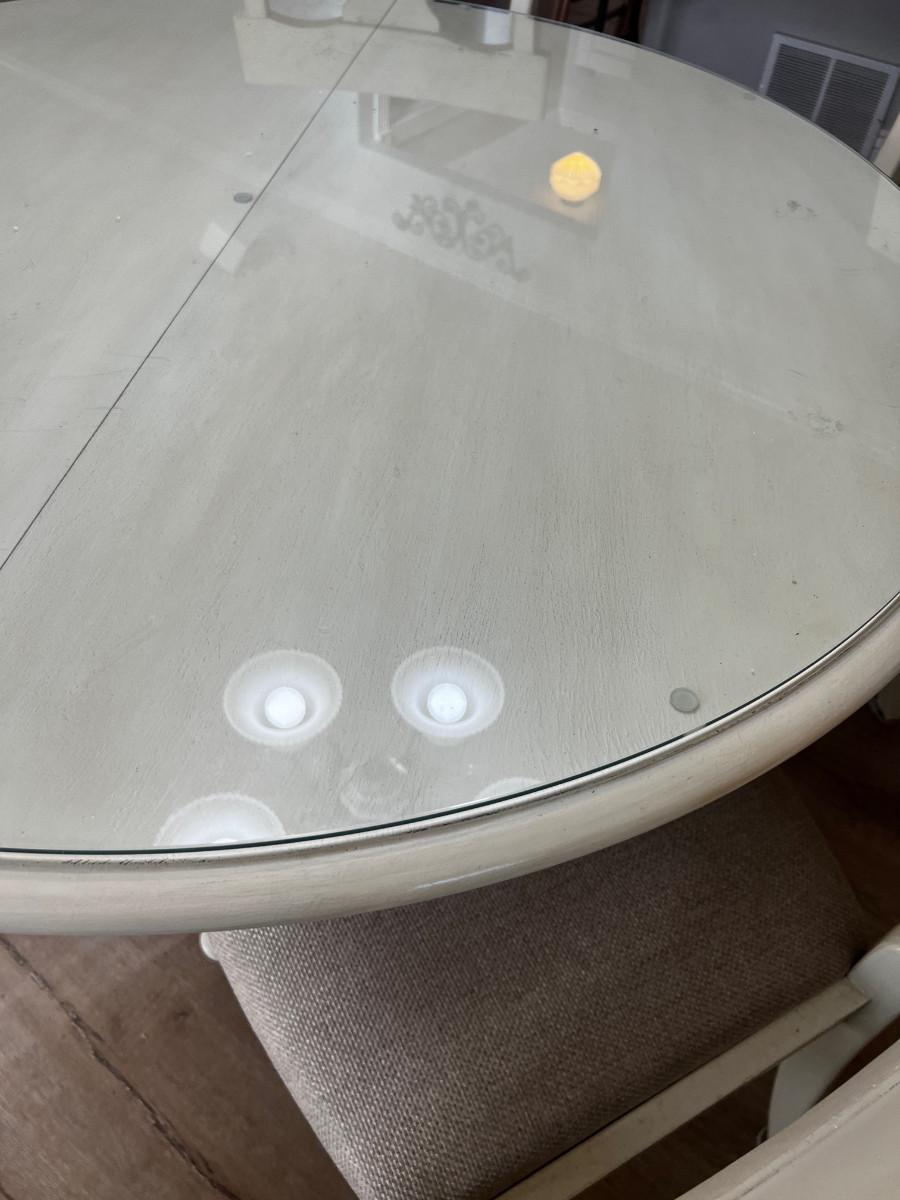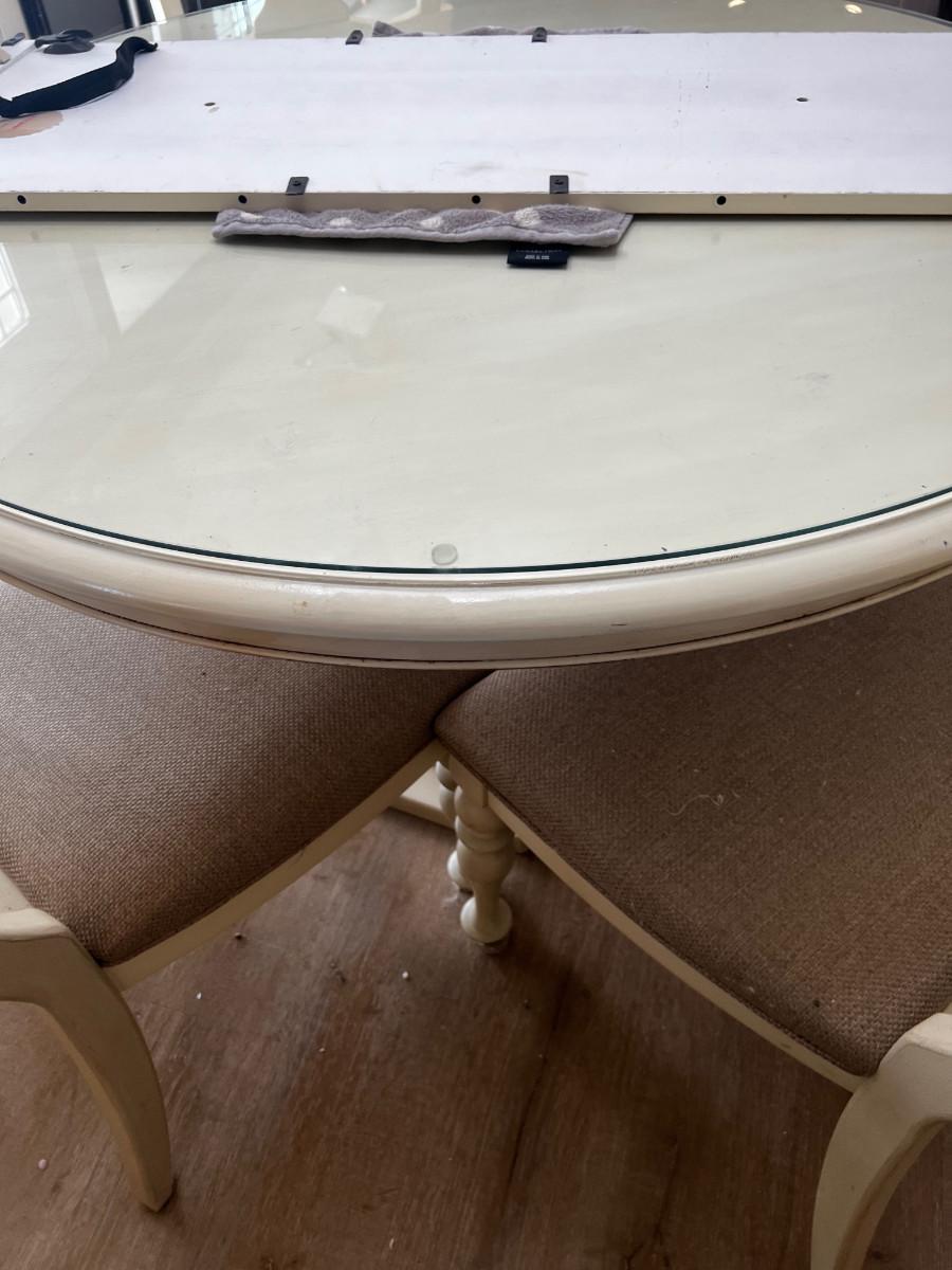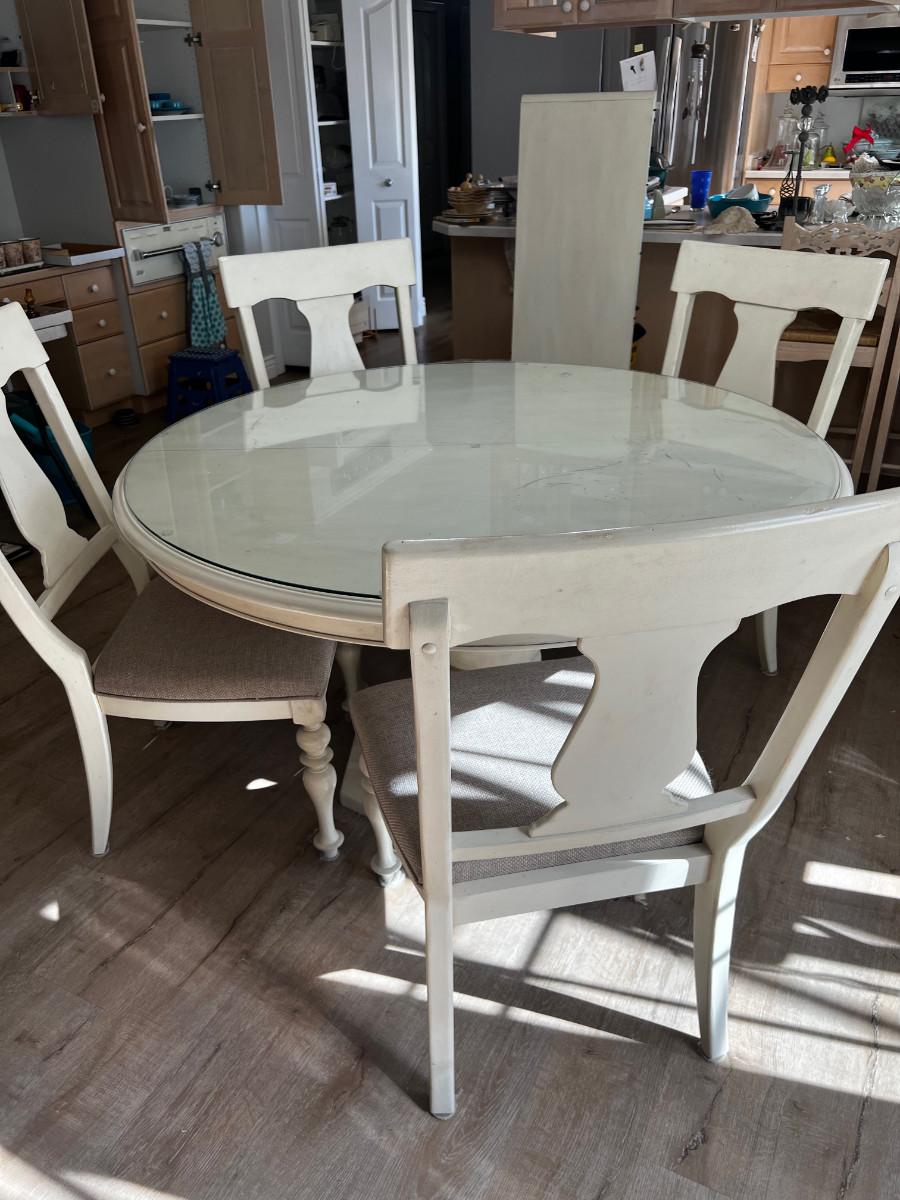 Cream / Bone Colored Round Pedestal Table, Plus Leaf and Glass and 4 dining Chairs, Large