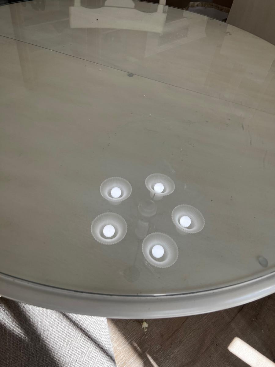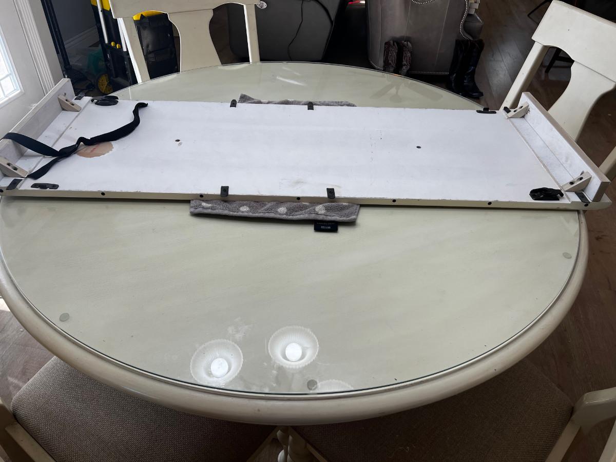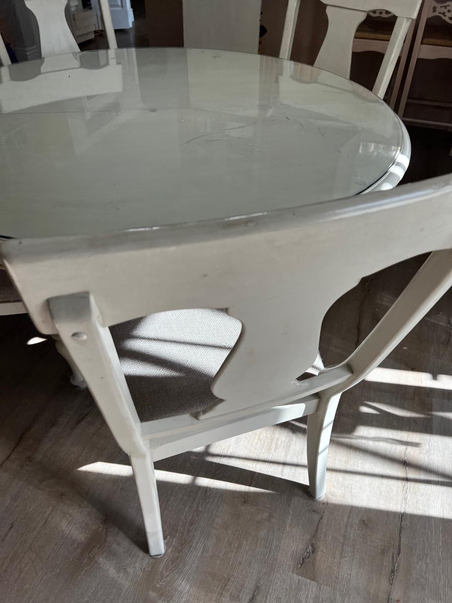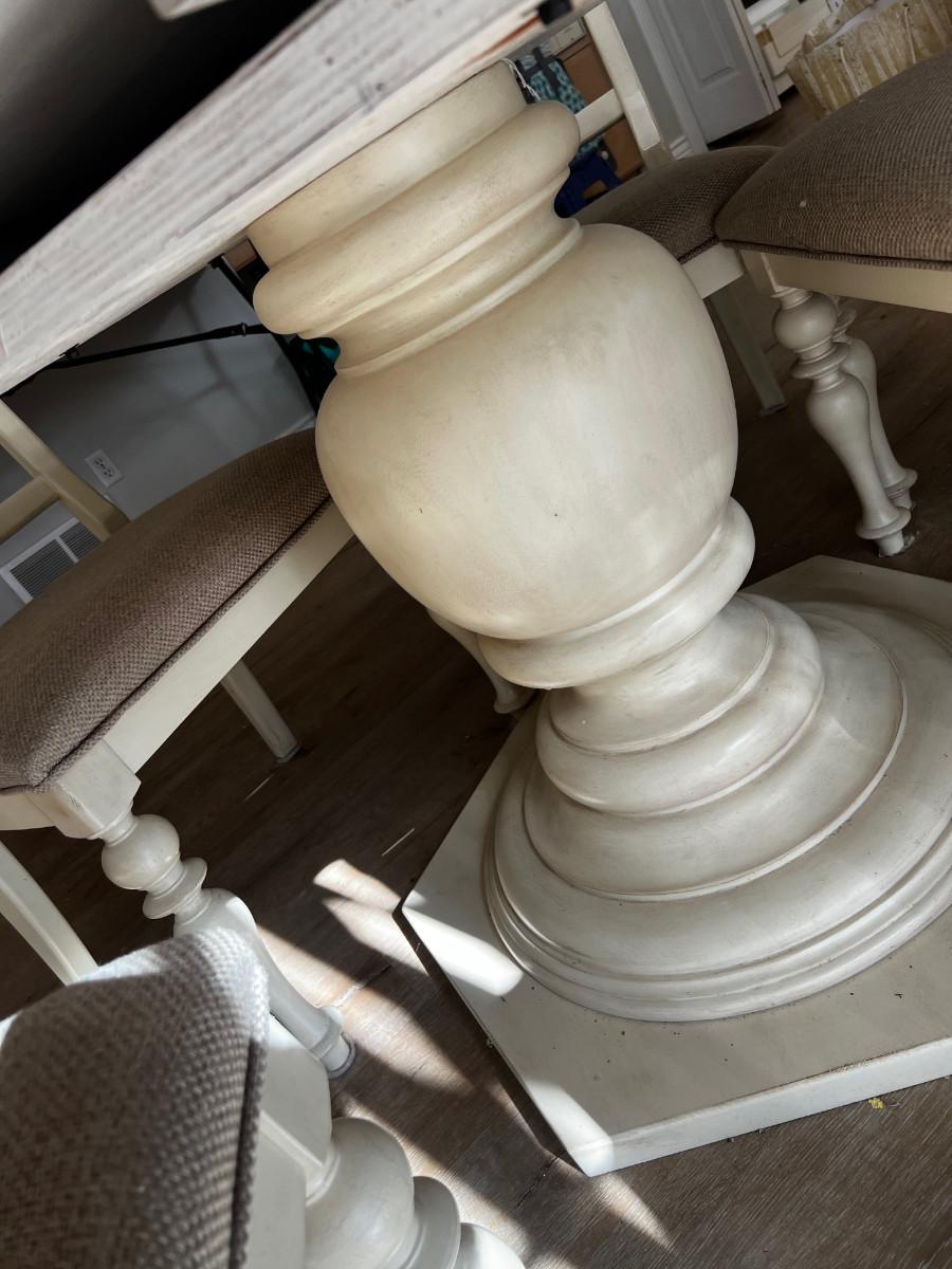 Cream / Bone Colored Round Pedestal Table, Plus Leaf and Glass and 4 dining Chairs, Large