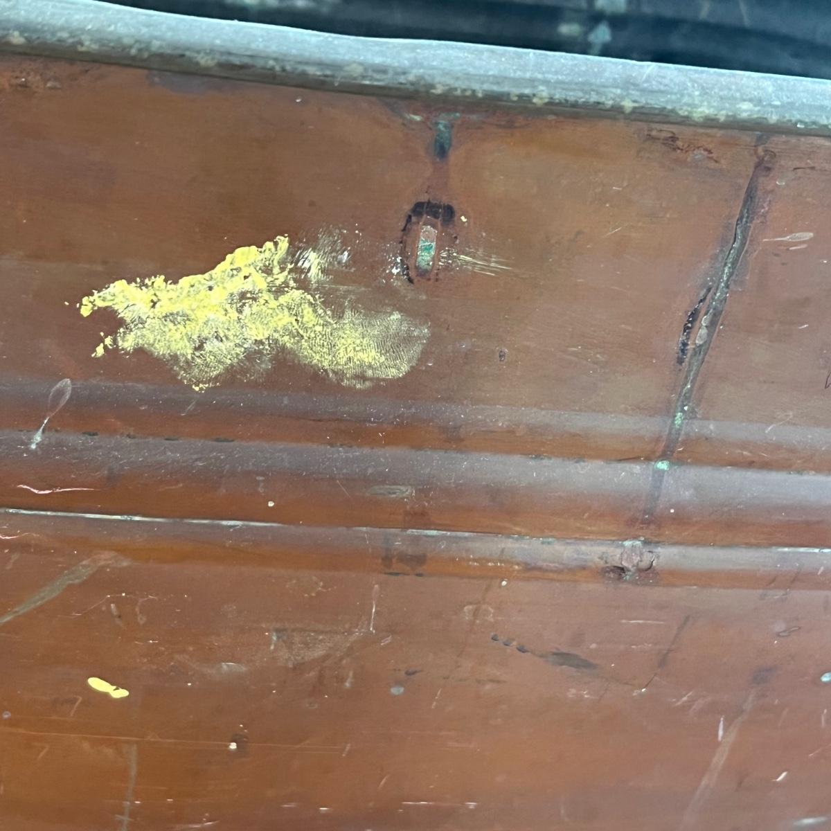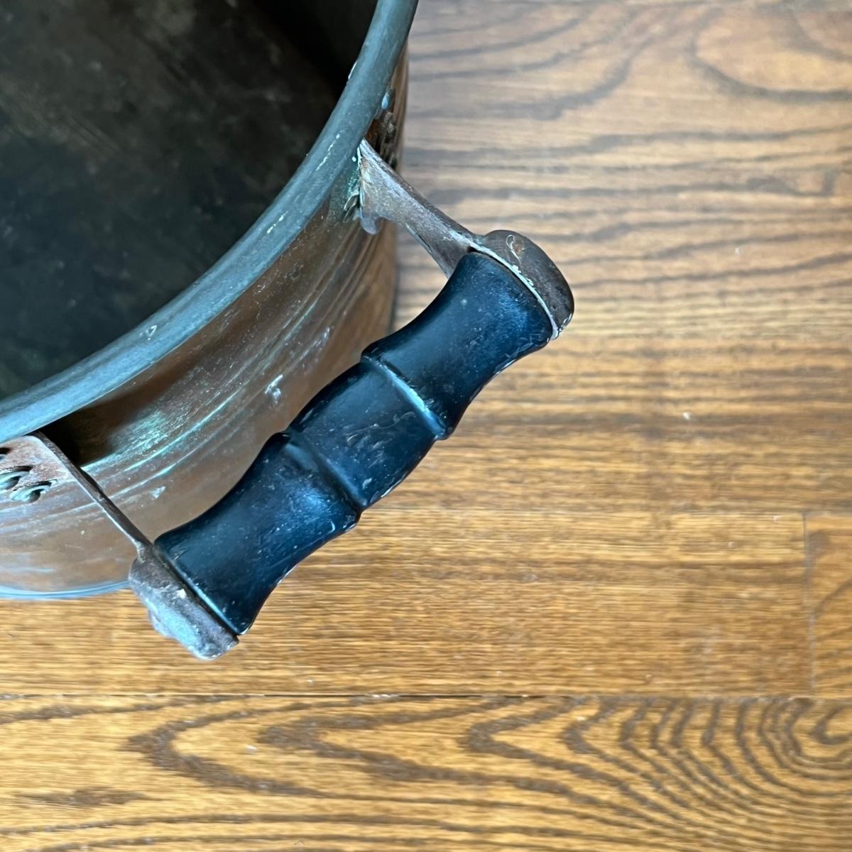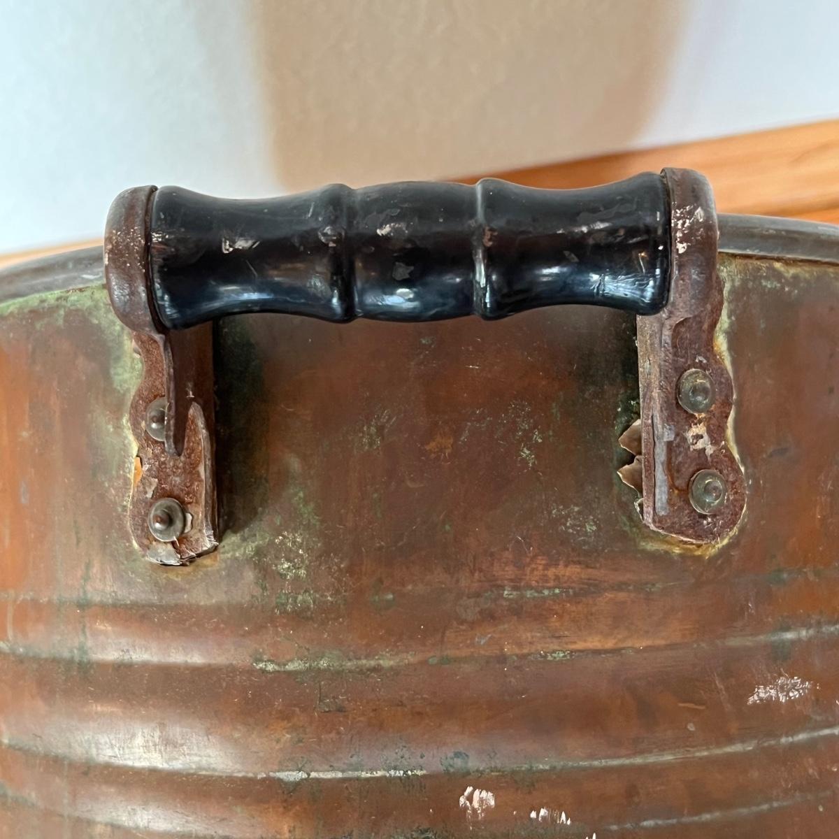 This vintage large copper bucket with painted black wood handles is the perfect size for holding fireplace logs. It measures 12.5” x 23” x 13”. It is in good condition for its age but does have medium and a small yellow spots which appears to be paint and may be removable. However, these stains do add to its vintage charm.