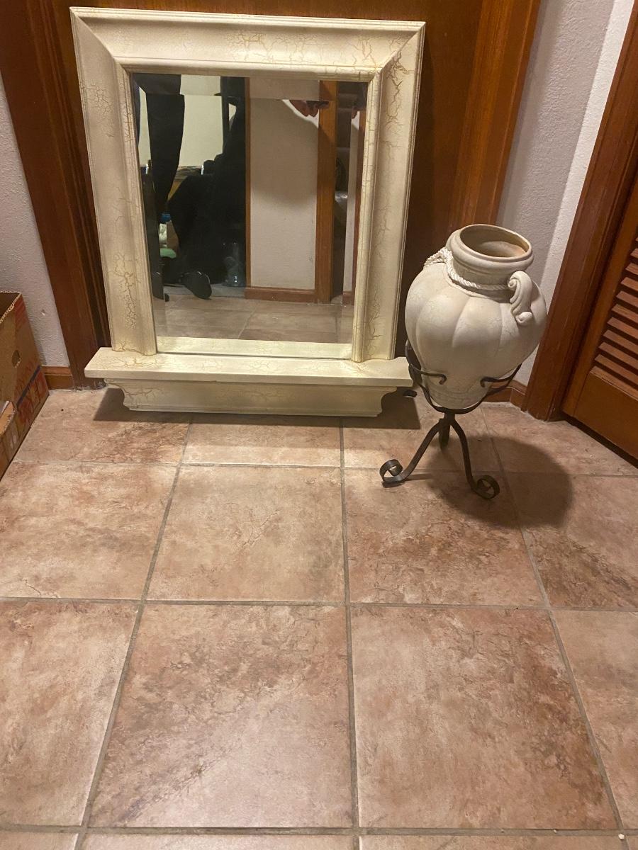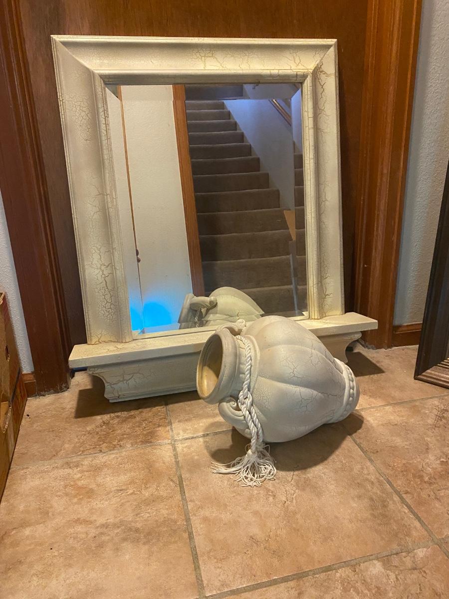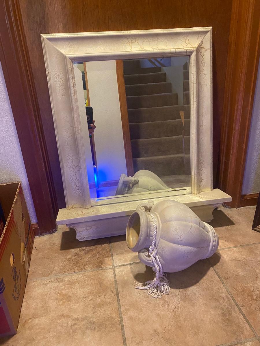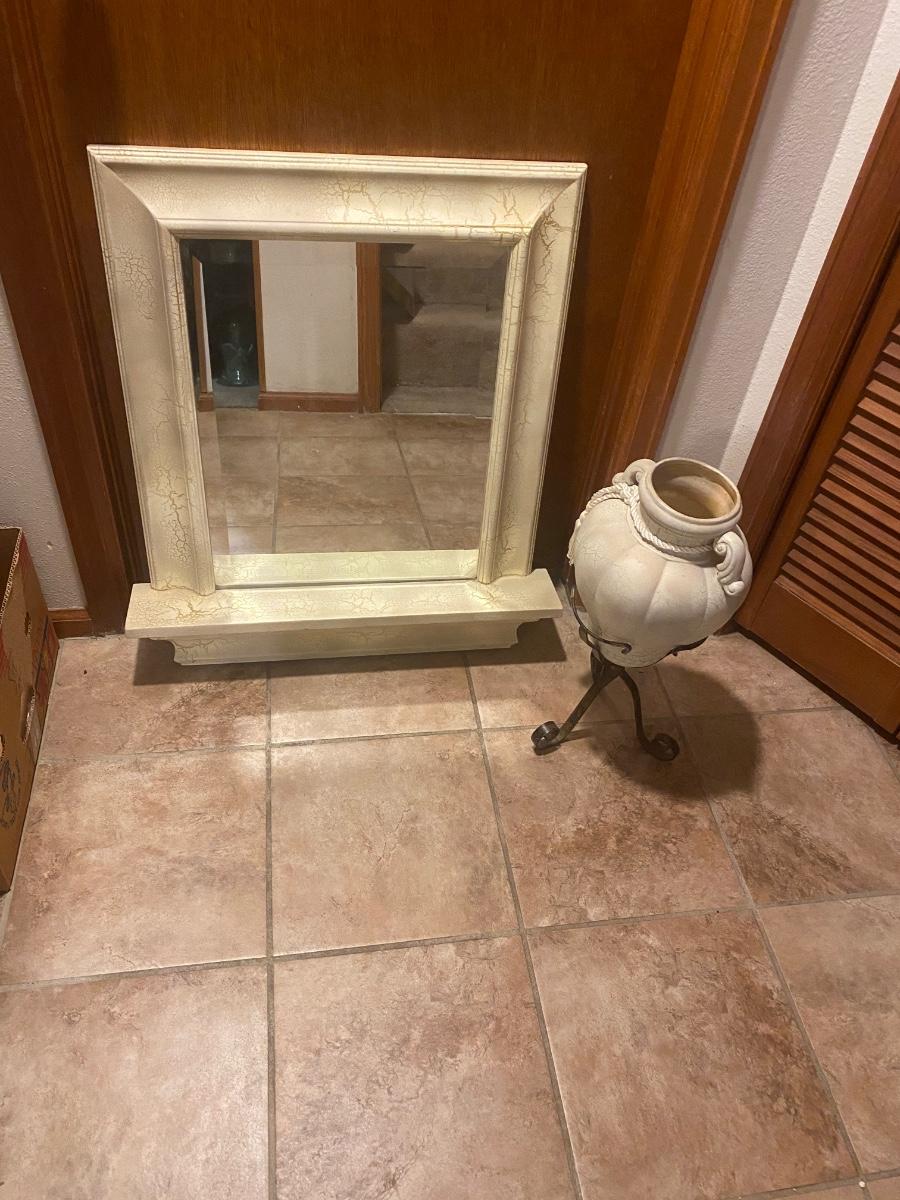 CREAM COLORED ANTIQUED MIRROR AND POT