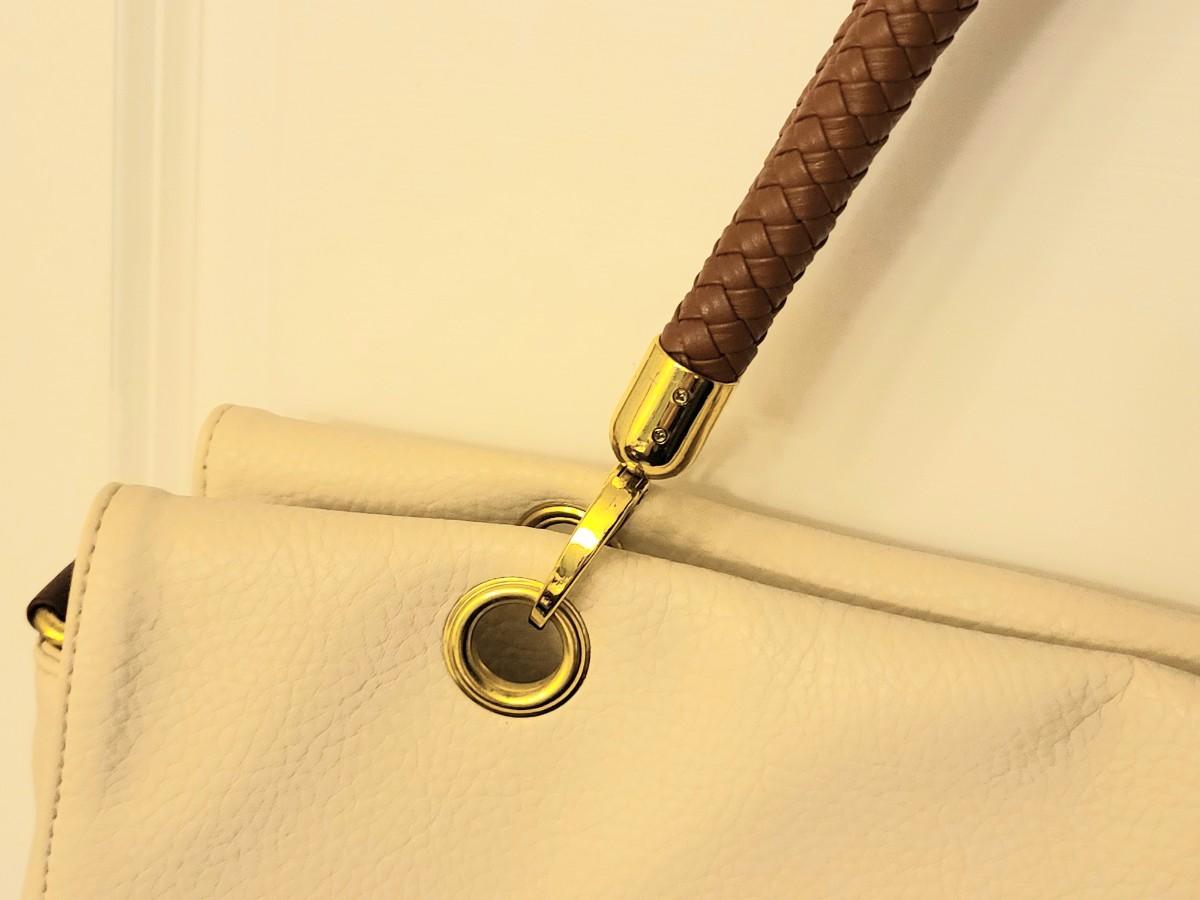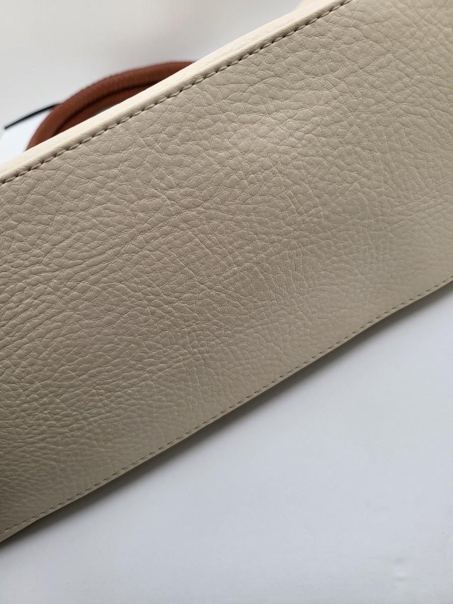 Double braided brown hand straps (removable), long crossbody strap, adjustable & removable. Faux leather shell. Roomy interior. Measures 16" long x 10.5" tall x 4.75" deep.