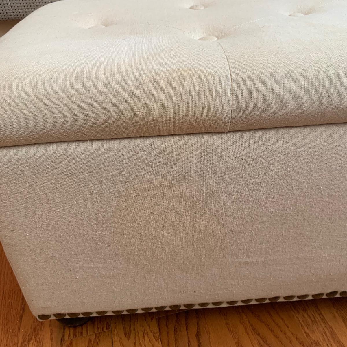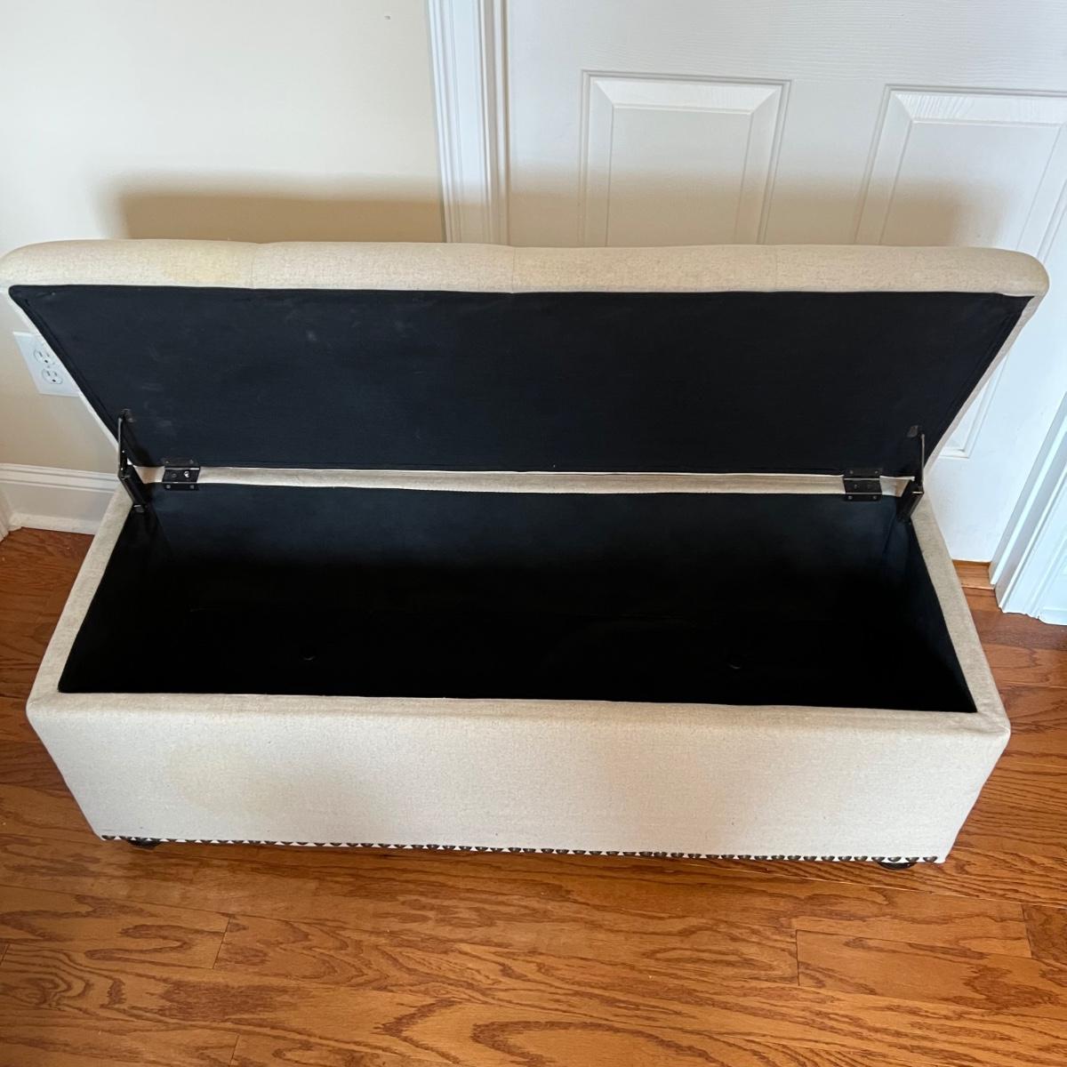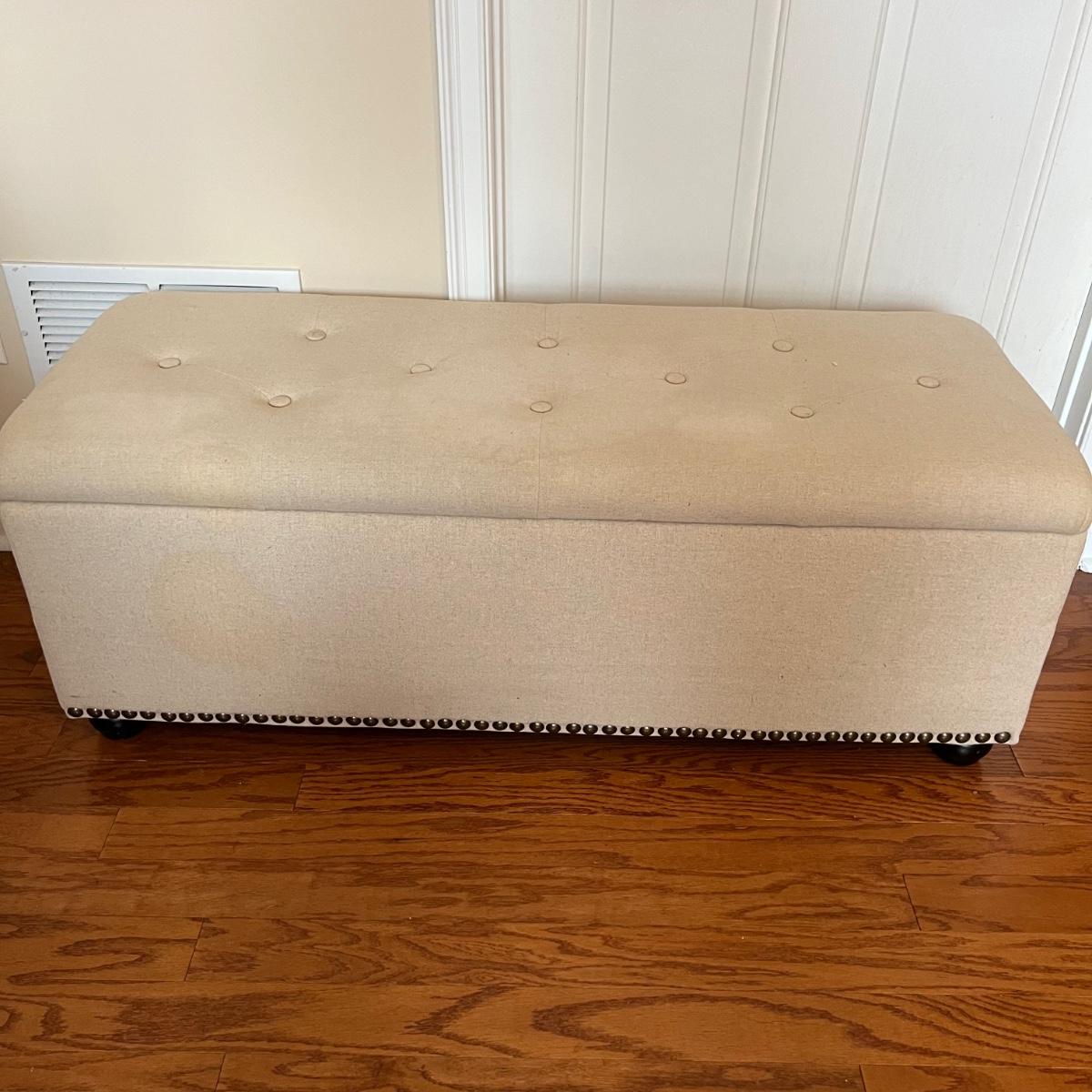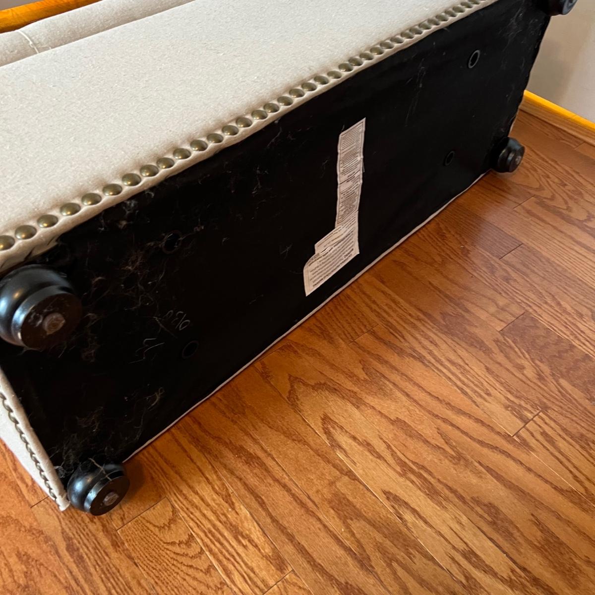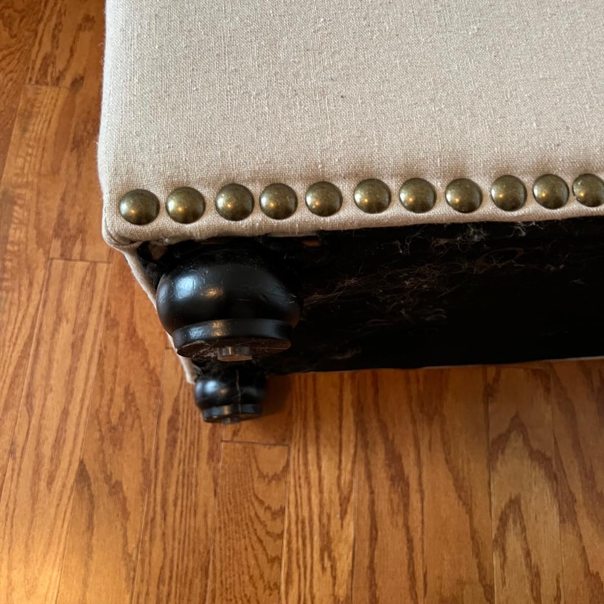 Cream fabric storage bench accented with rivets and dark brown ball feet. The bench measures 46” x 17.5” x 17.5”H. There is some staining on the exterior fabric that we are uncertain if it is cleanable or not.