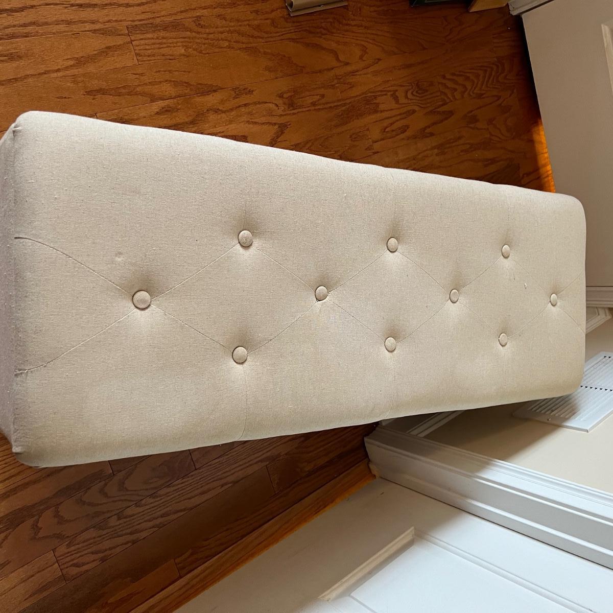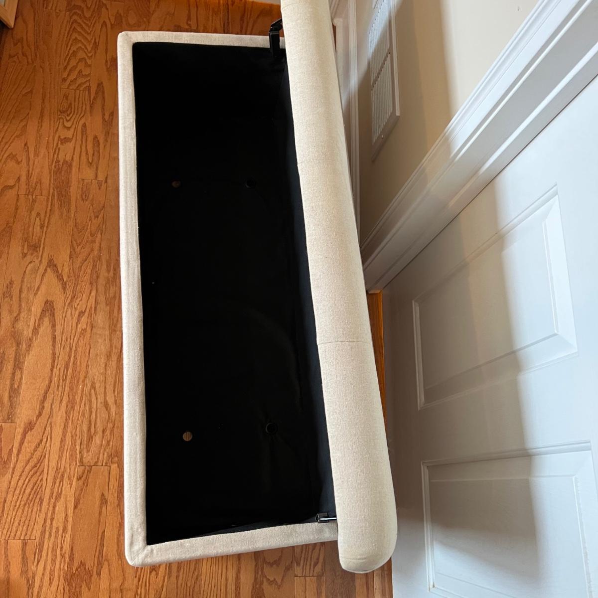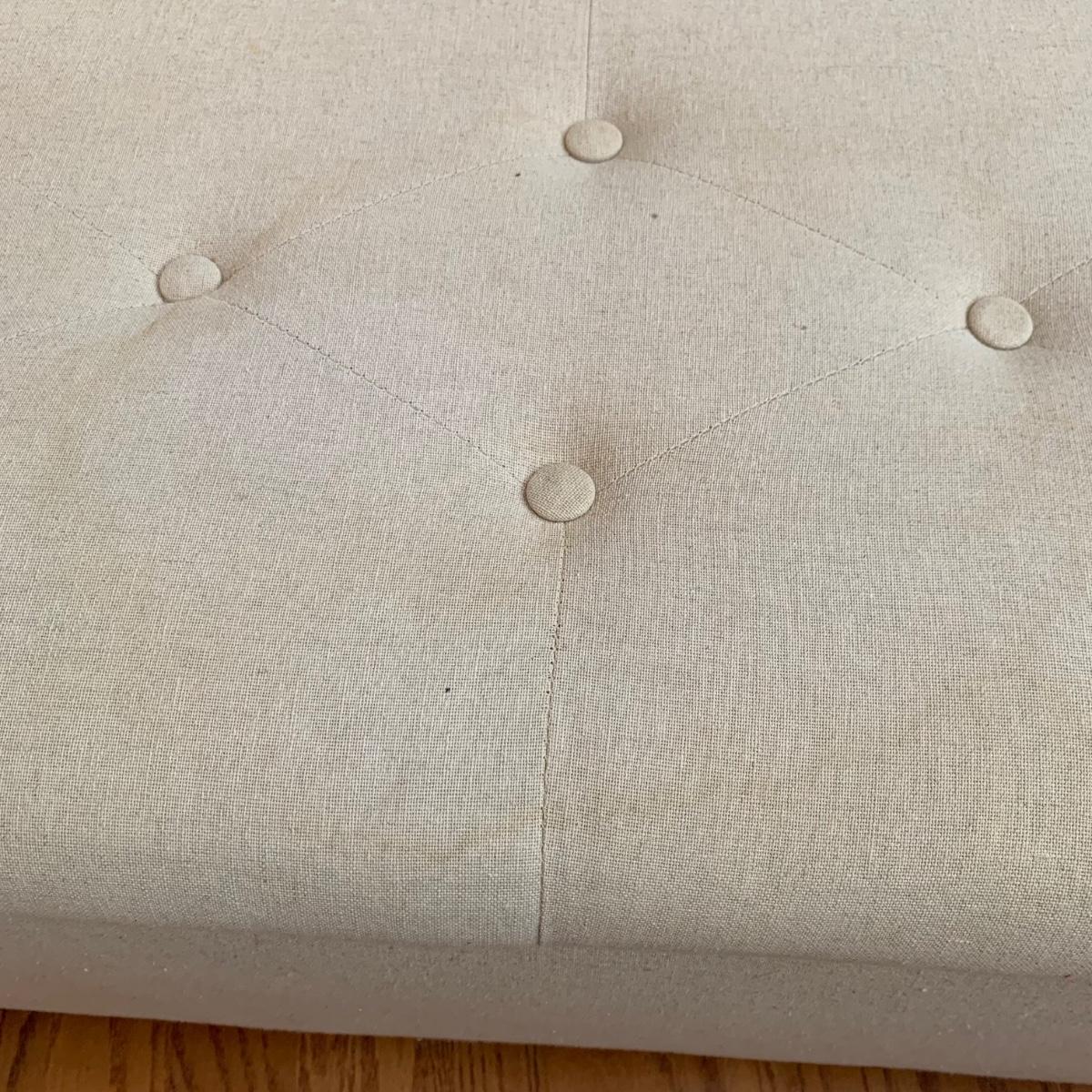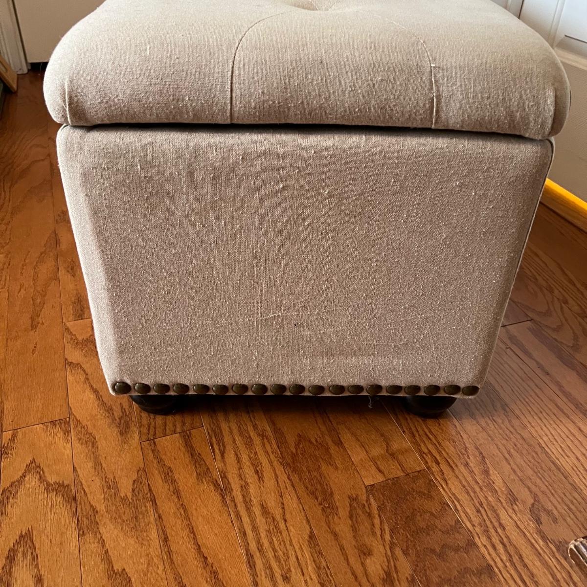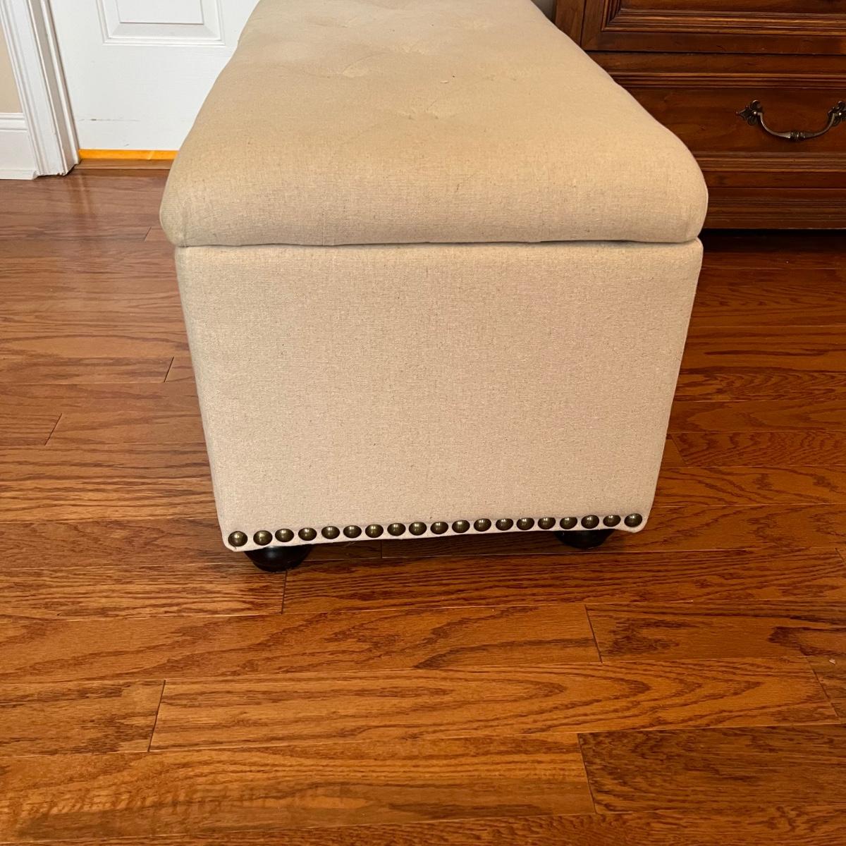 Cream fabric storage bench accented with rivets and dark brown ball feet. The bench measures 46” x 17.5” x 17.5”H. There is some staining on the exterior fabric that we are uncertain if it is cleanable or not.