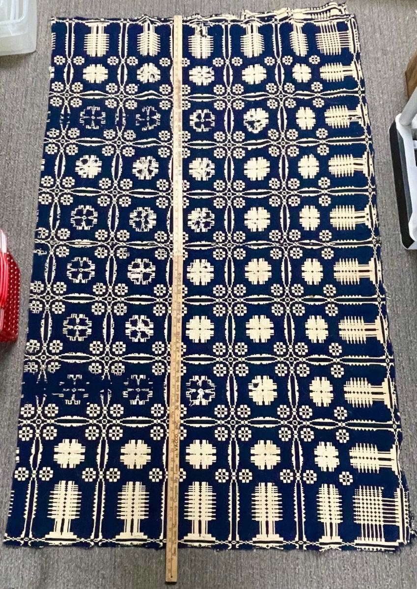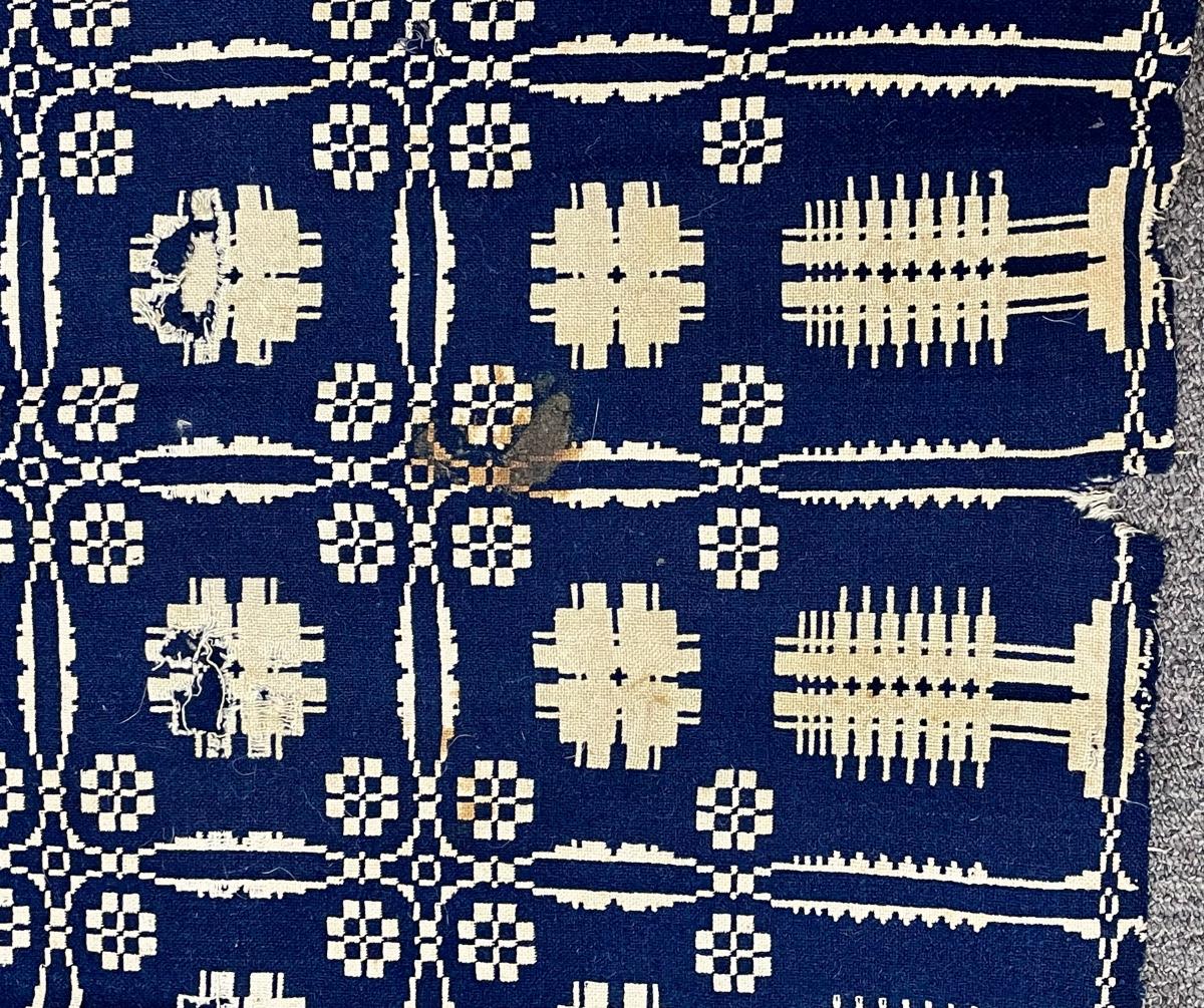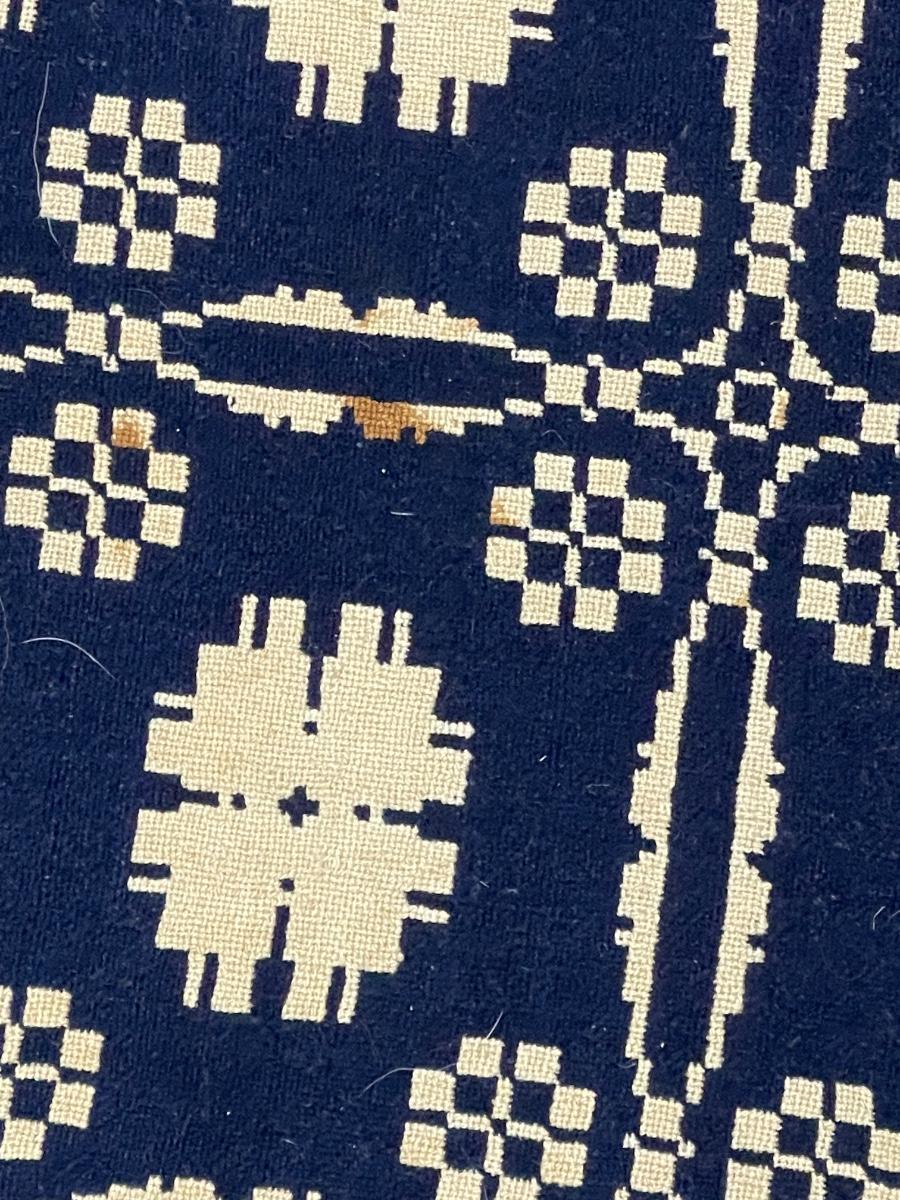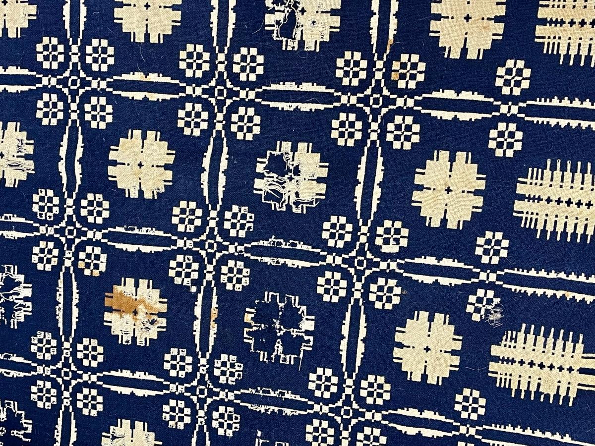 Antique Cream & Navy Wool Heavy Woven Blanket Coverlet