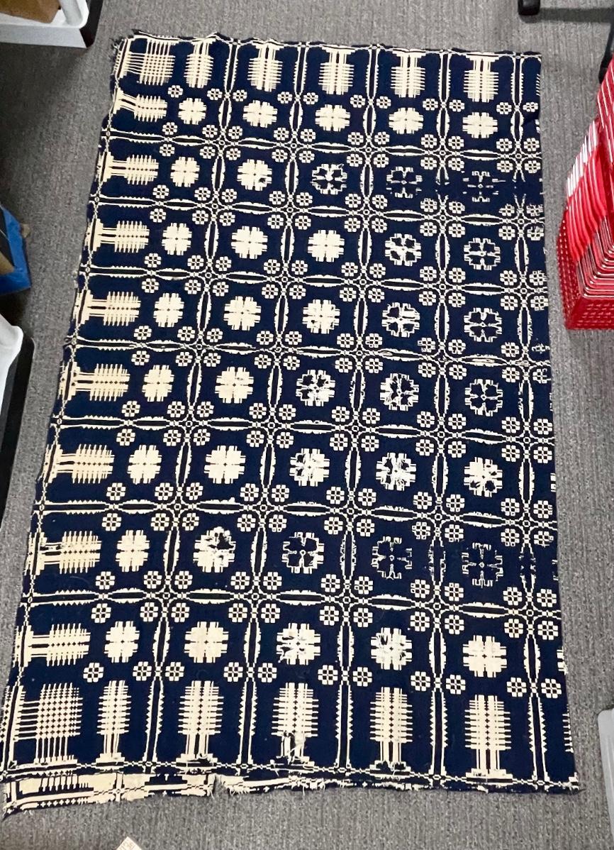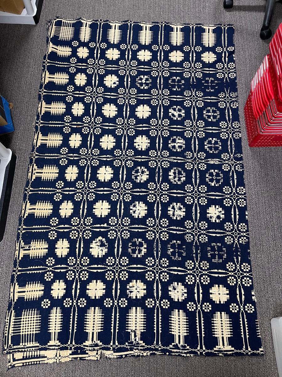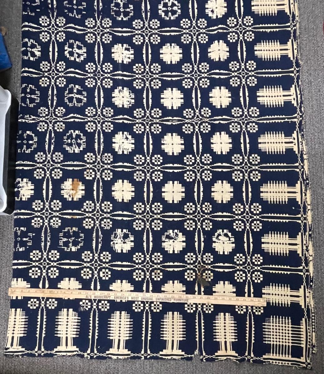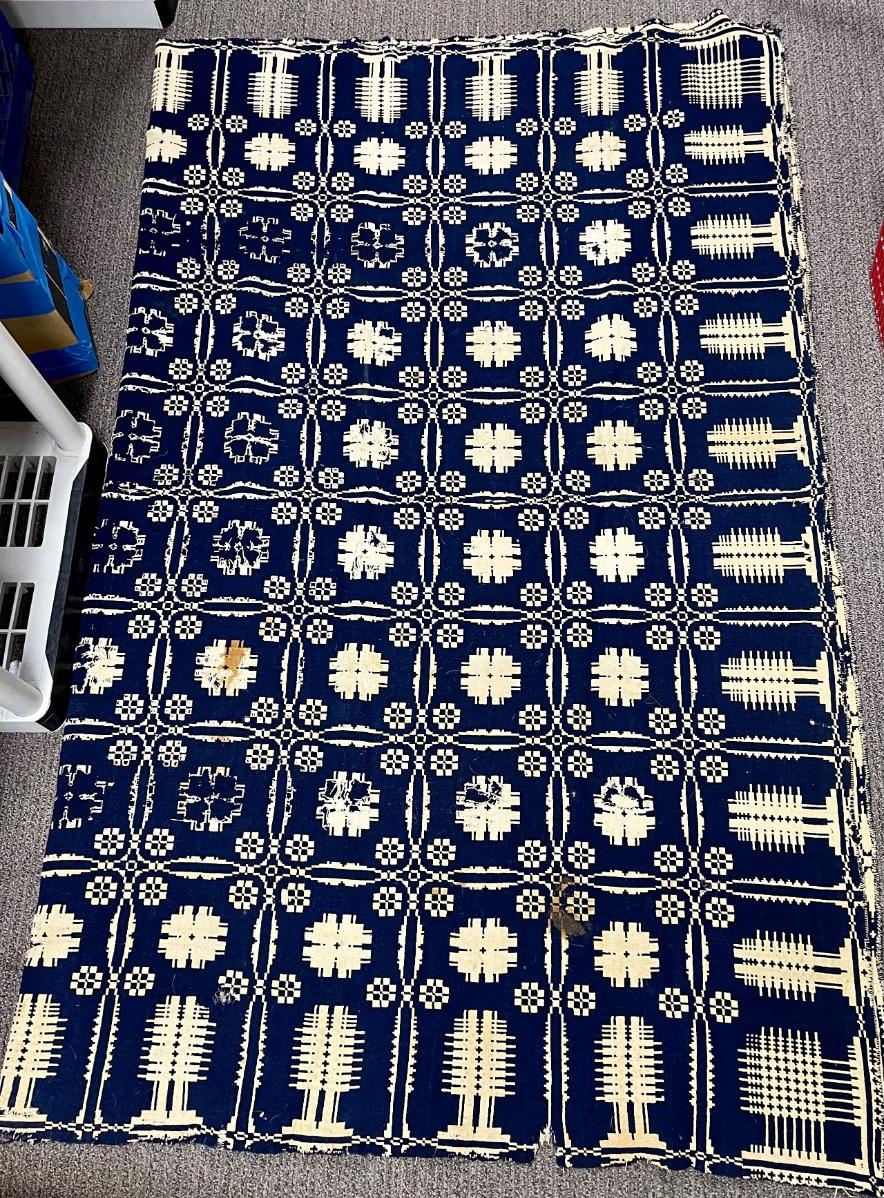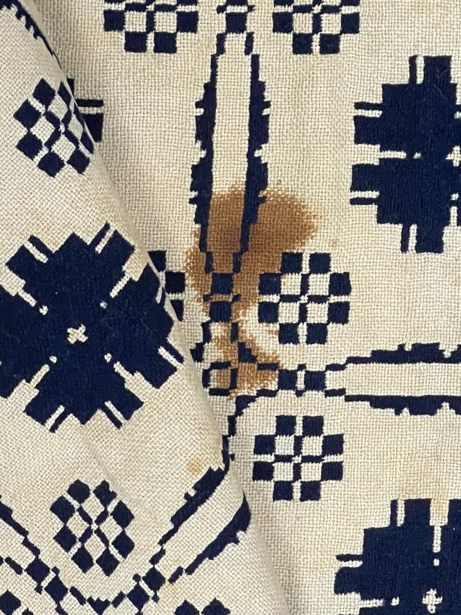 Antique Cream & Navy Wool Heavy Woven Blanket Coverlet