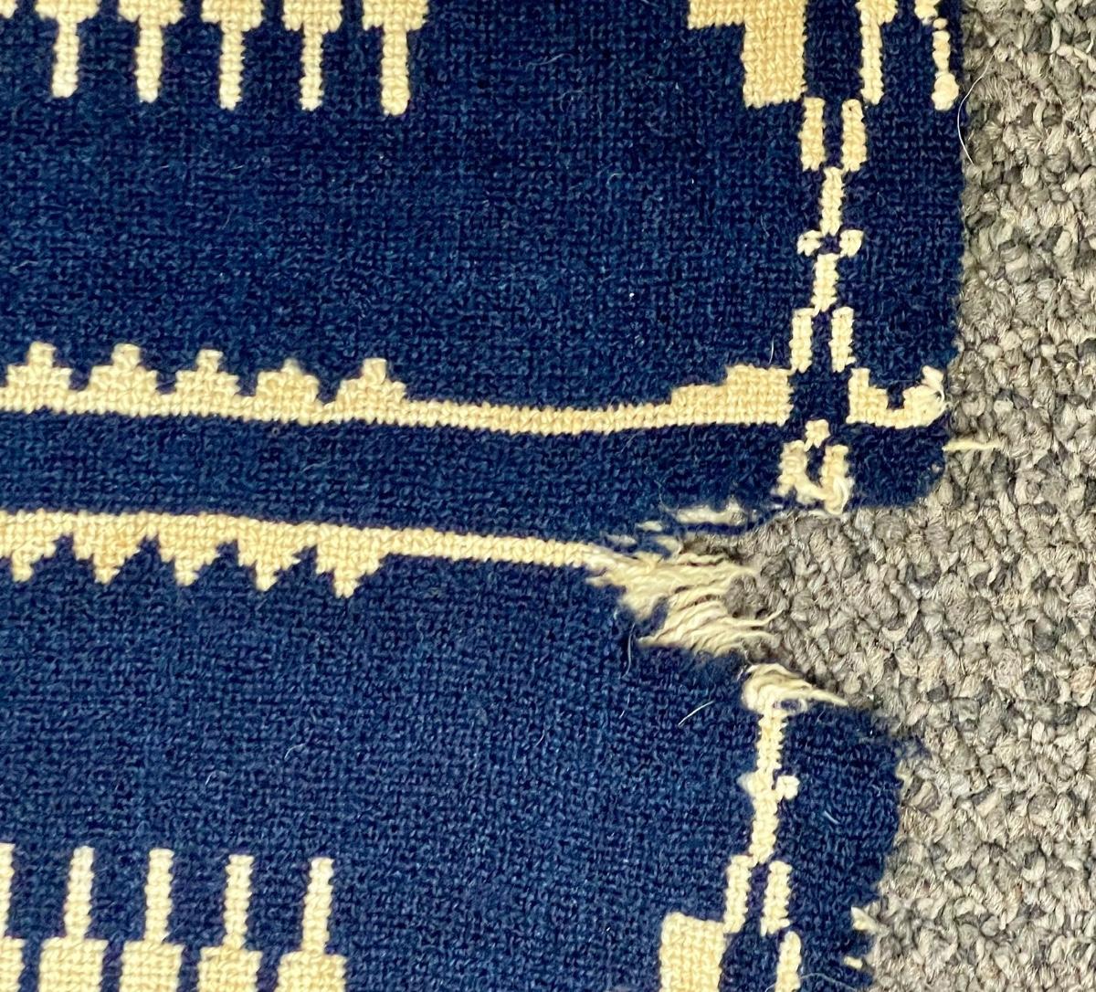 In fair to good condition with some stains and I believe it may have had fringe at some point.