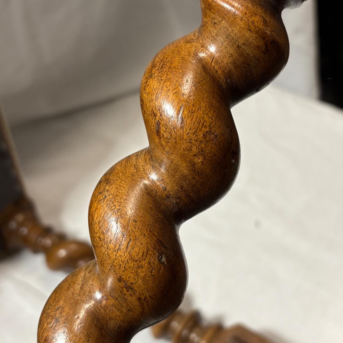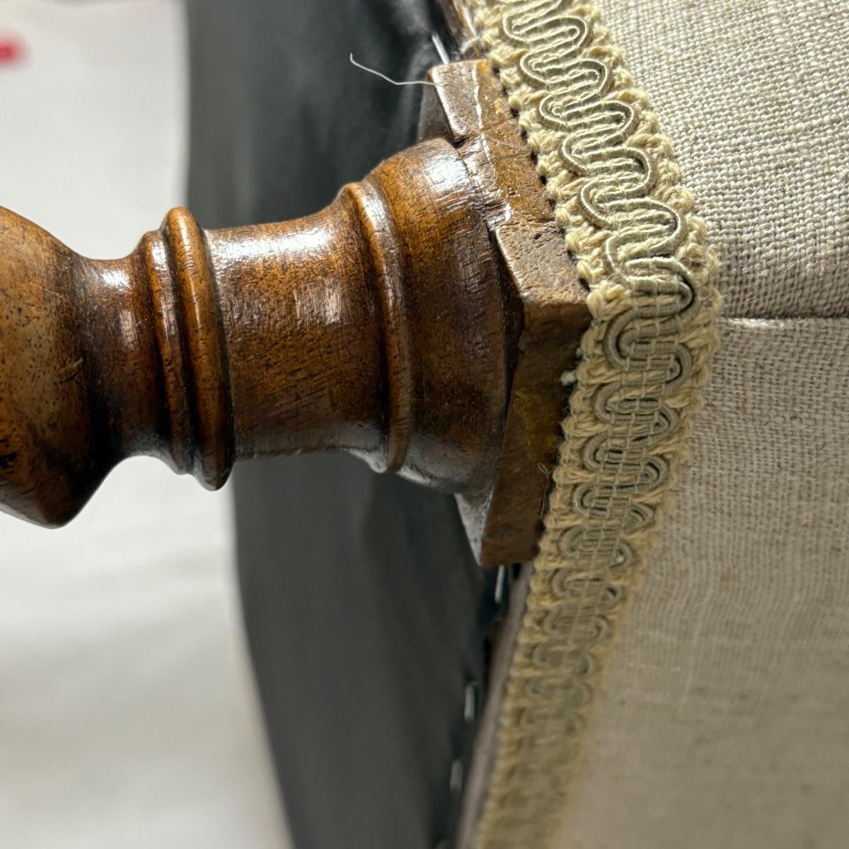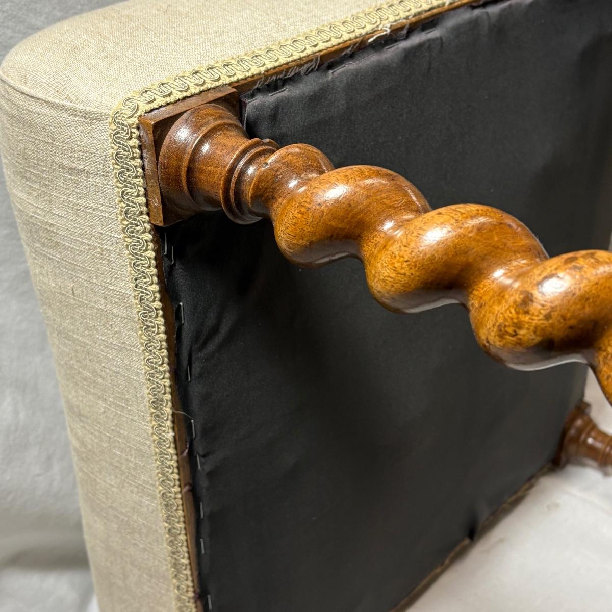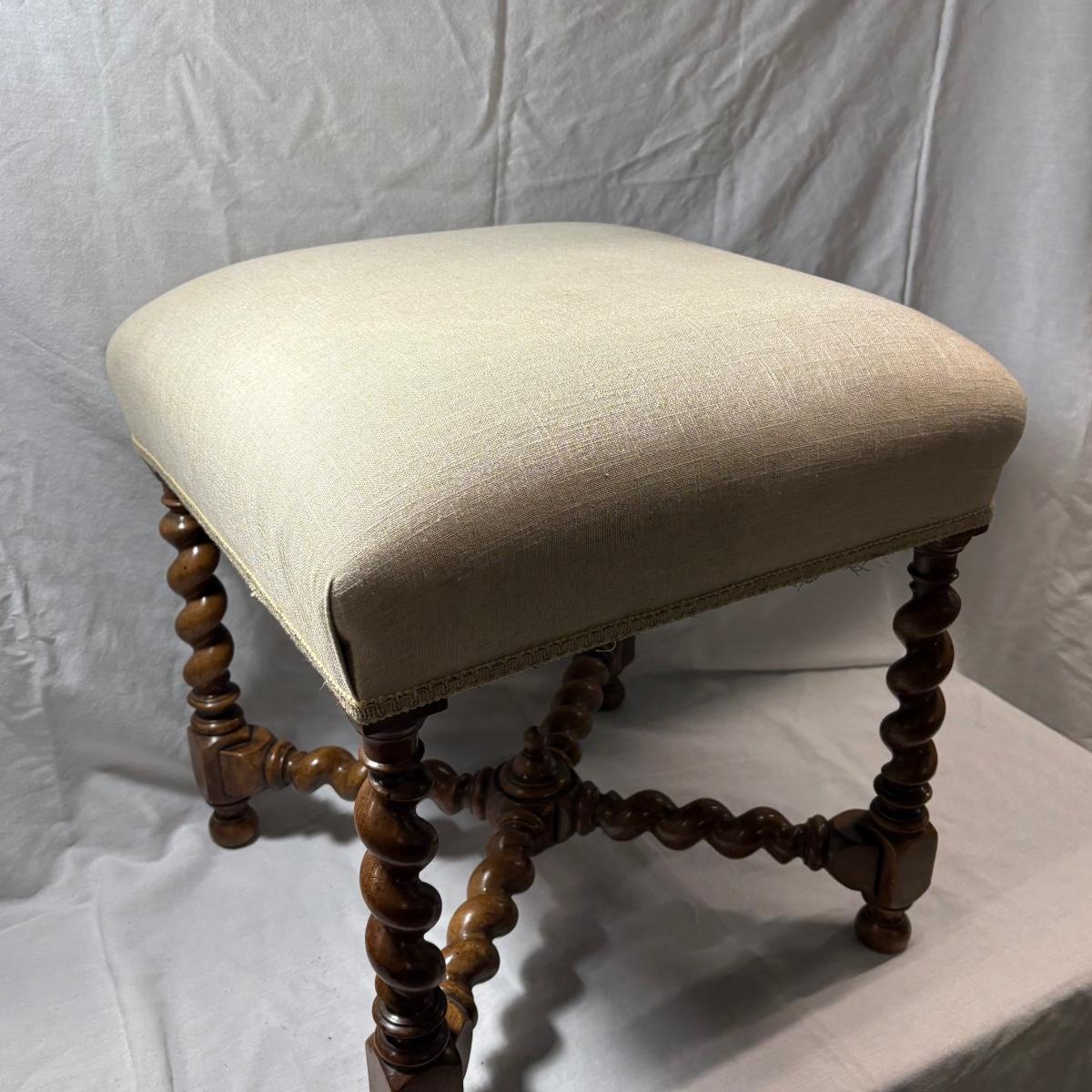 Taupe linen-look upholstered cushion, Barley Twist bench in Walnut with Cross Stretcher, France 1890. 18” x 18” x 20.5”H.
