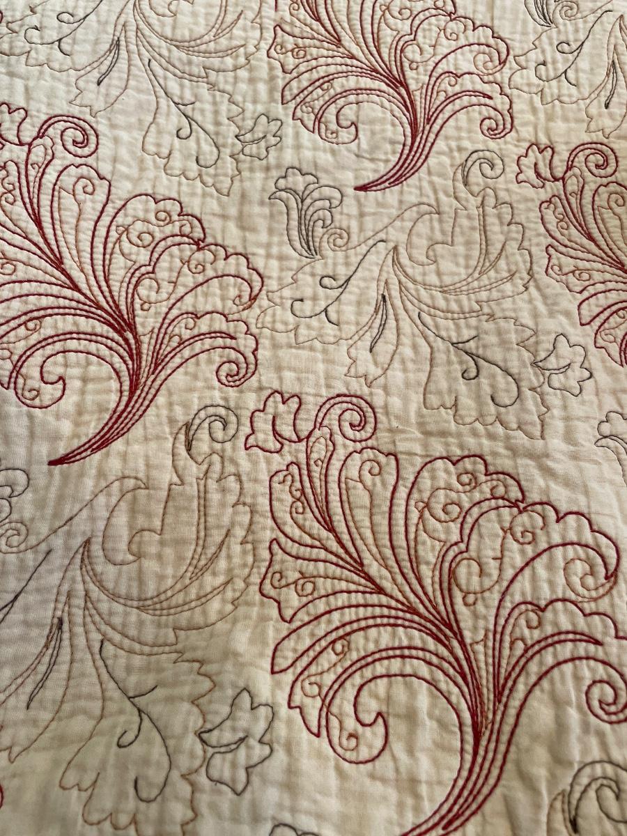 Cream bedspread with scalloped edge with a darker red trim. Has red and black stitching. Is in great shape and does not have a tag