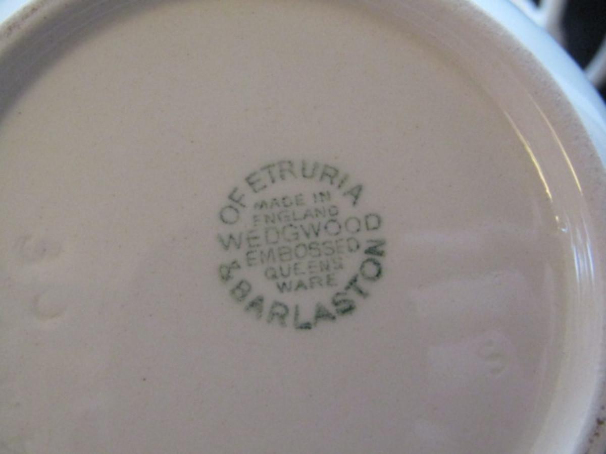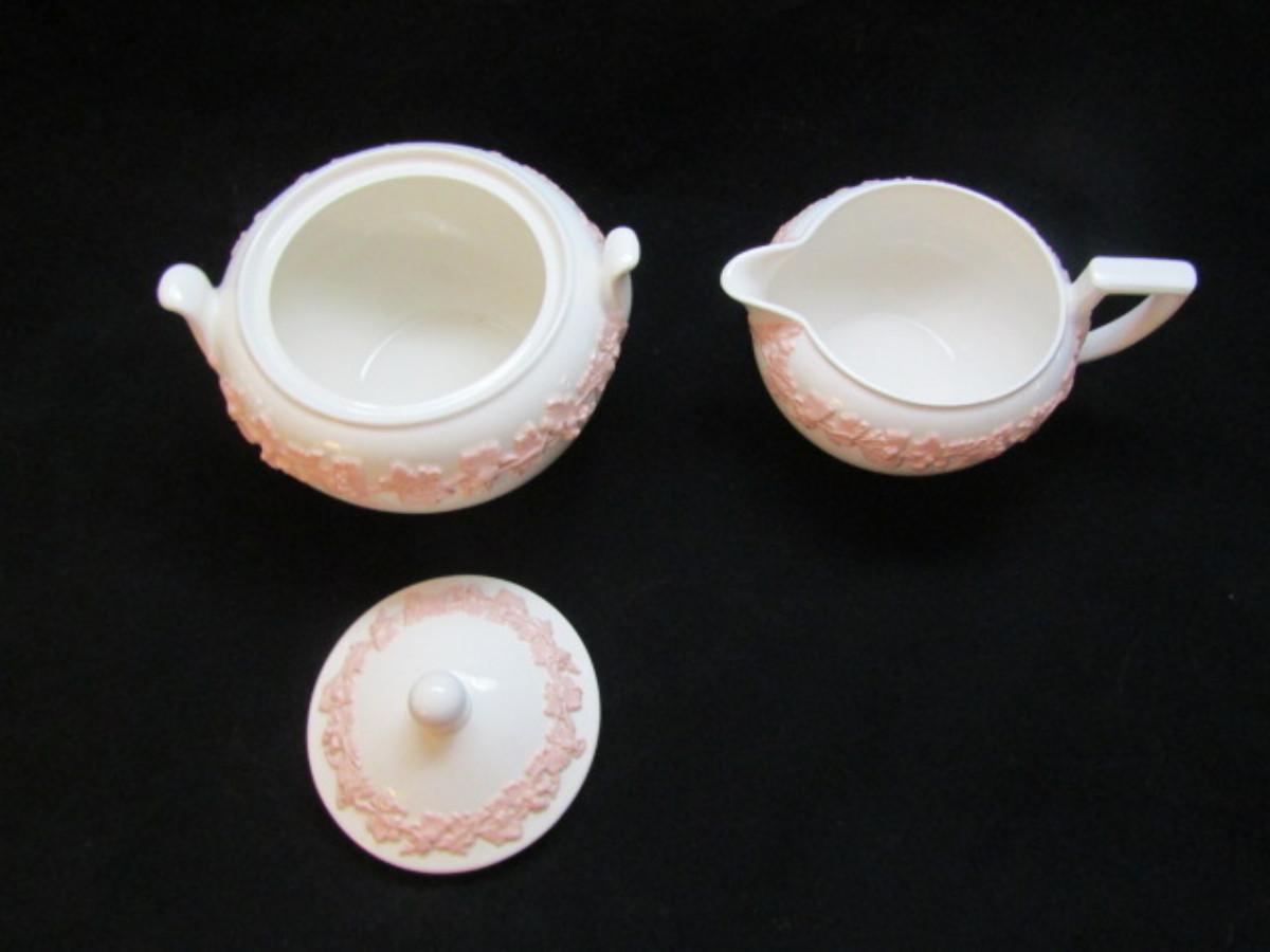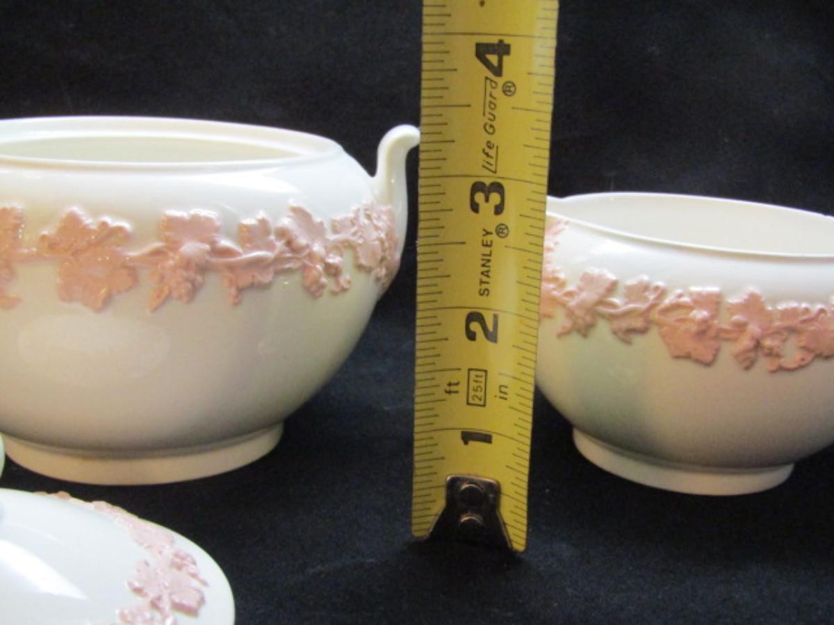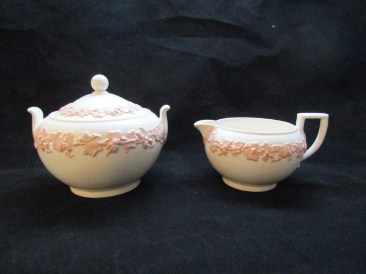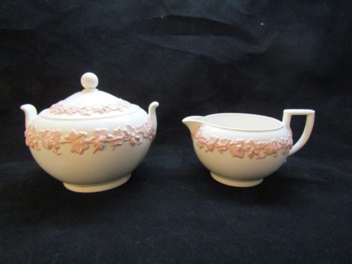 Creamer and Covered Sugar Bowl by Wedgwood- Embossed Queen's Ware of Etruria and Barlaston- Pink on White