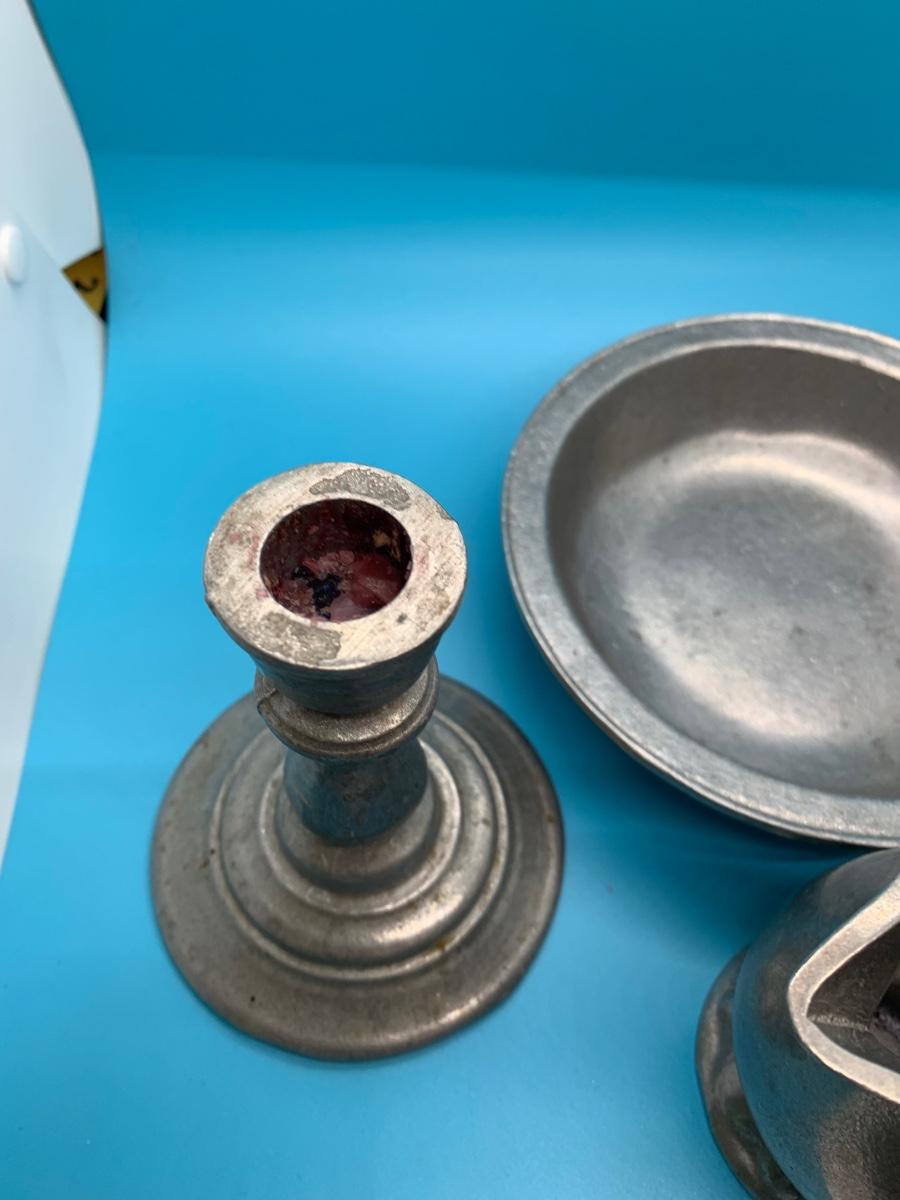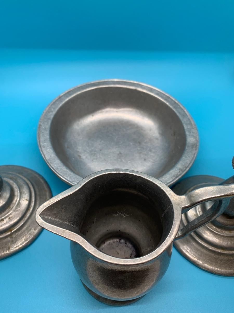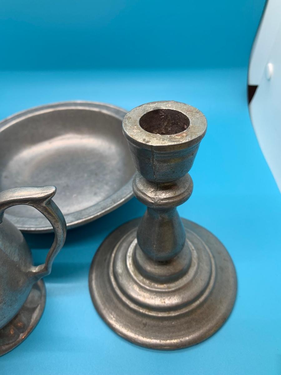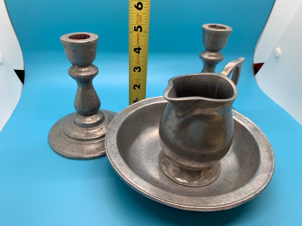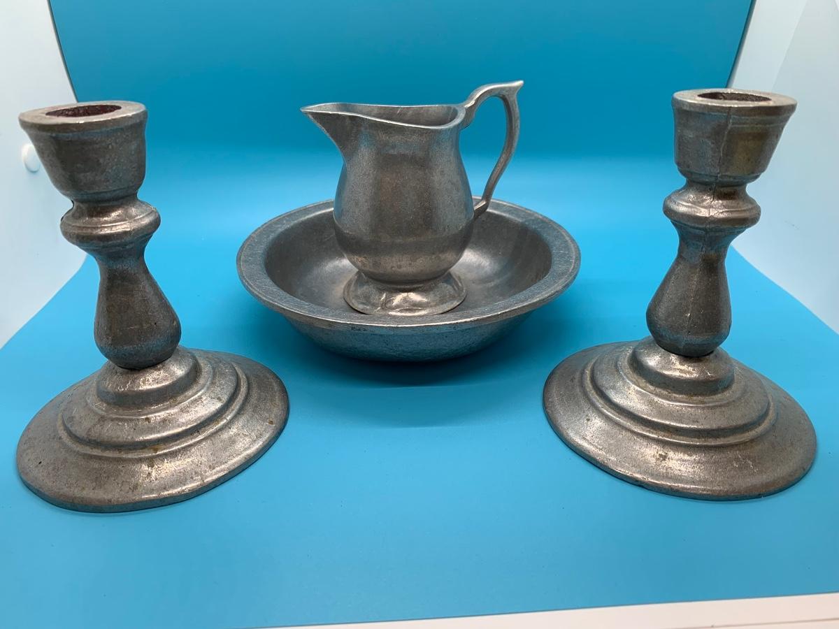 Creamer, candlesticks, bowl