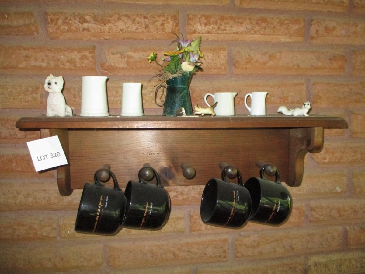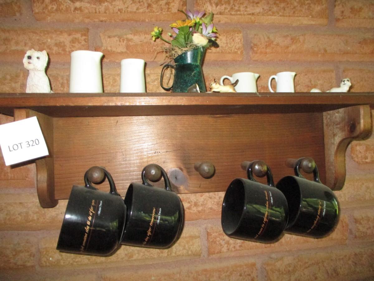 Shelf not included. White pitchers, glass mugs,