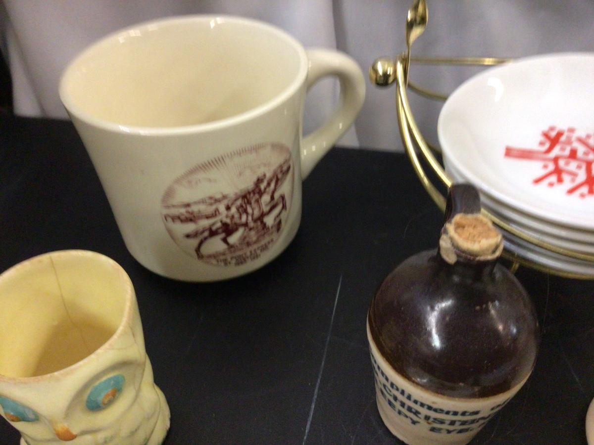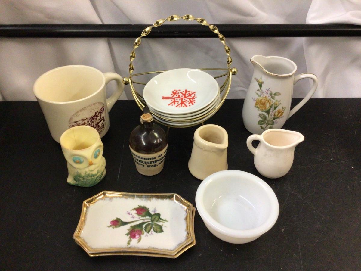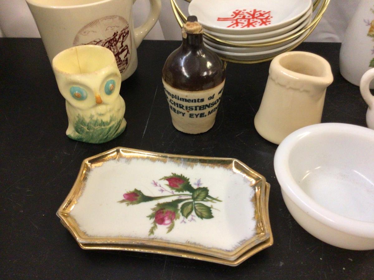 You get a variety of kitchen table accessories. Pony Express coffee mug, Sleepy Eye MN jug, owl tooth pick holder, two bone trays, set salts in tray, milk glass salt.