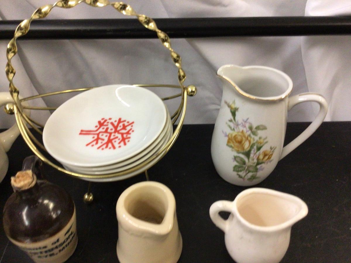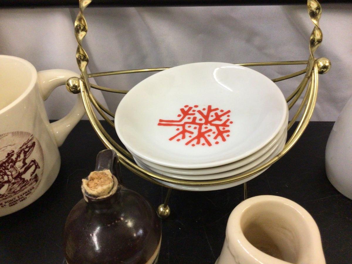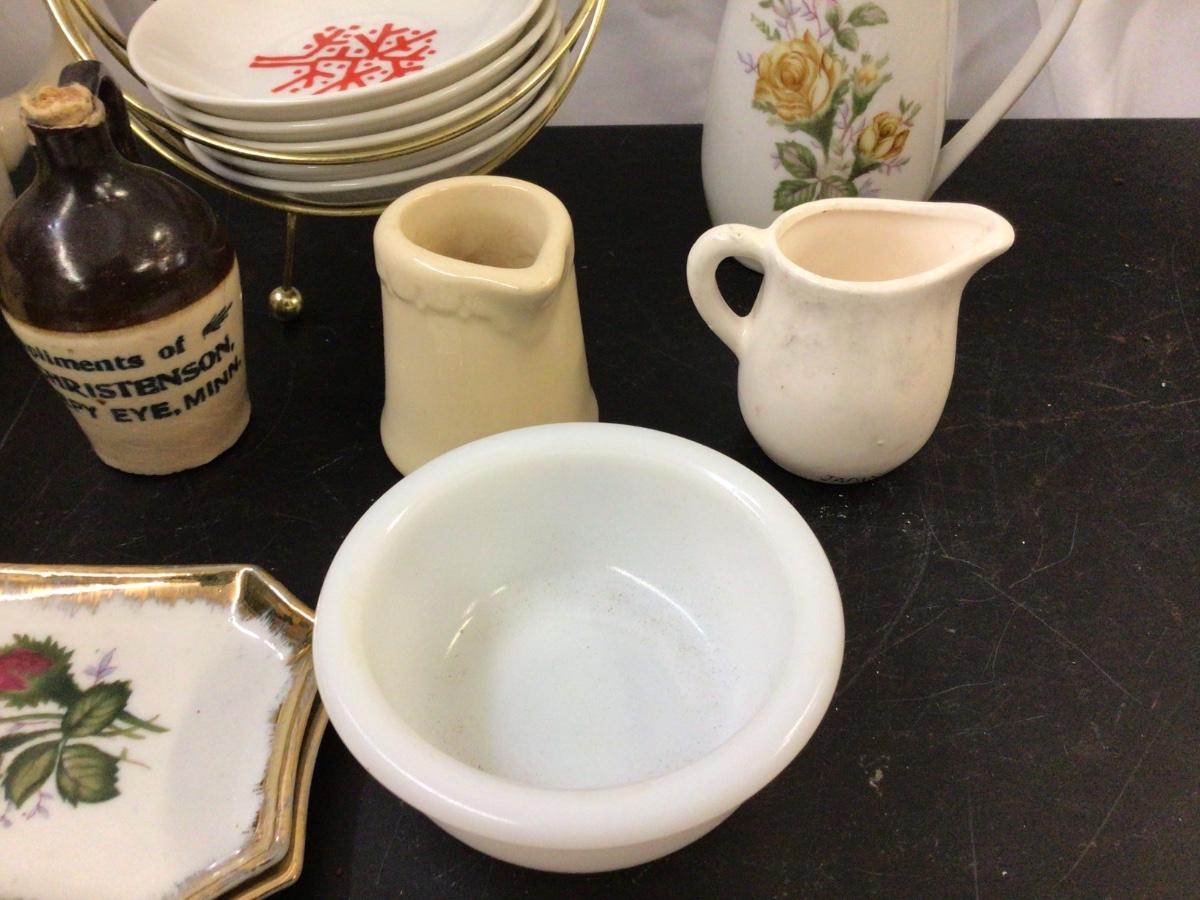 You get a variety of kitchen table accessories. Pony Express coffee mug, Sleepy Eye MN jug, owl tooth pick holder, two bone trays, set salts in tray, milk glass salt.