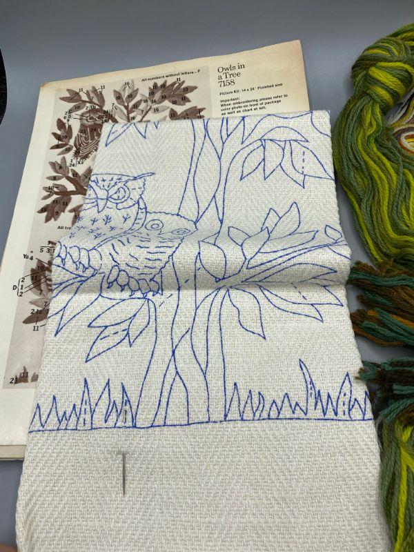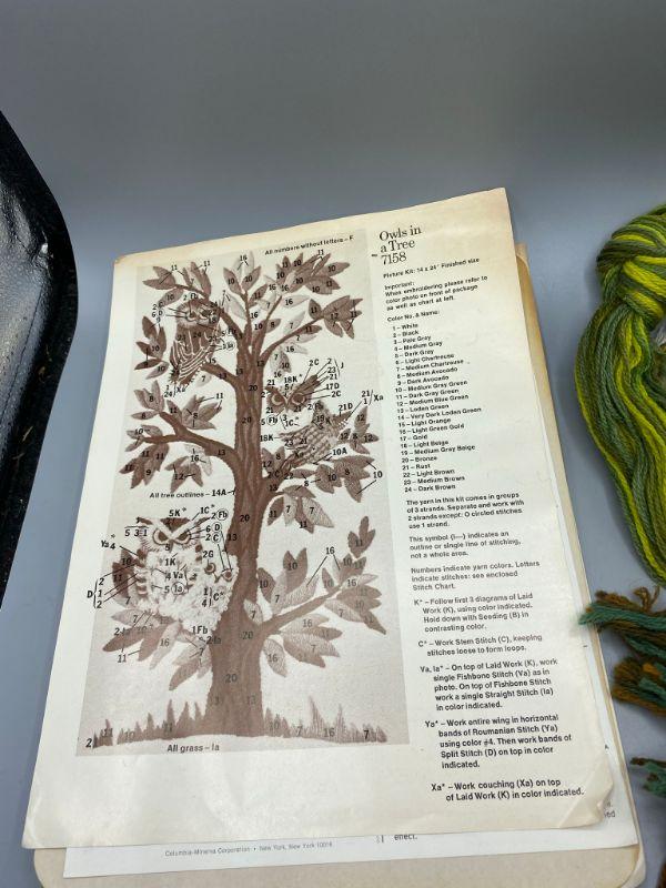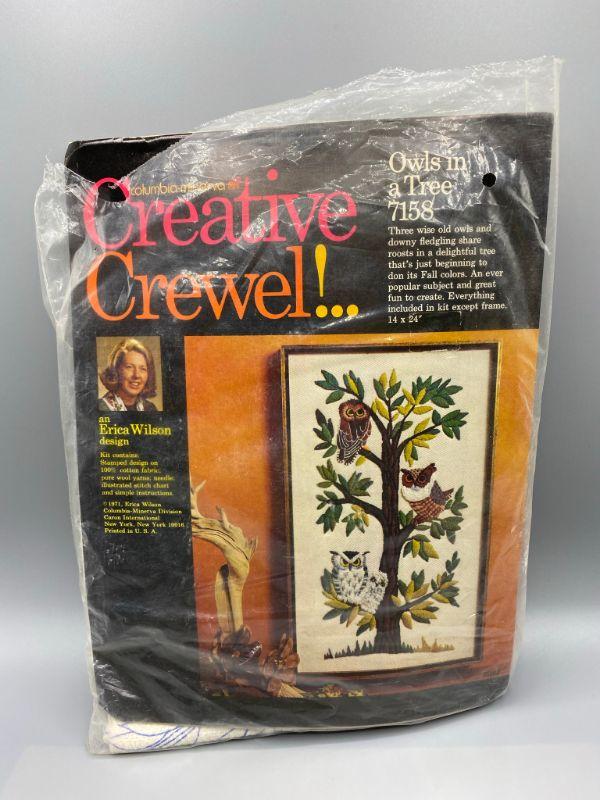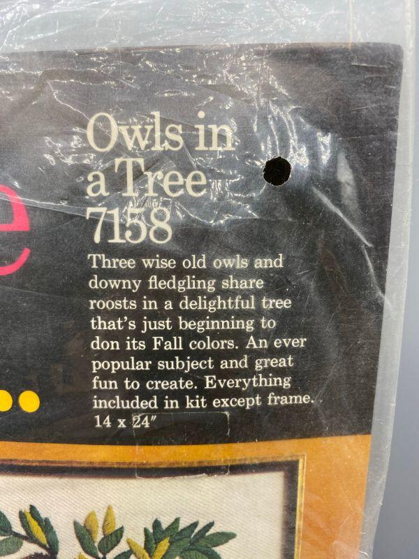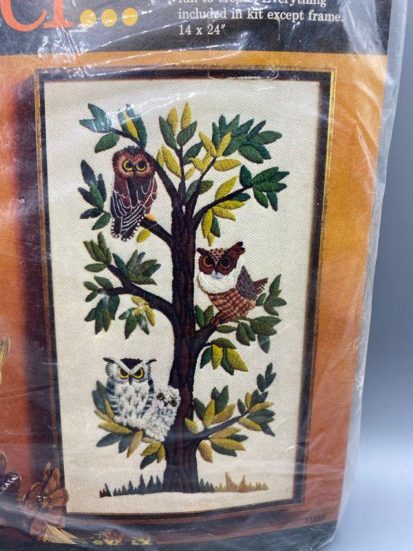 Creative Crewel needlecraft kit. An Erica Wilson design "Owls in a Tree". Opened package but kit looks complete. Copyright 1971.