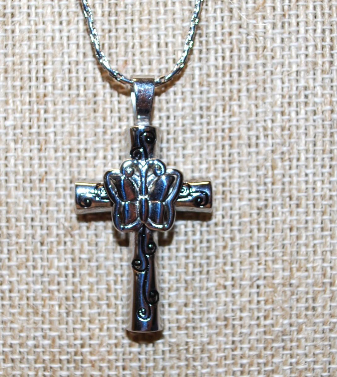 Cremation Ashes Memorial Stainless Steel Butterfly Cross PENDANT (1½" x ¾") on a Necklace Chain 22" L