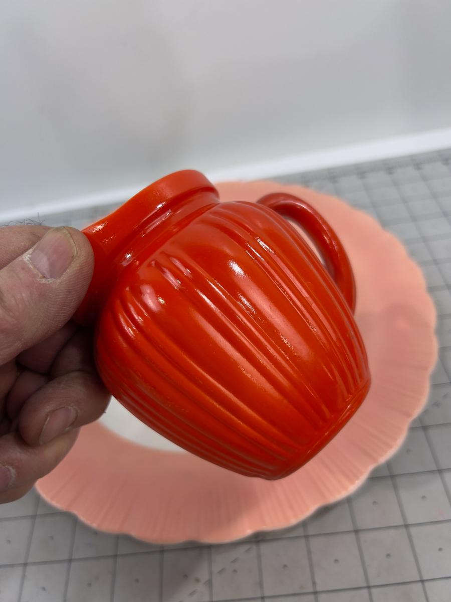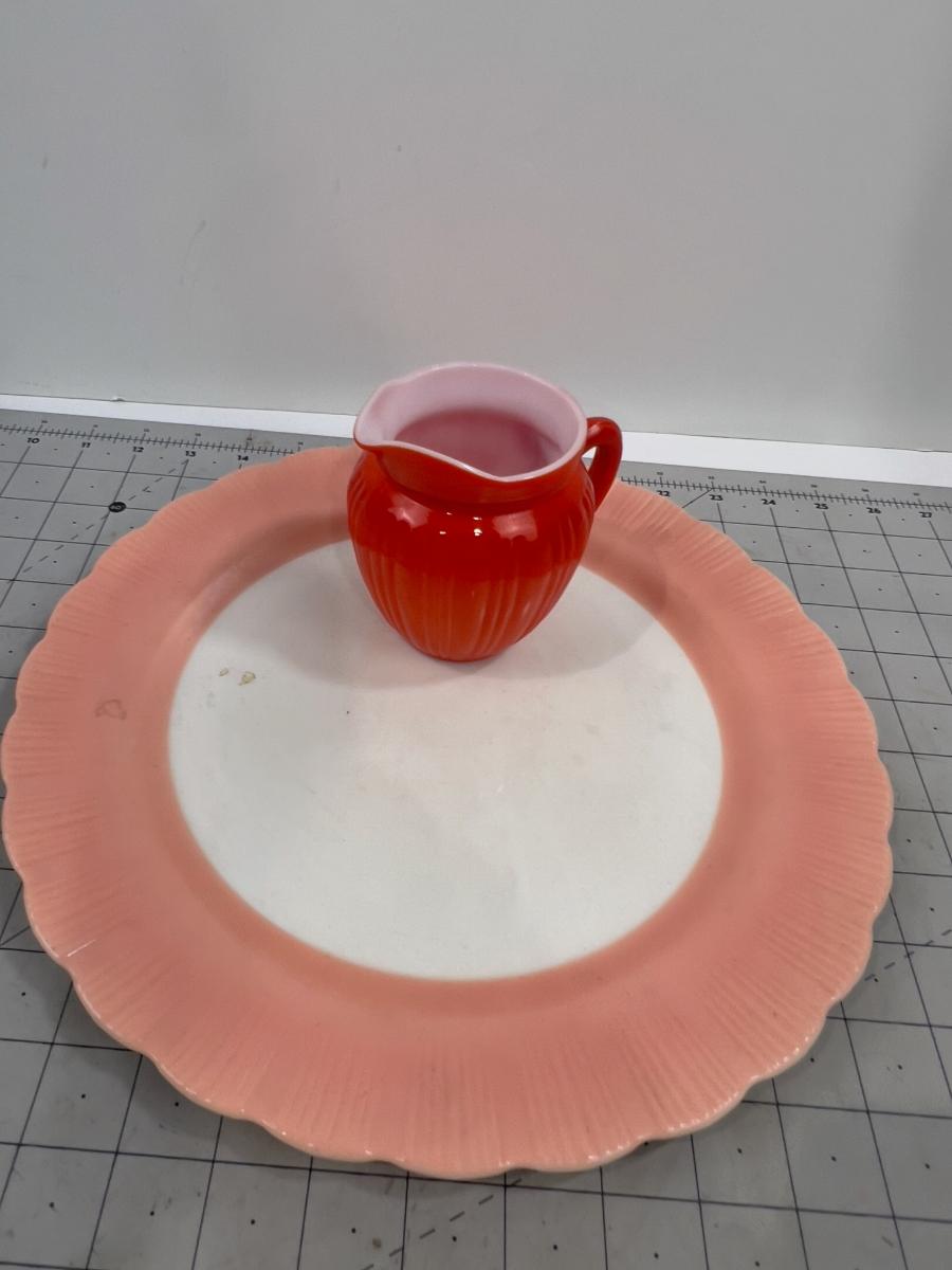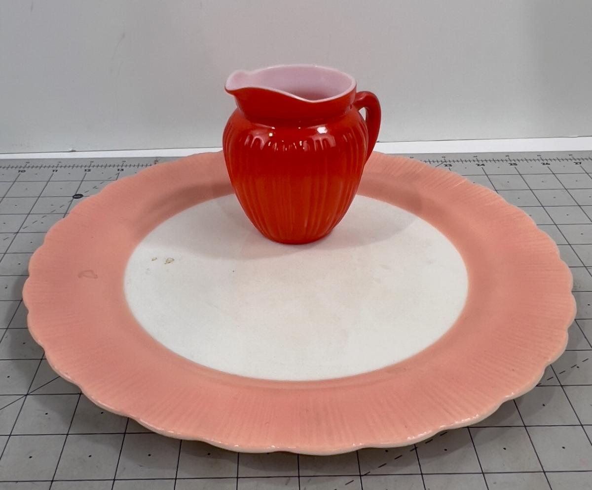 Cremaz Glass Pink and White Platter Plus Hazel Atlas Orange and White Pitcher