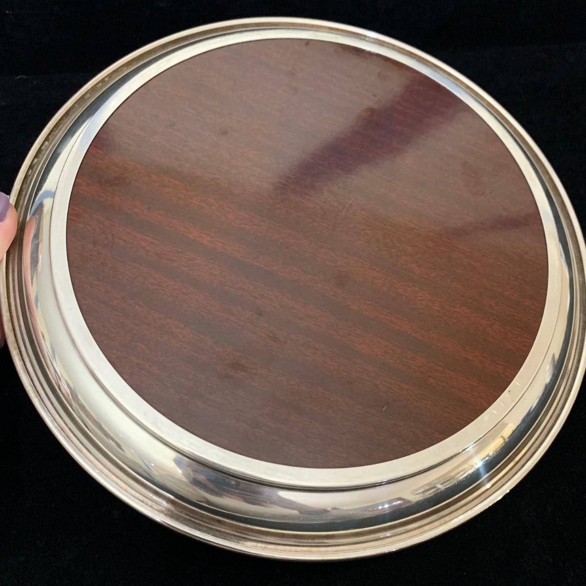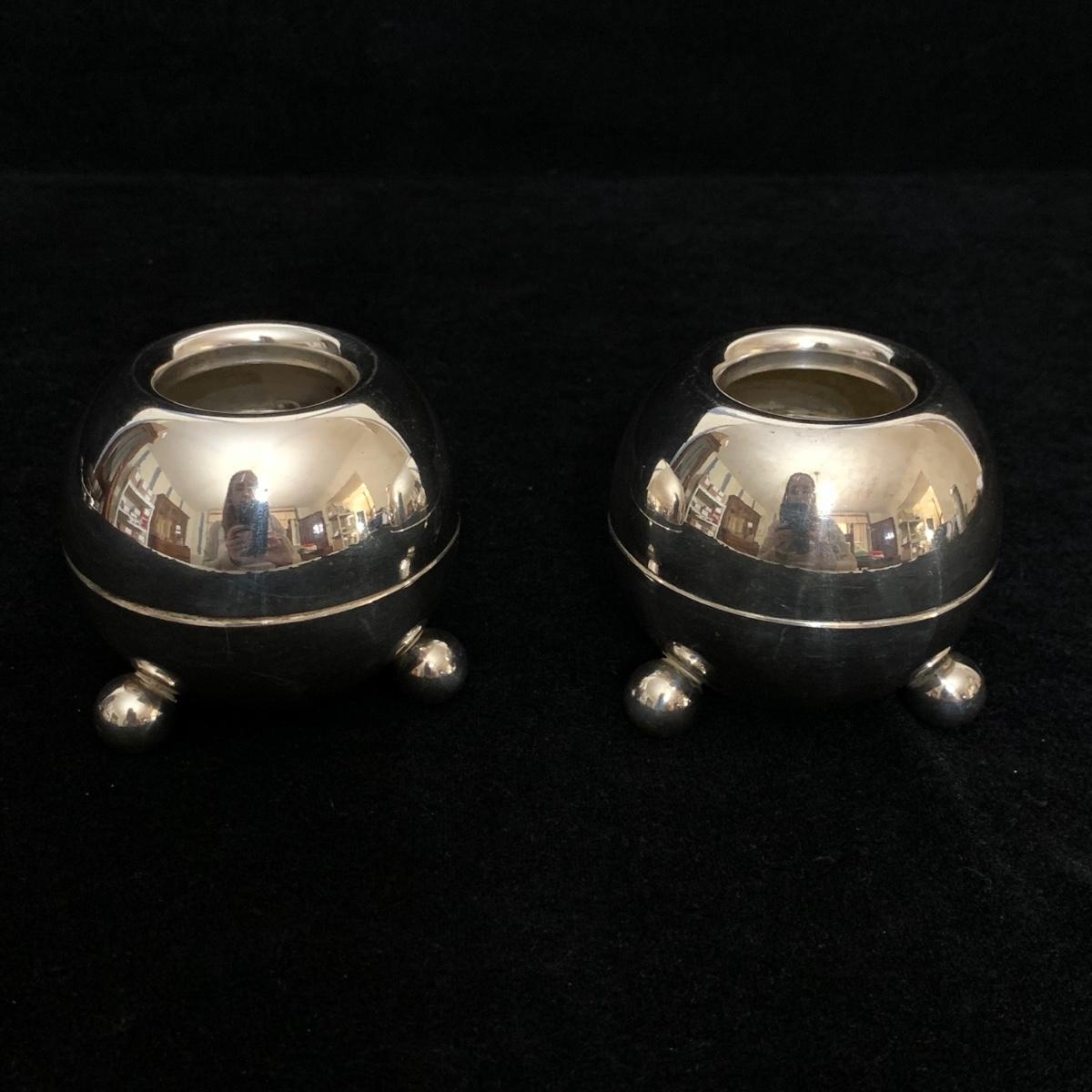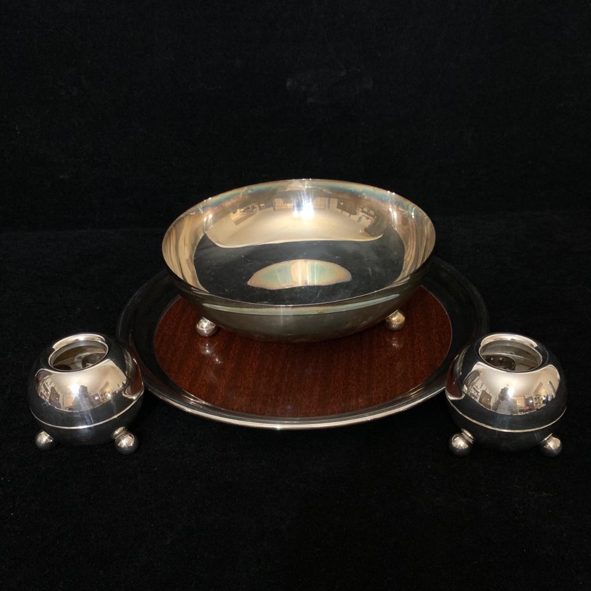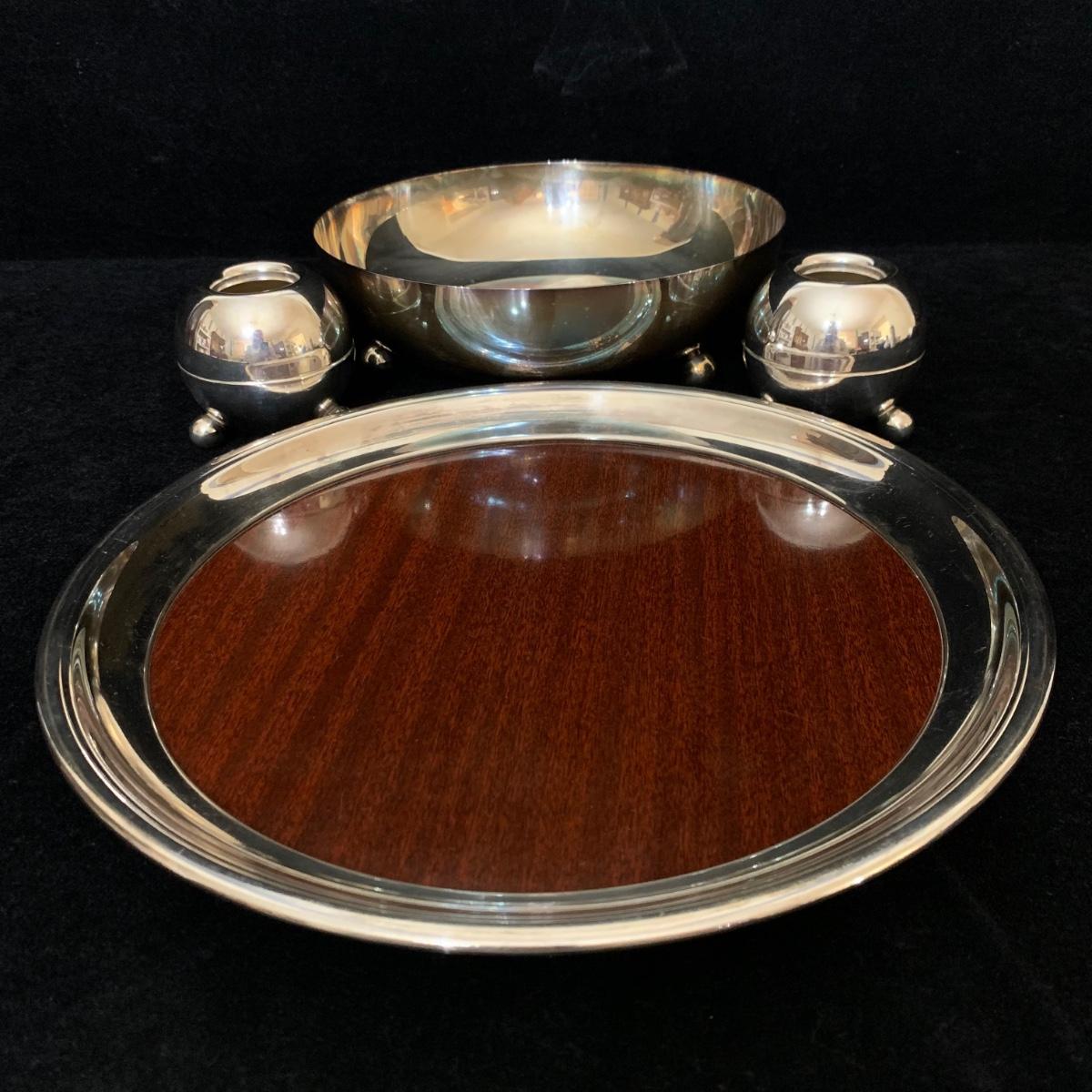 Fun mid-century modern style home decor collection. Included in this lot: one Crescent tray, one Crescent bowl, and two Pilcher candleholders. The tray is 12”d and has a silverplate edge around a wood grain style Formica center. The Pilcher candleholders and Crescent bowl feature the same type of orb-shaped feet. The candleholders and bowl appear to be silverplate. There is some tarnishing on the items, but otherwise they are in good condition.