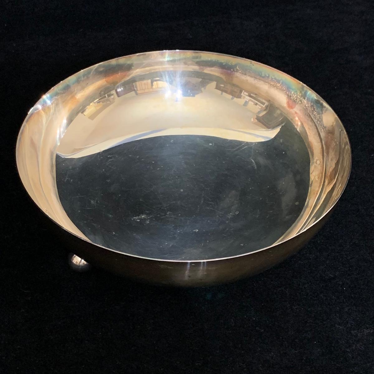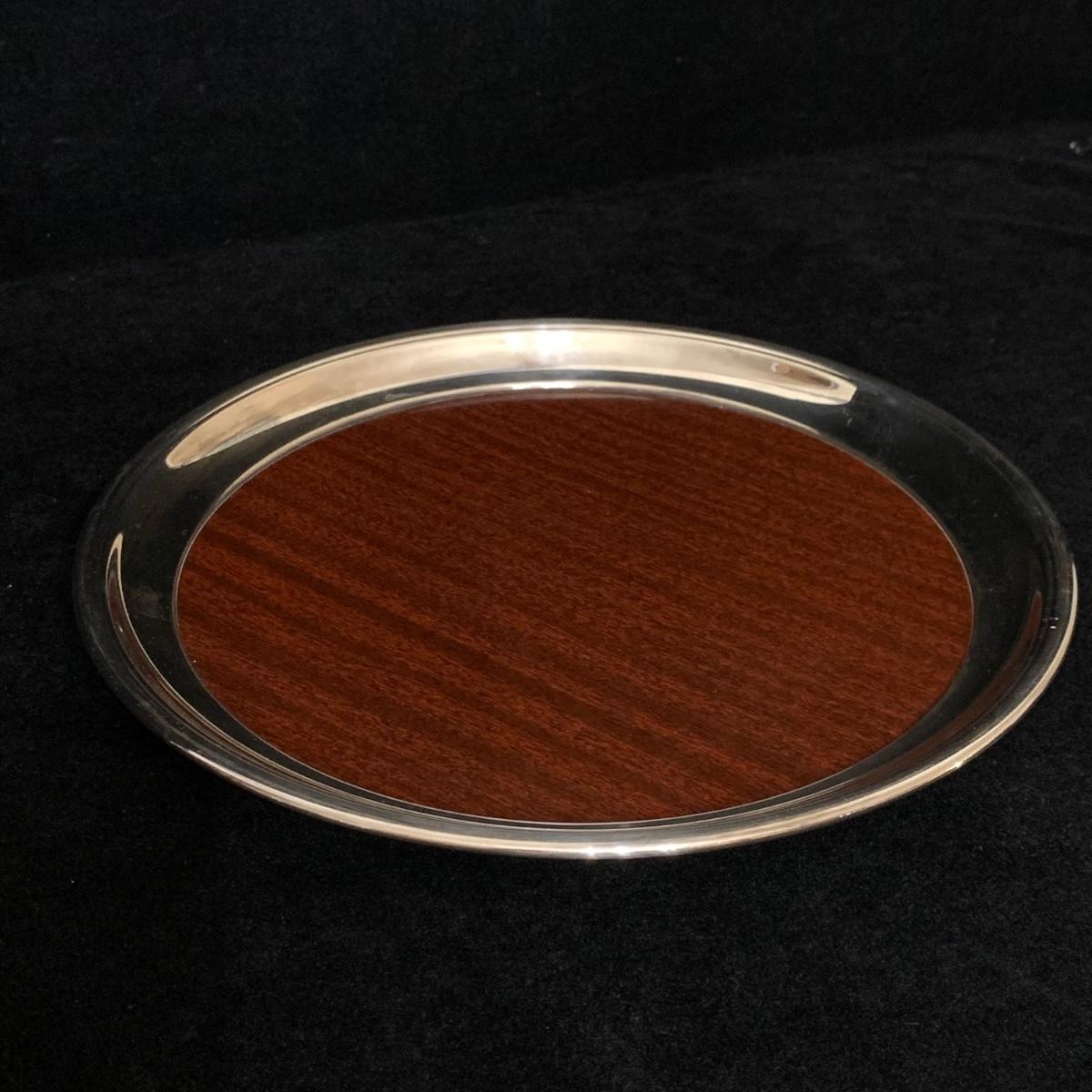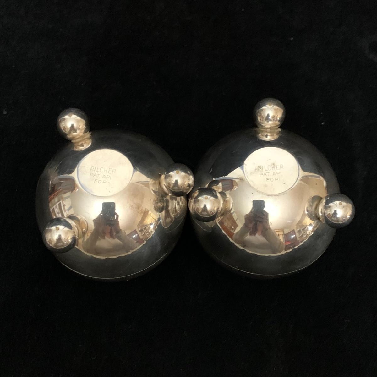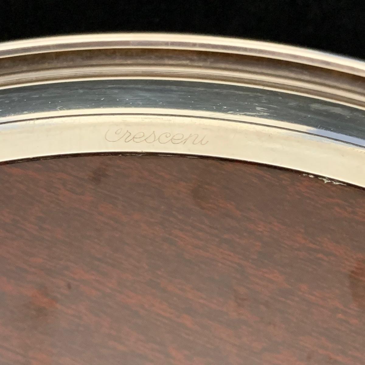 Fun mid-century modern style home decor collection. Included in this lot: one Crescent tray, one Crescent bowl, and two Pilcher candleholders. The tray is 12”d and has a silverplate edge around a wood grain style Formica center. The Pilcher candleholders and Crescent bowl feature the same type of orb-shaped feet. The candleholders and bowl appear to be silverplate. There is some tarnishing on the items, but otherwise they are in good condition.