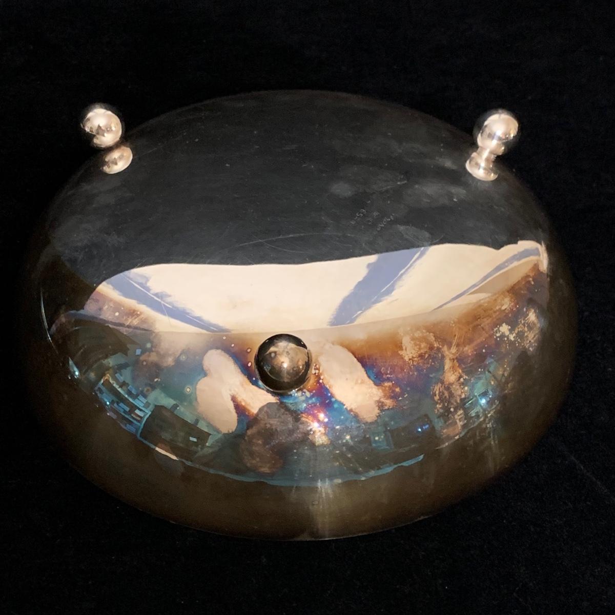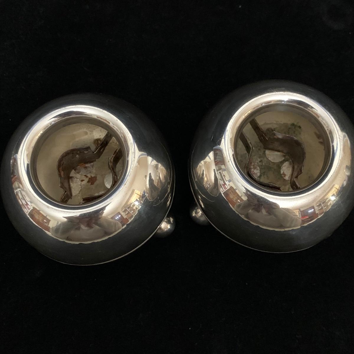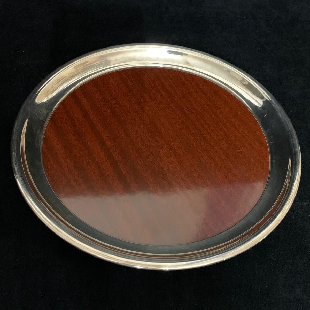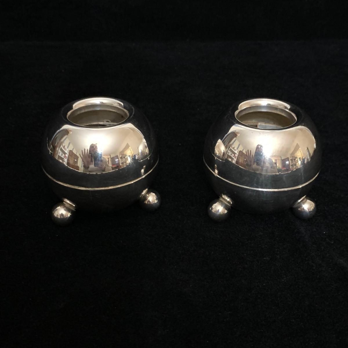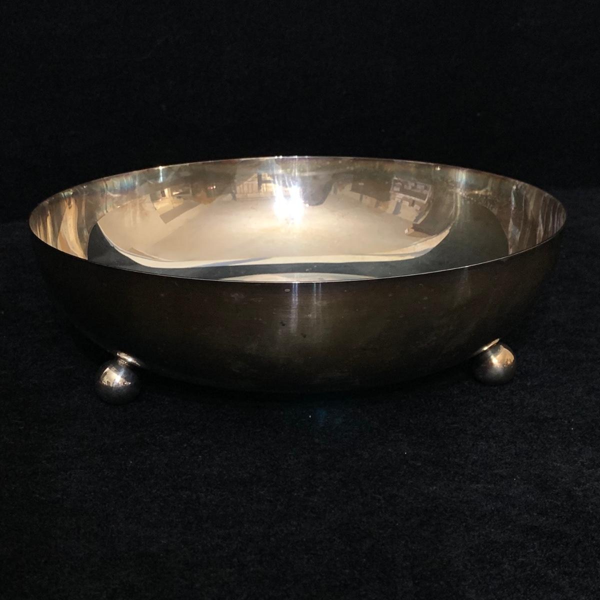 Fun mid-century modern style home decor collection. Included in this lot: one Crescent tray, one Crescent bowl, and two Pilcher candleholders. The tray is 12”d and has a silverplate edge around a wood grain style Formica center. The Pilcher candleholders and Crescent bowl feature the same type of orb-shaped feet. The candleholders and bowl appear to be silverplate. There is some tarnishing on the items, but otherwise they are in good condition.