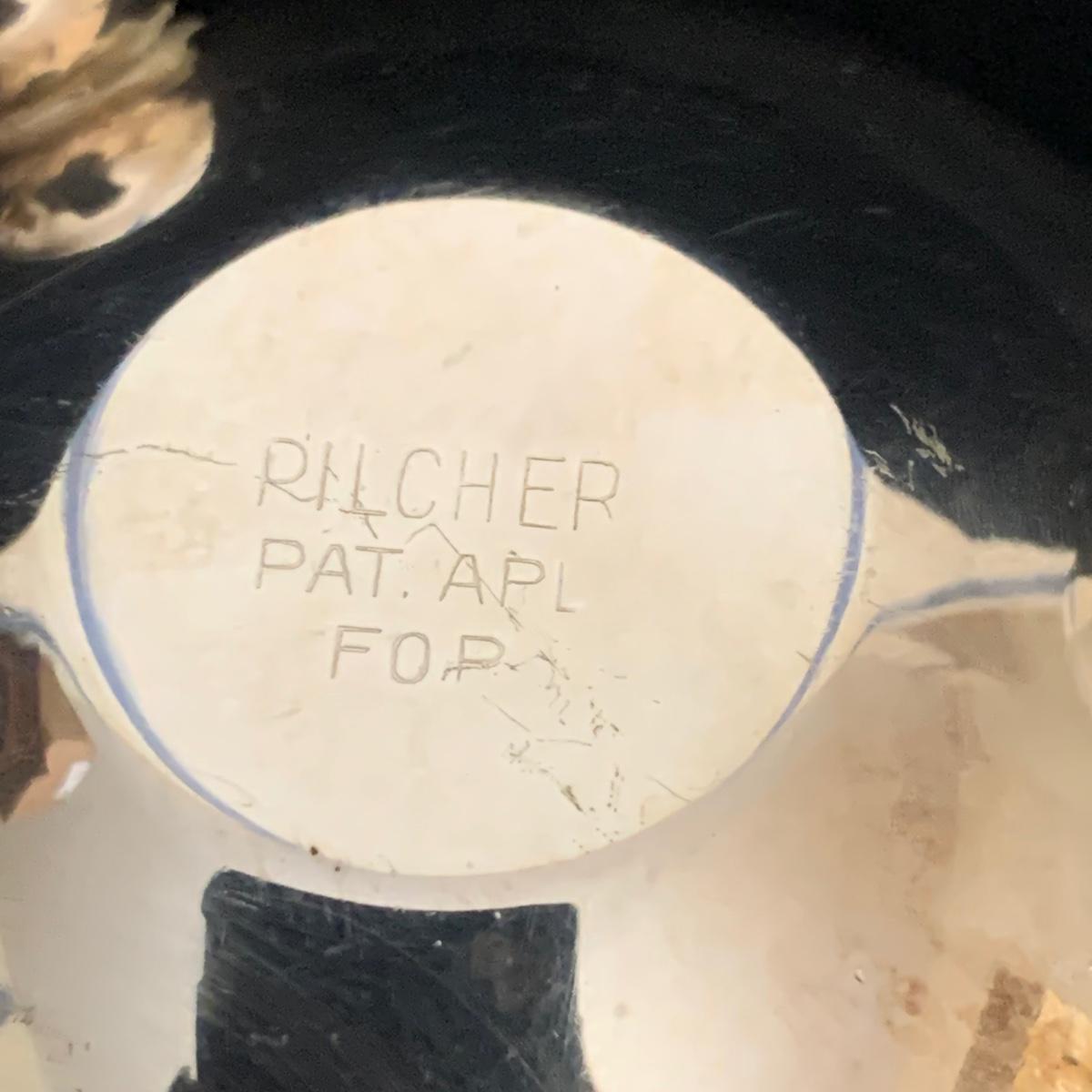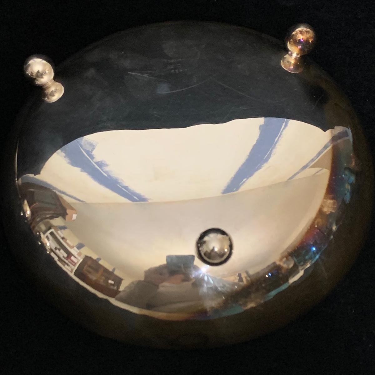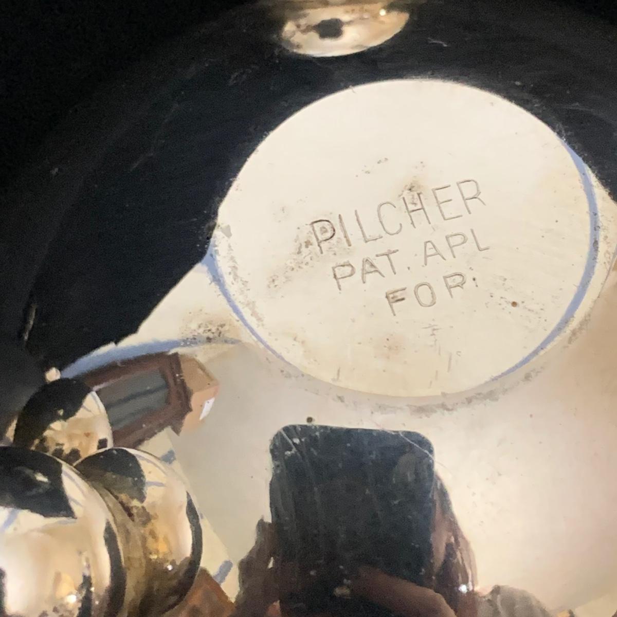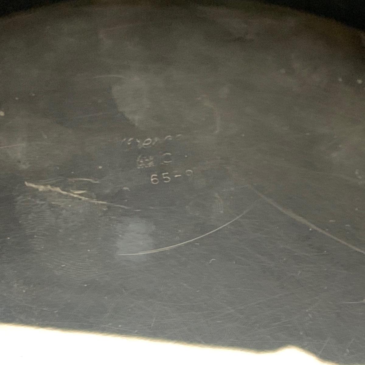 Fun mid-century modern style home decor collection. Included in this lot: one Crescent tray, one Crescent bowl, and two Pilcher candleholders. The tray is 12”d and has a silverplate edge around a wood grain style Formica center. The Pilcher candleholders and Crescent bowl feature the same type of orb-shaped feet. The candleholders and bowl appear to be silverplate. There is some tarnishing on the items, but otherwise they are in good condition.