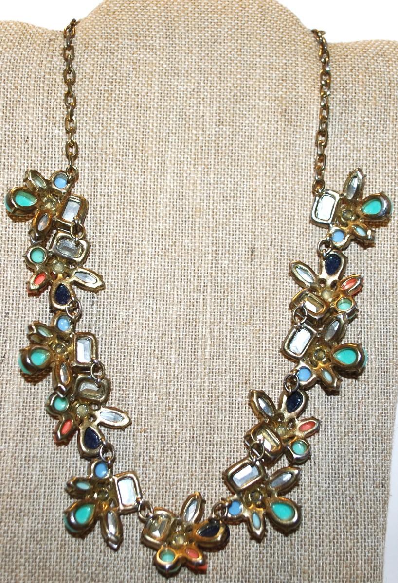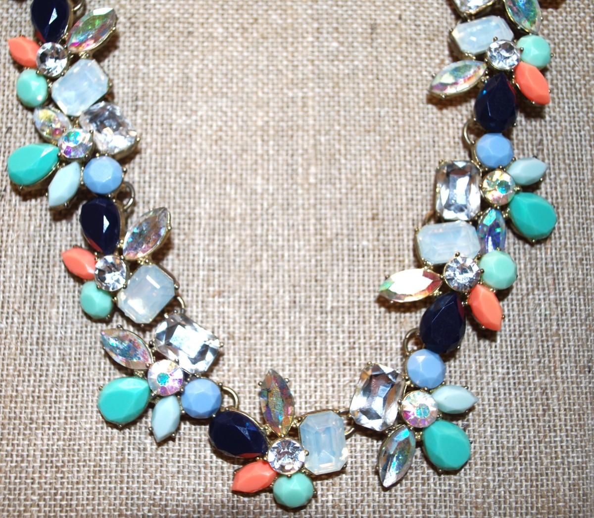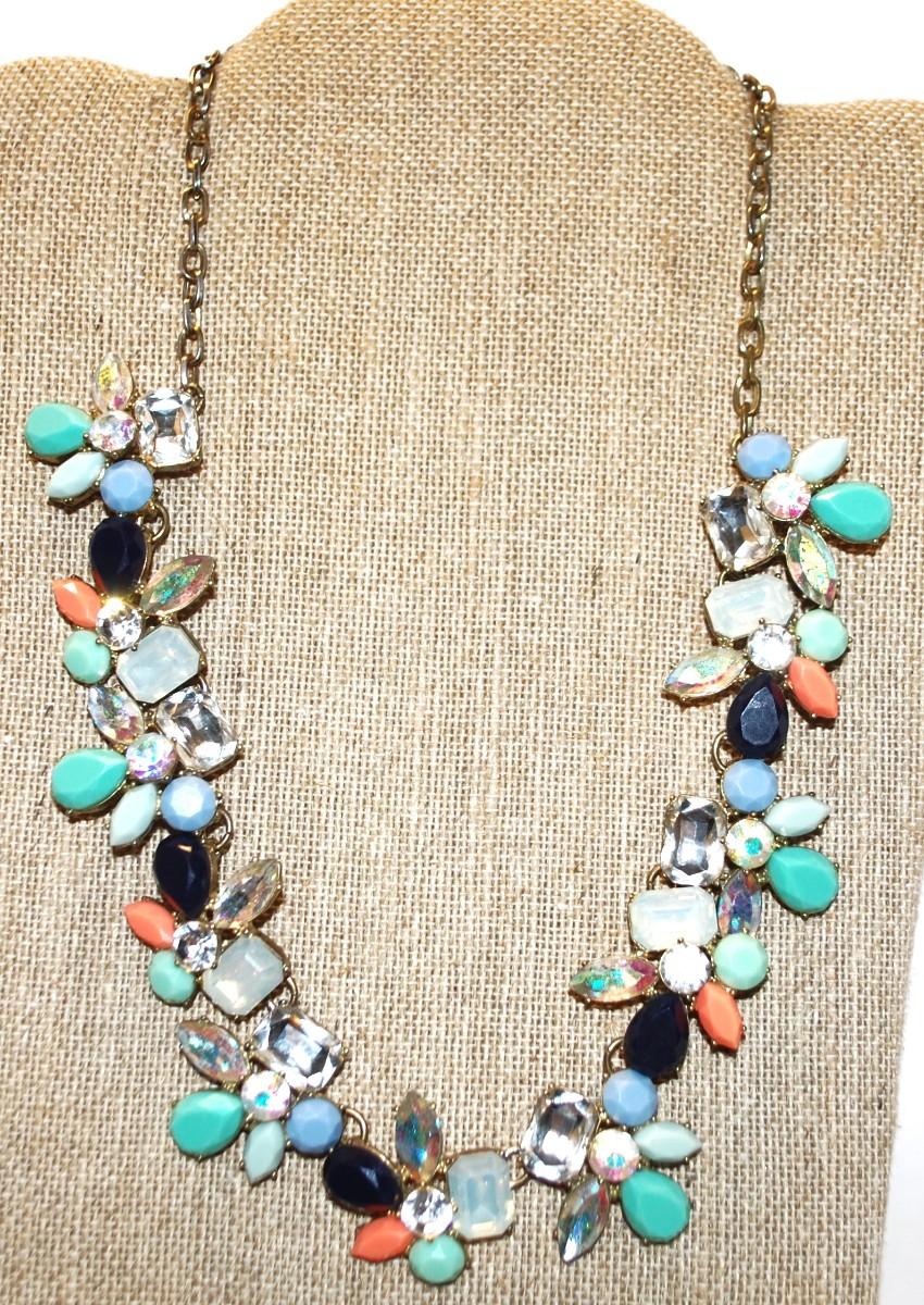 "CREW" Brand Necklace with Coral, Aqua, Black, Clear Stones in a Flower Pattern 20" L