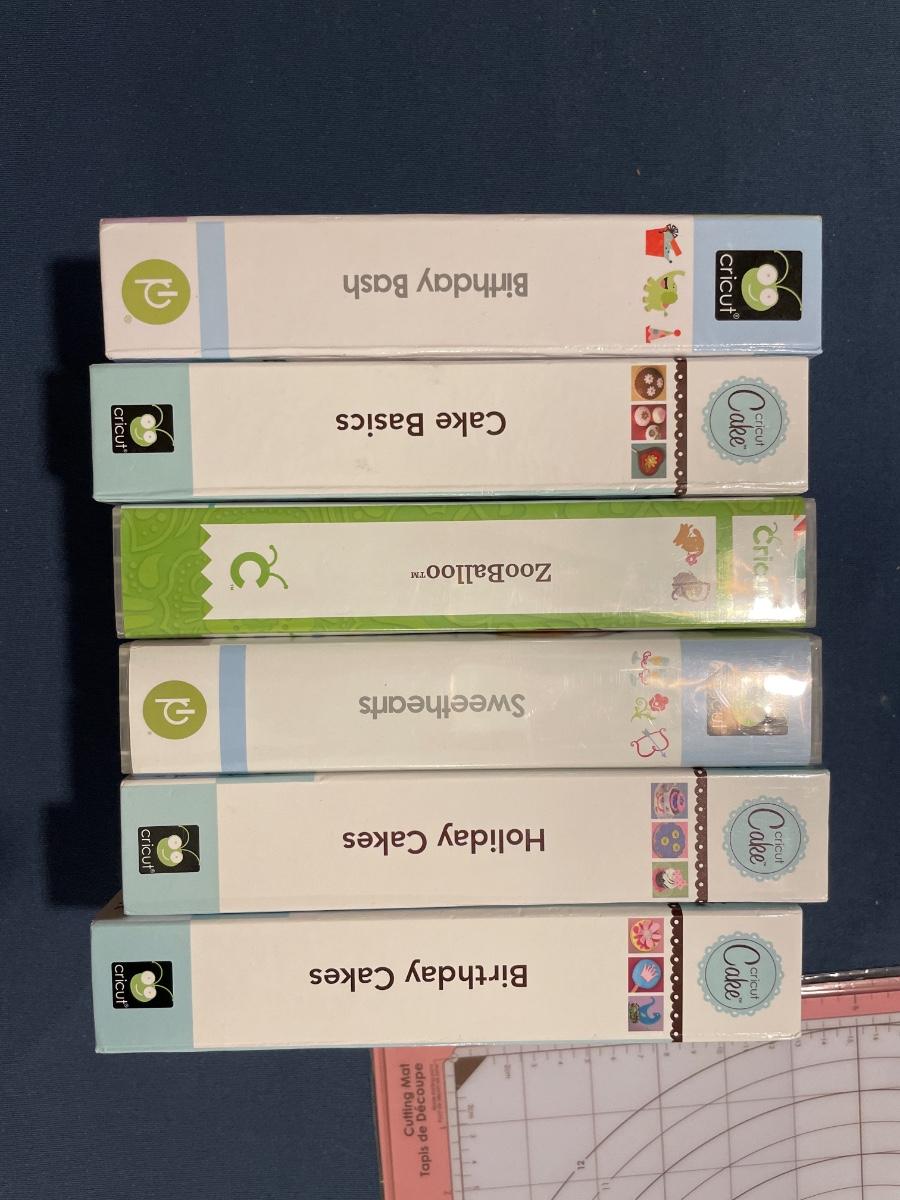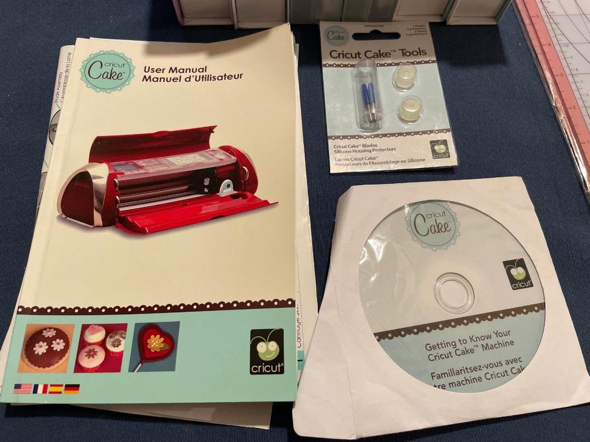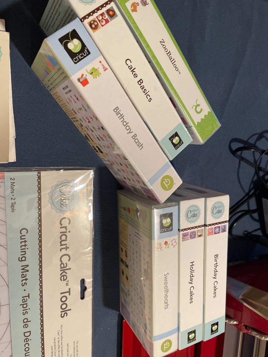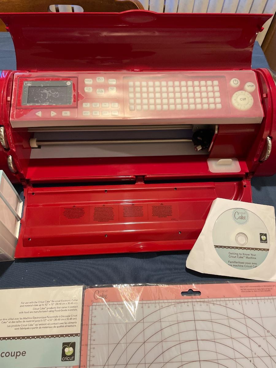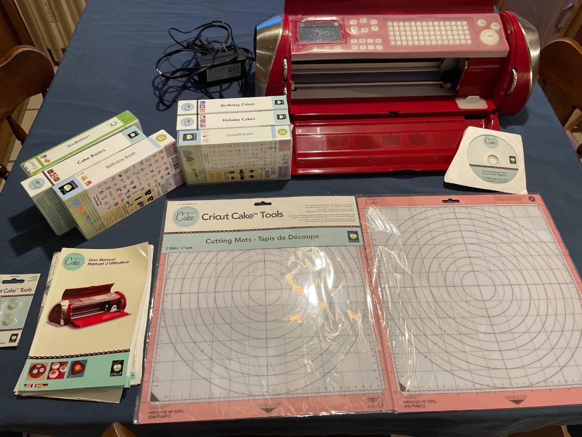 Like new red Cricut Cake Machine and 6 cartridges with cutting mats new in plastic