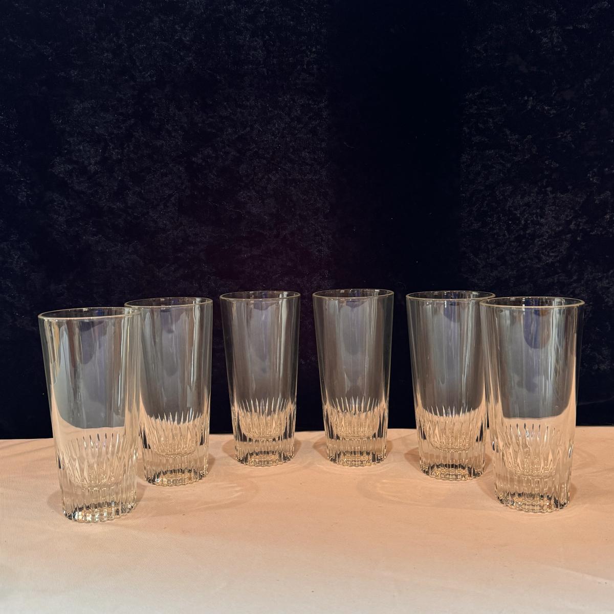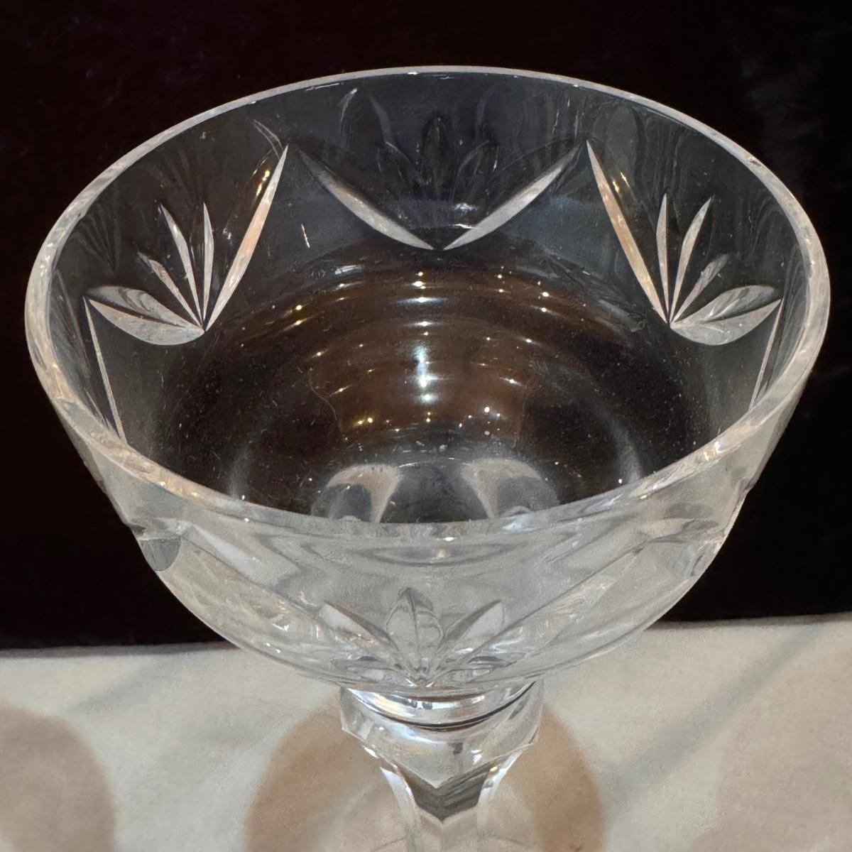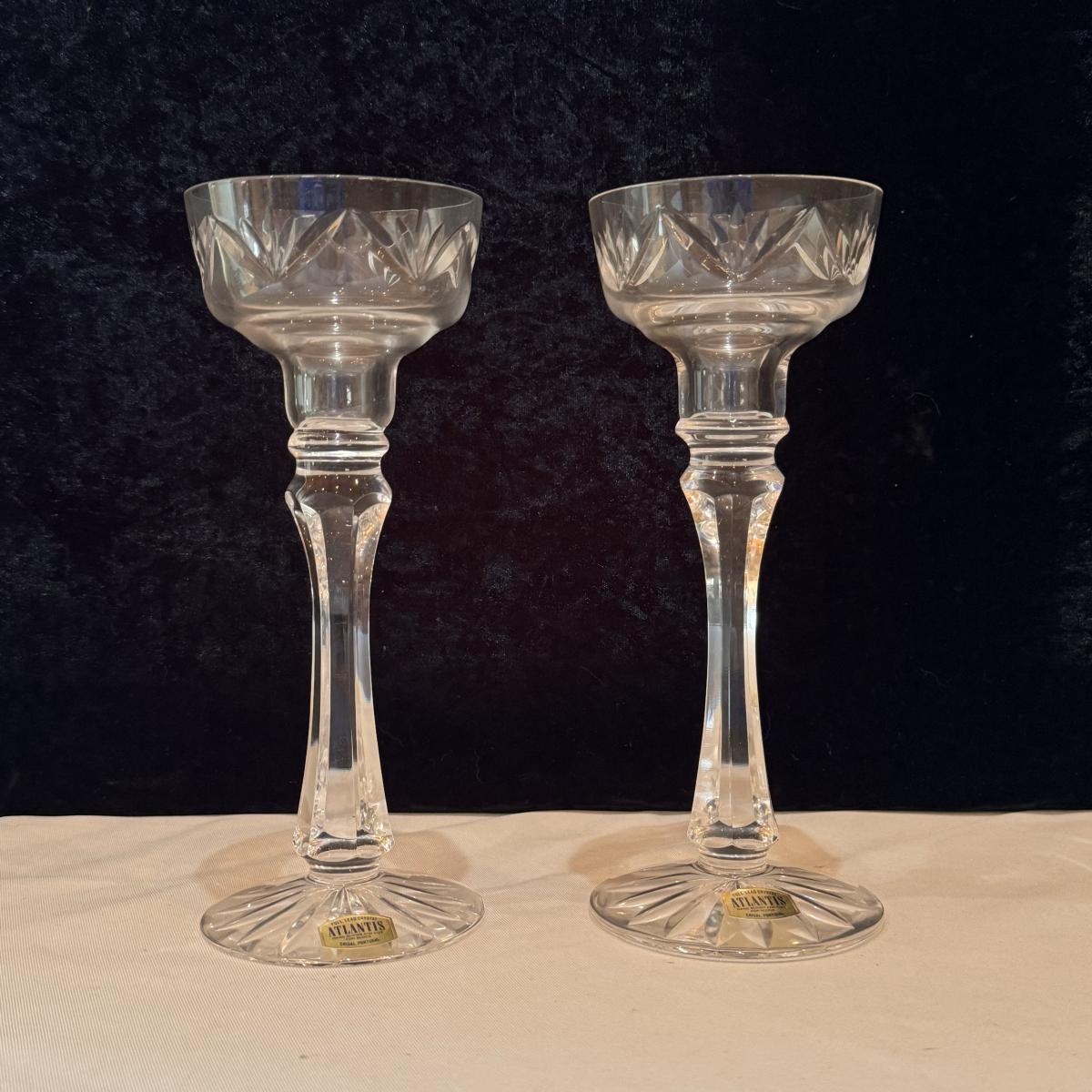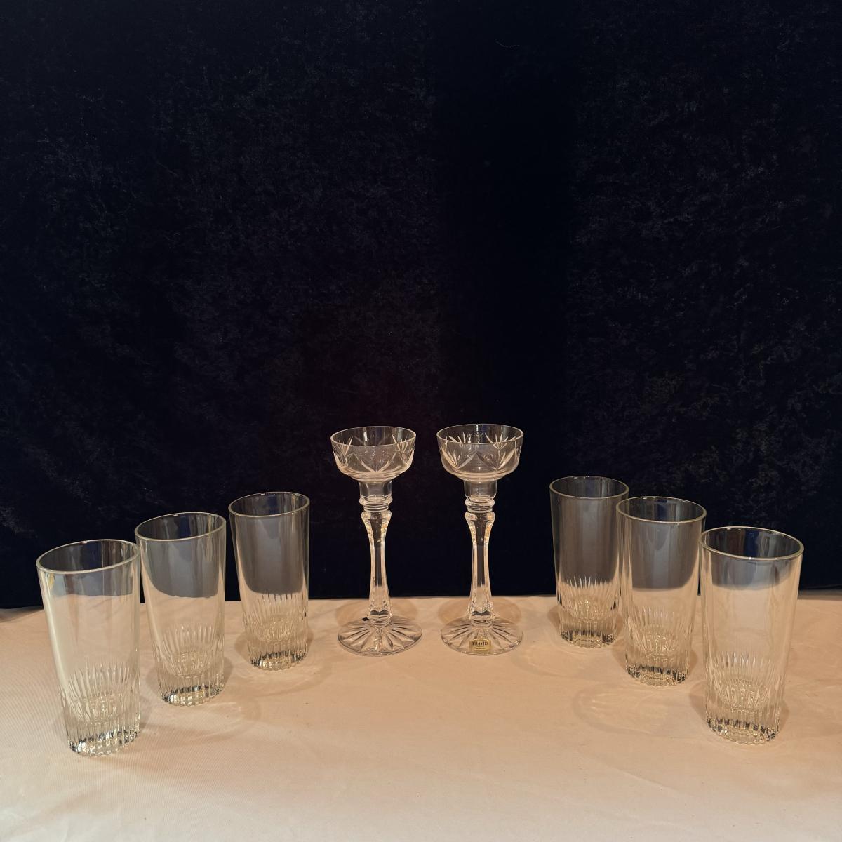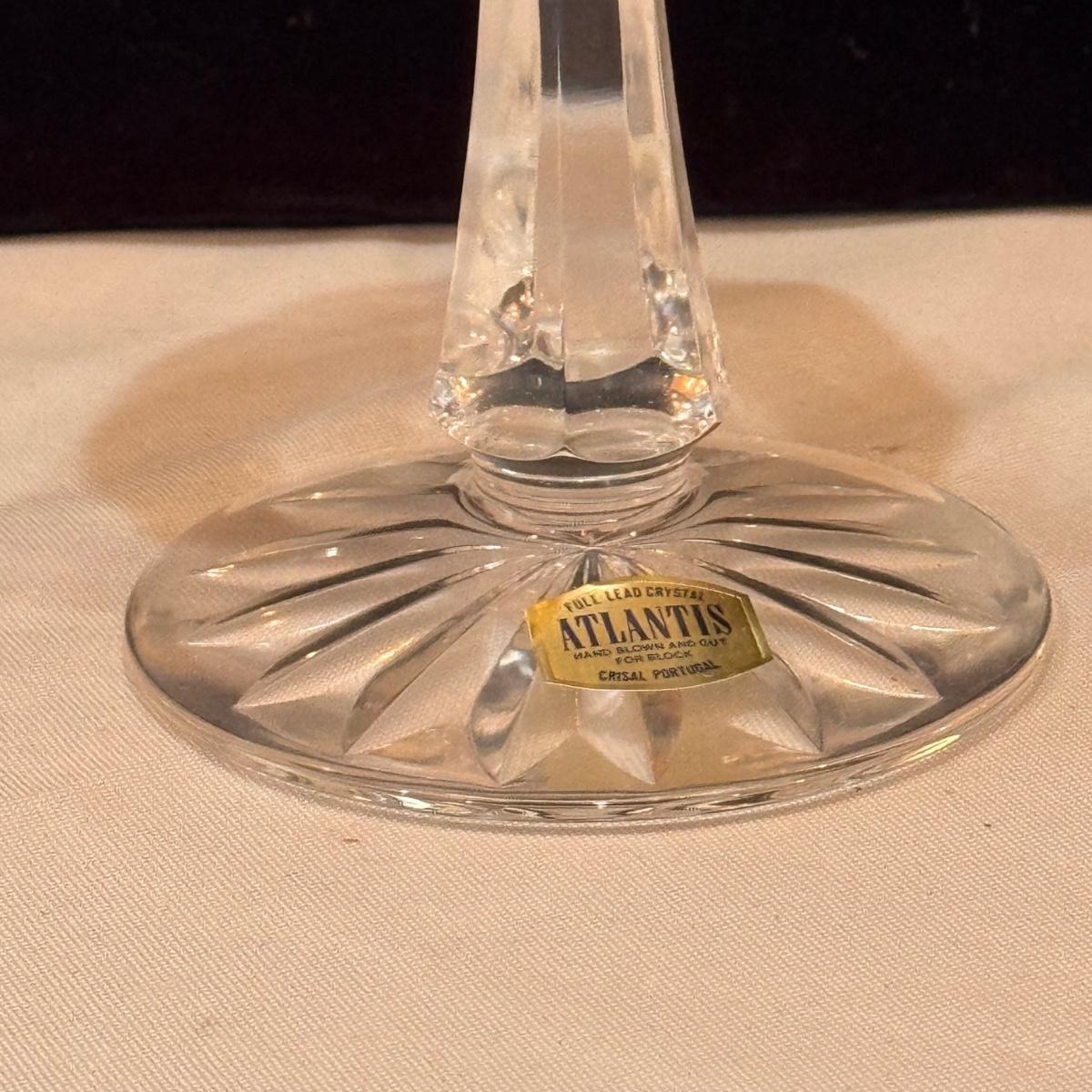 This lot includes two Crisal Portugal candlestick holders, and six Crisal Portugal glasses. The two candlestick holders are hand blown.. All of the glassware is marked with Crisal Portugal. The candlestick holders individually measure 3.5” x 8.25”H. The glasses individually measure 3” x 6”H. Shipping available.