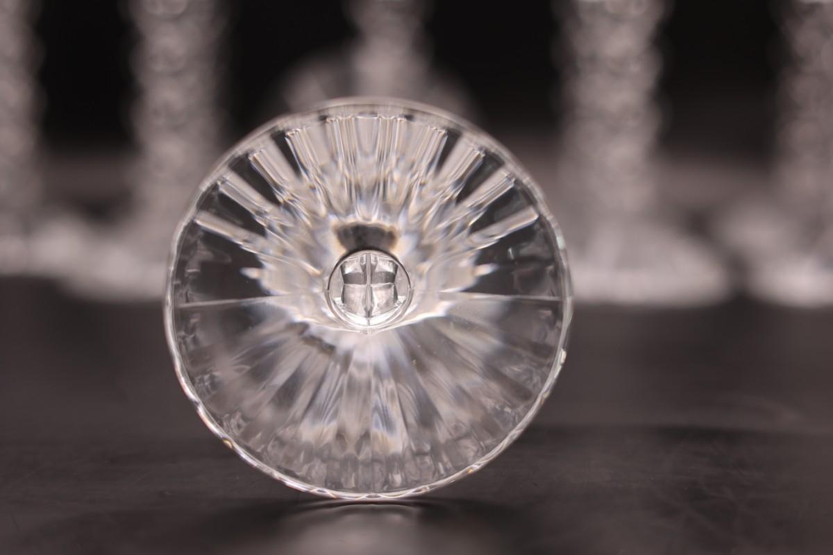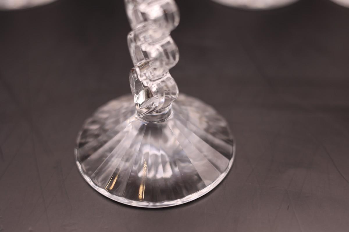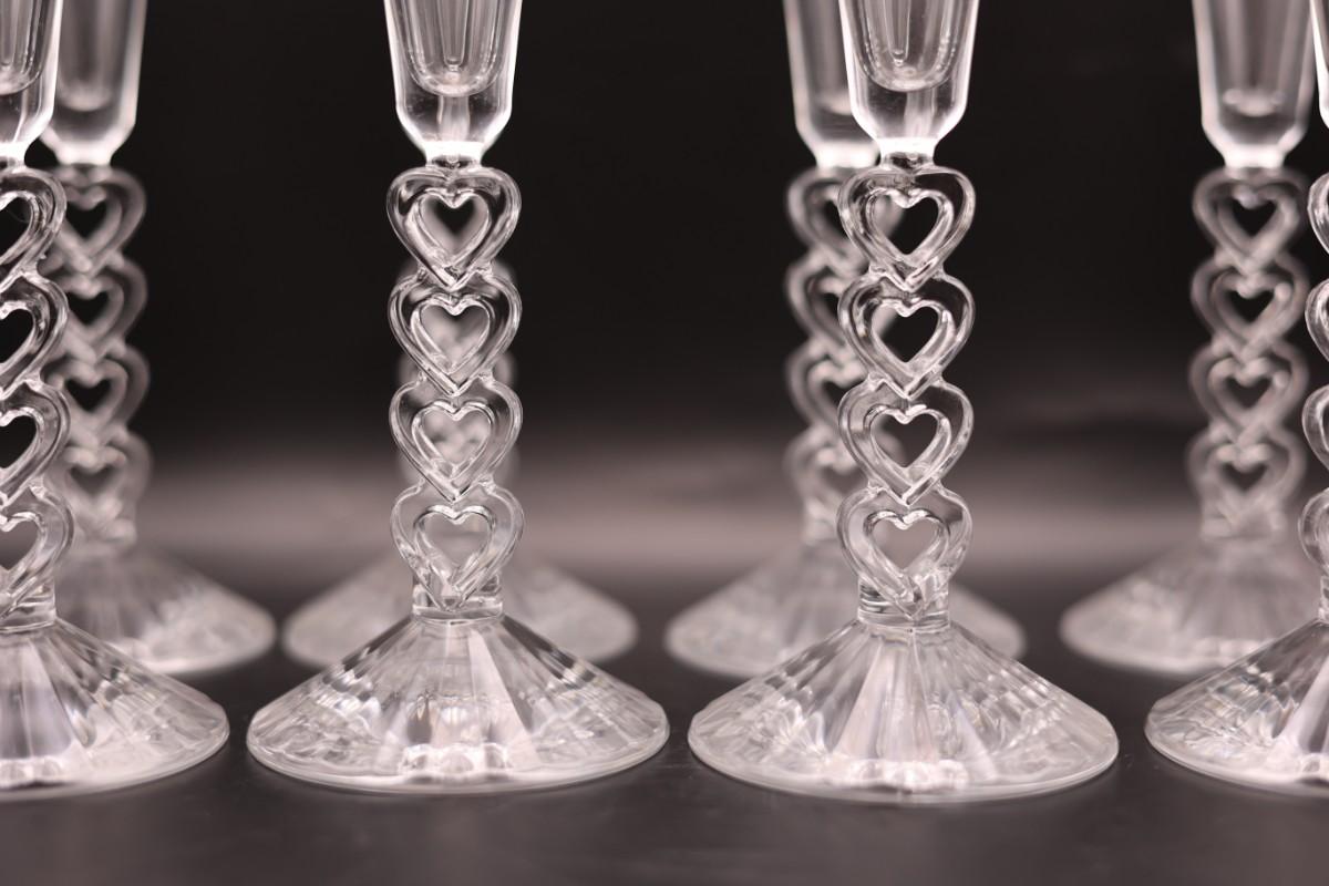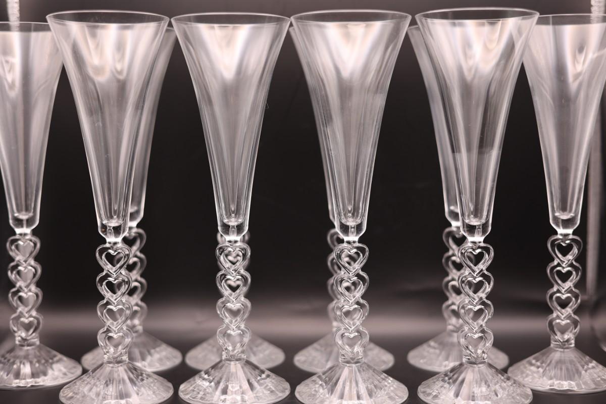 Set of ten Cristal d’Arques-Durand “Forever” champagne toasting flutes featuring tall flared bowls and decorative heart-link stems with patterned bases.