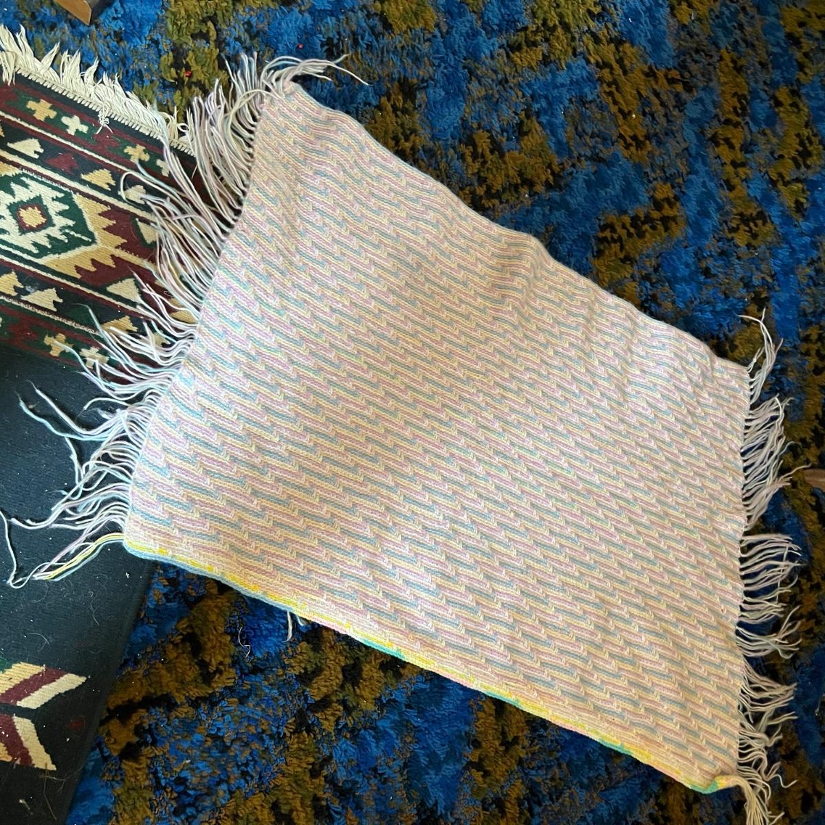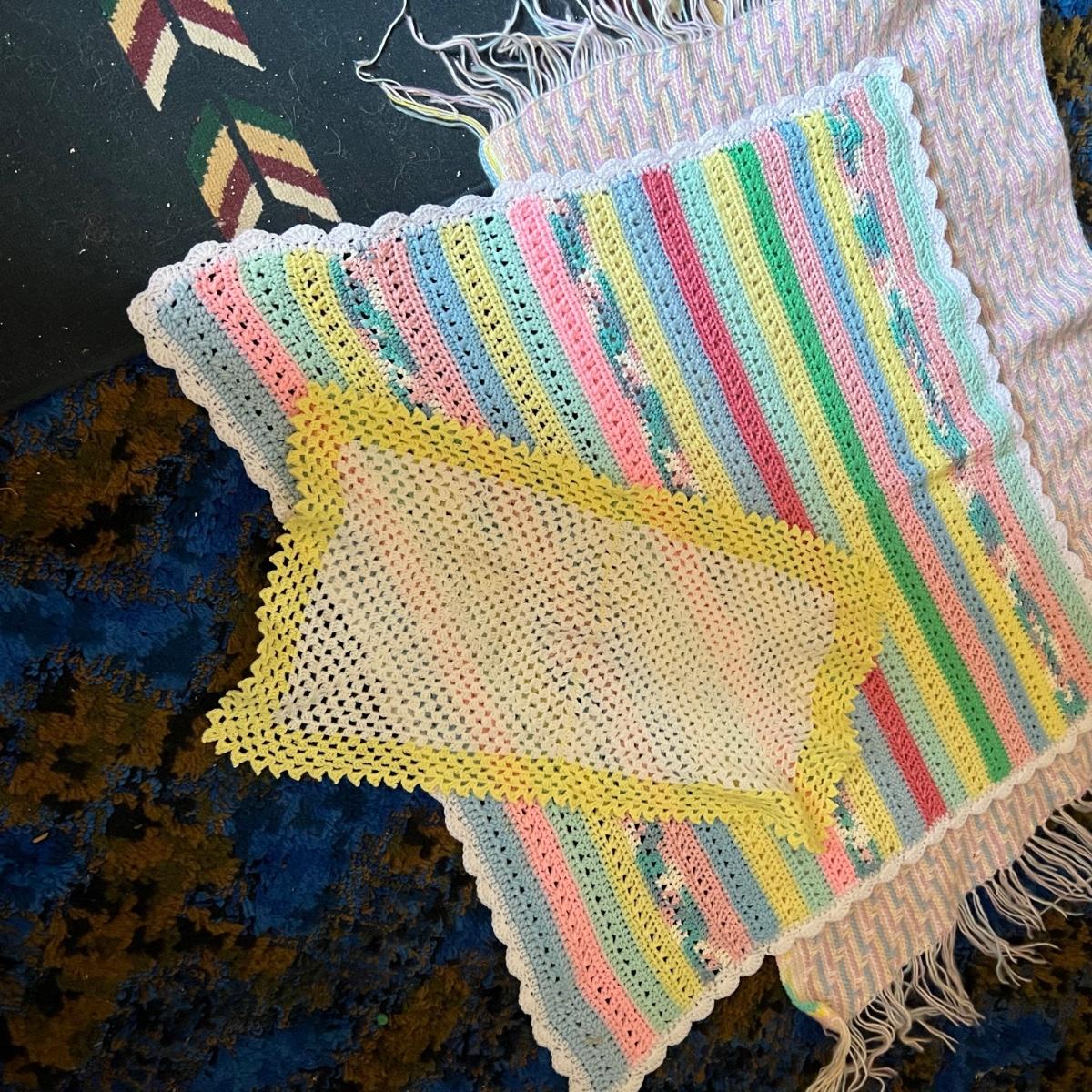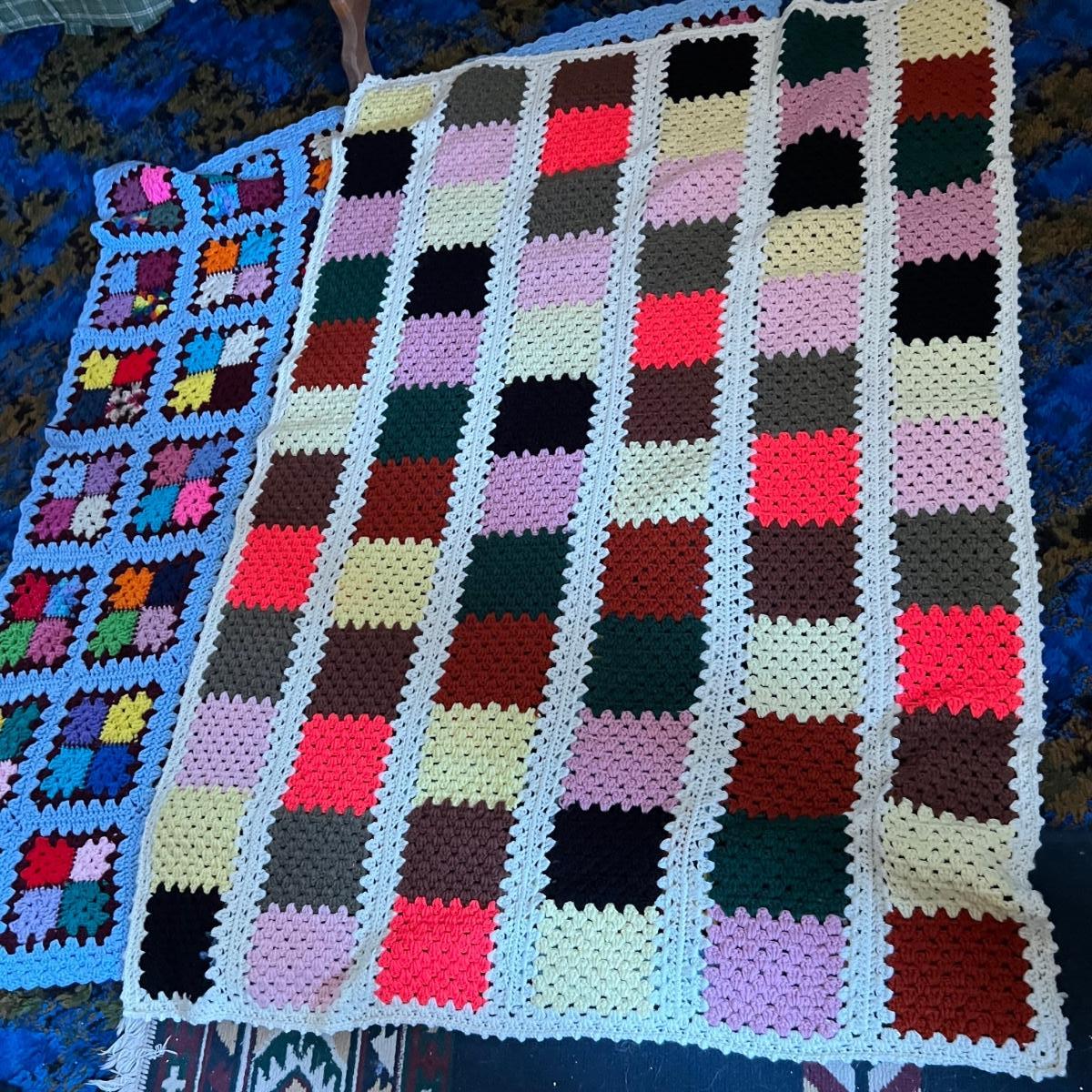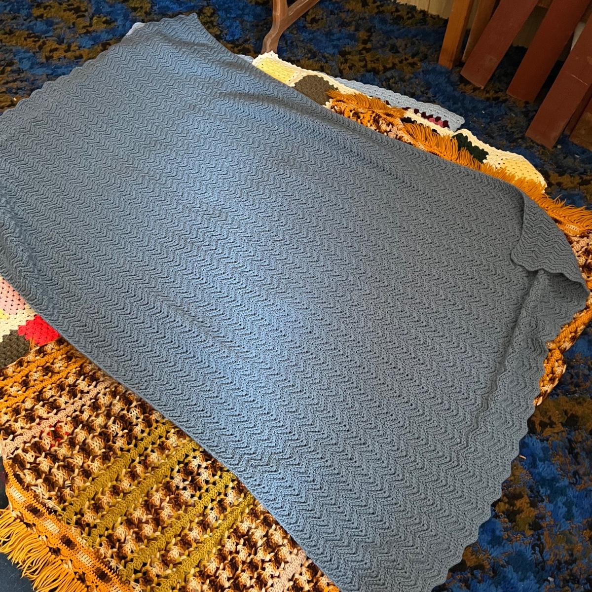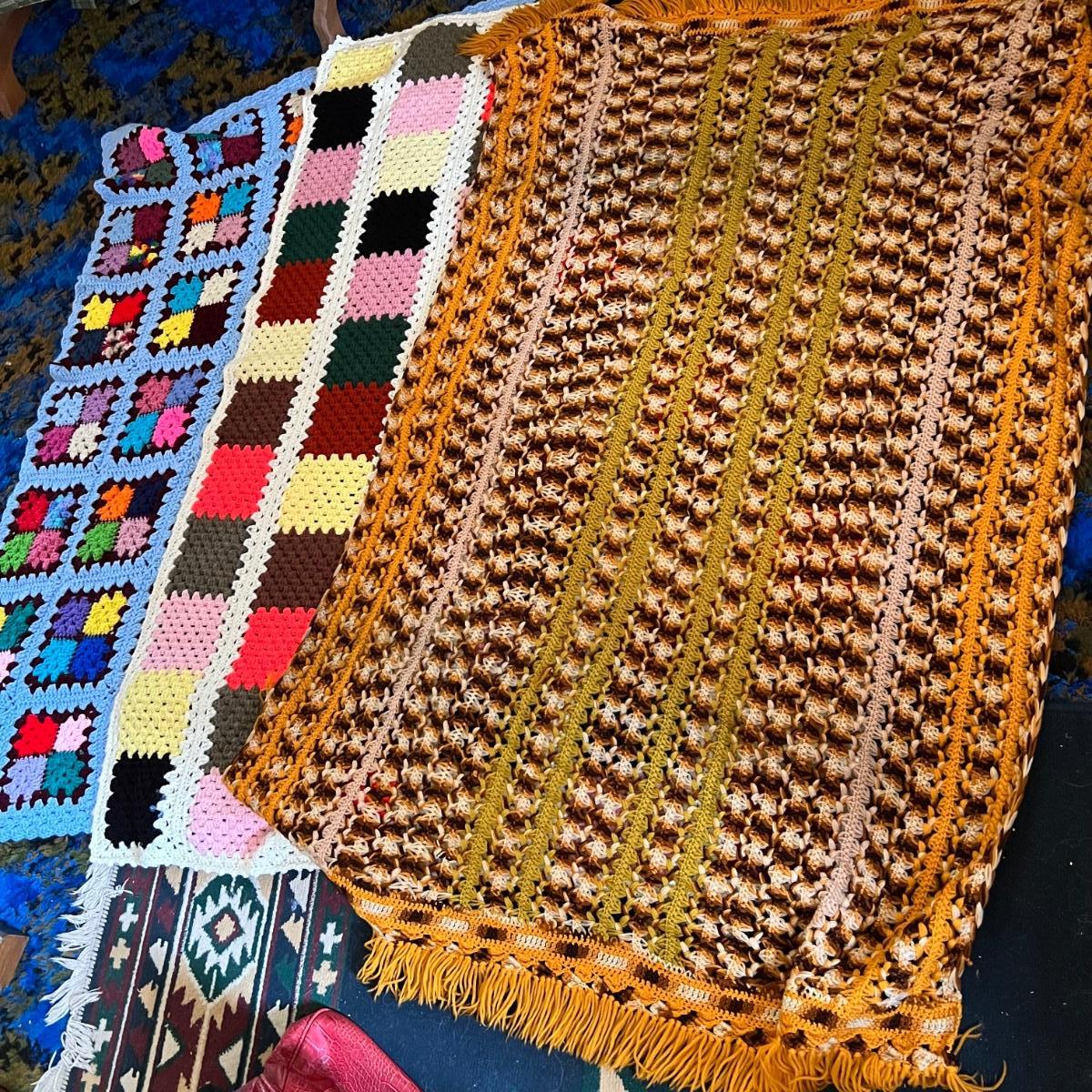 Seven crocheted blankets in this lot. The largest is the plain blue blanket which measures 63” x 66”.