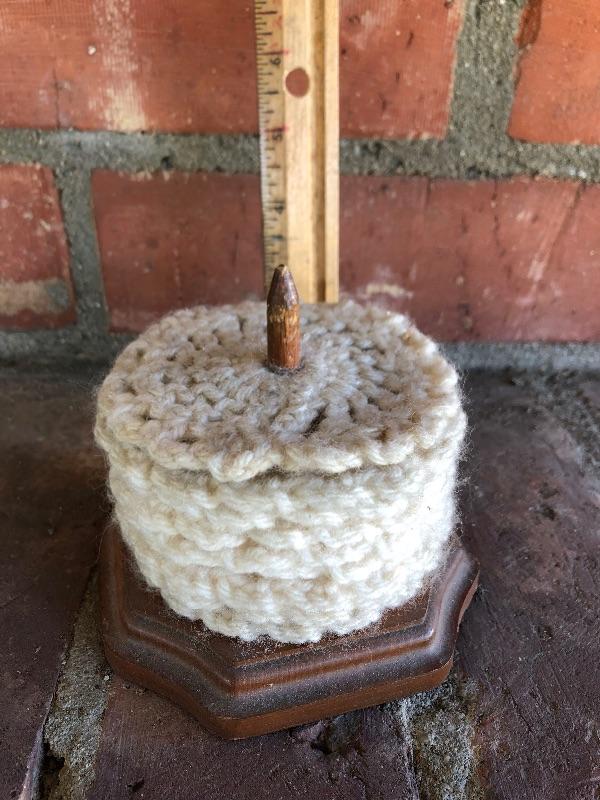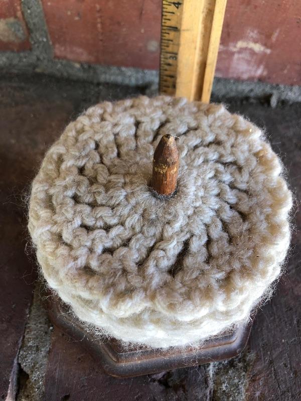 Set of crochet coasters held on a wooden pag stand. Fair condition, need to be washed.