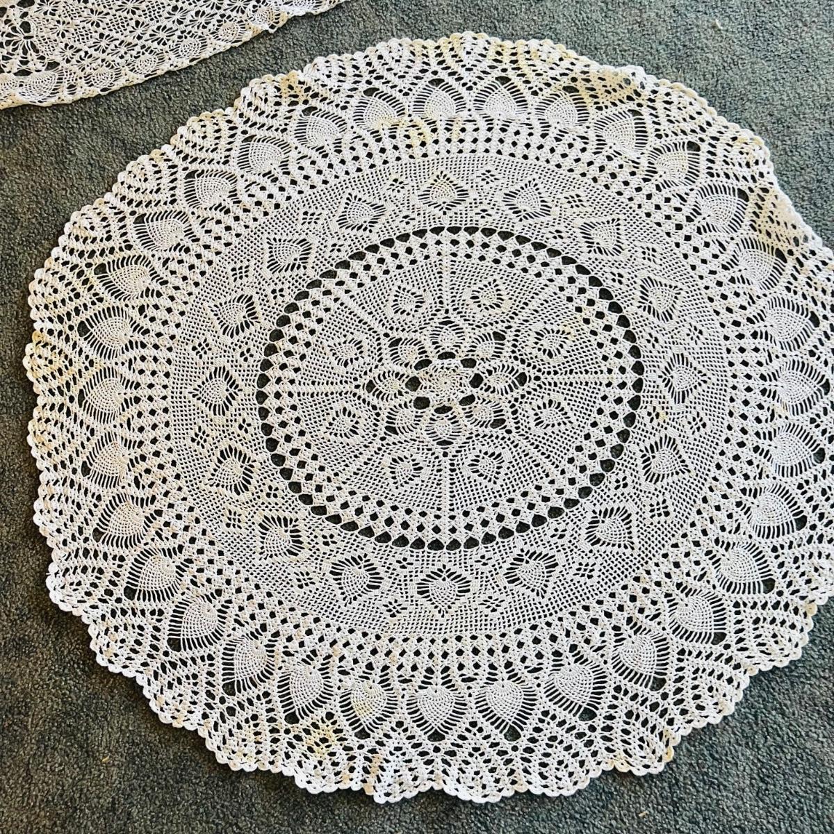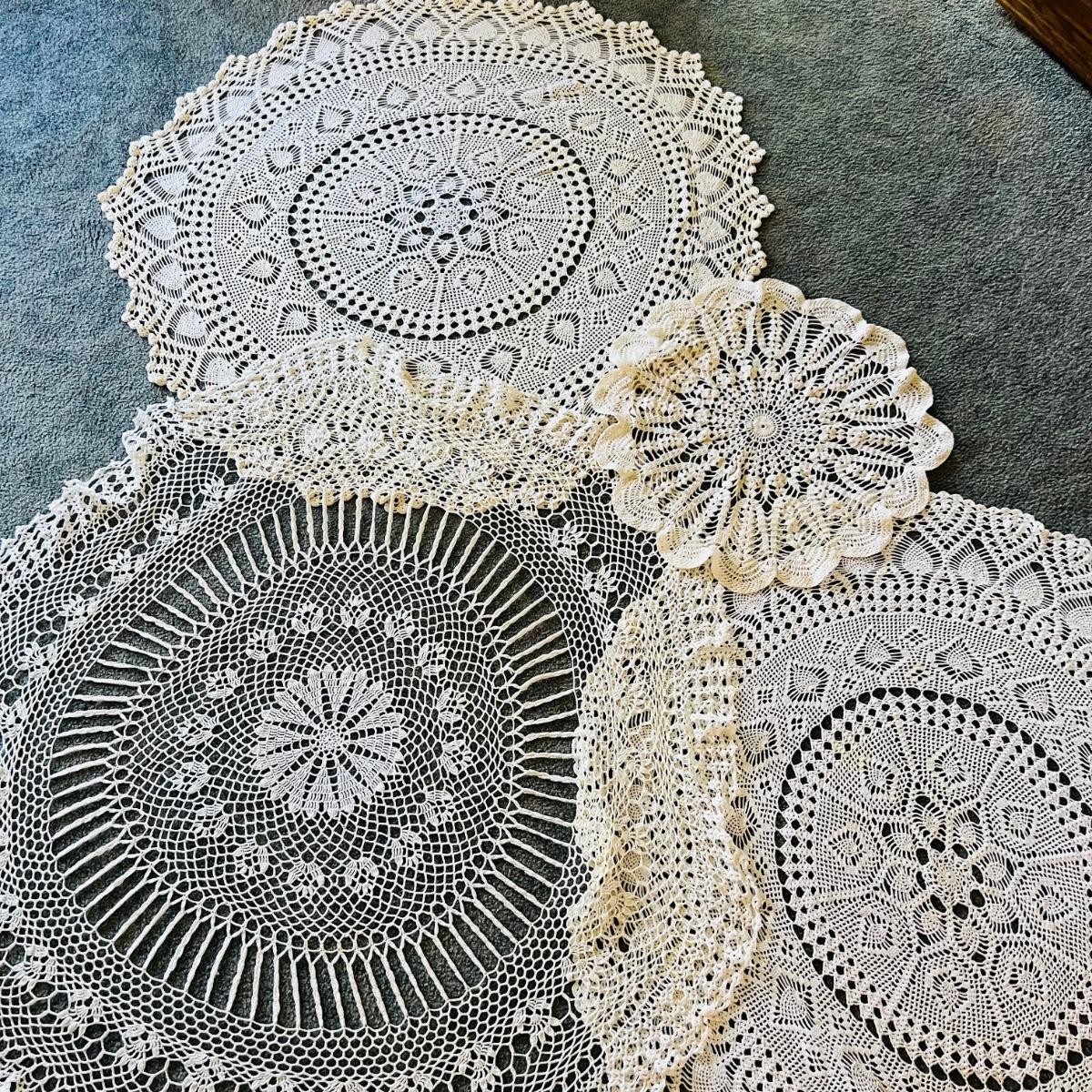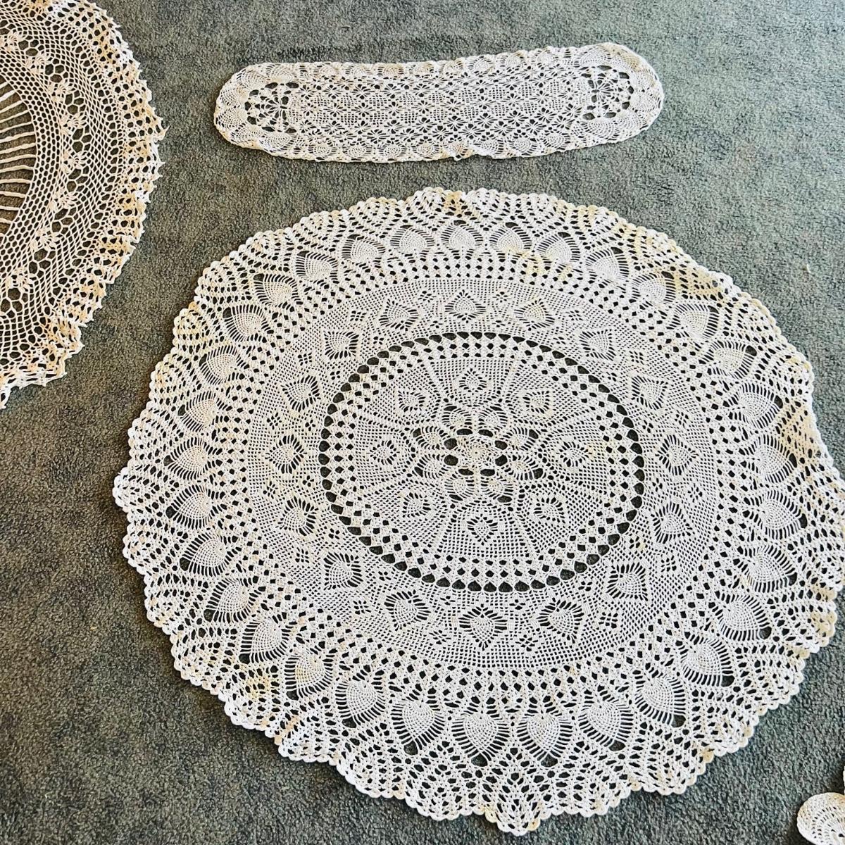 Collection of beautifully detailed crocheted pieces. Two round crocheted table coverings measure 48” D and larger covering measures 56”D. Lot also includes a 26”D crocheted table covering and a 36”runner. Three smaller place mats also included.