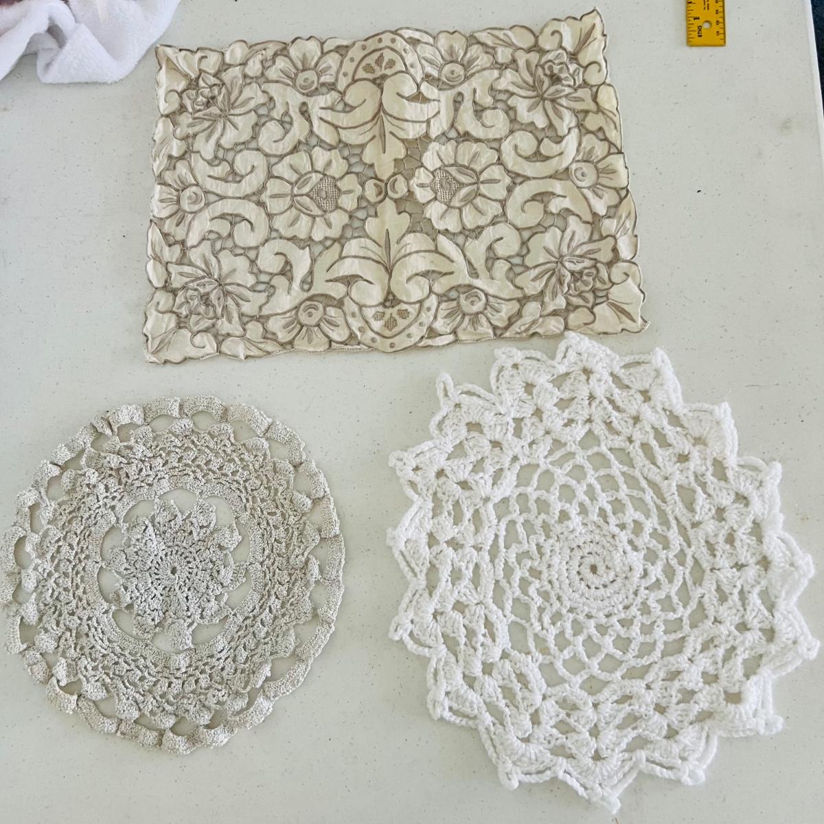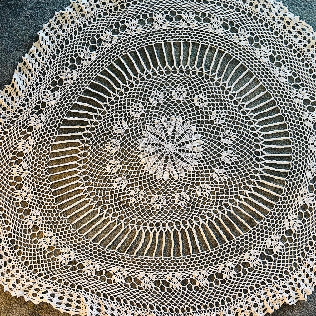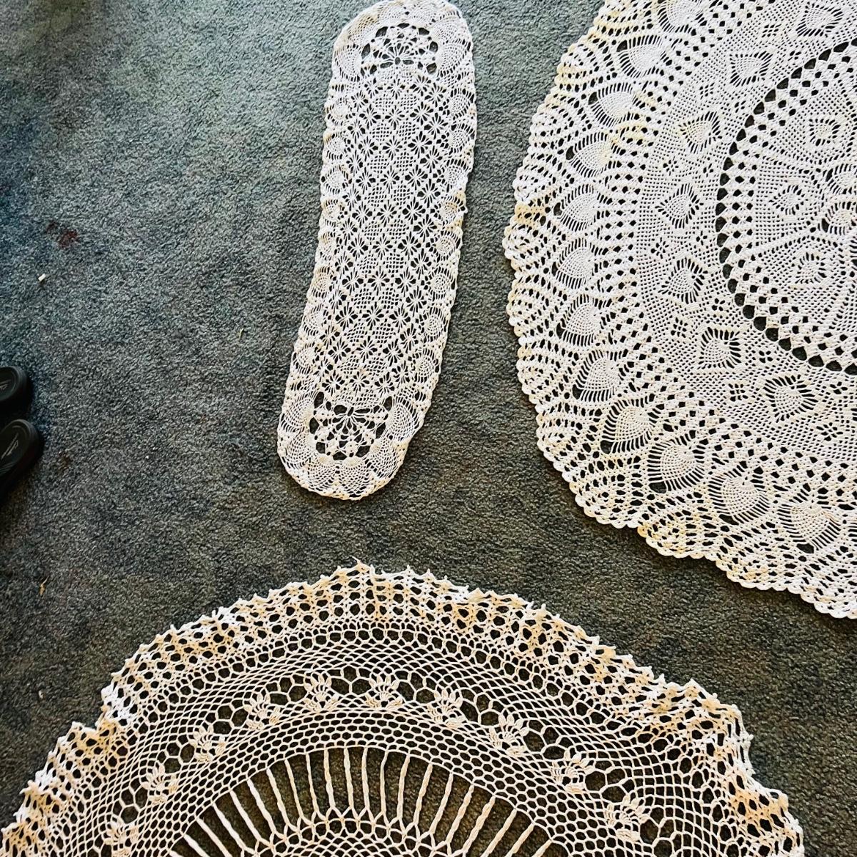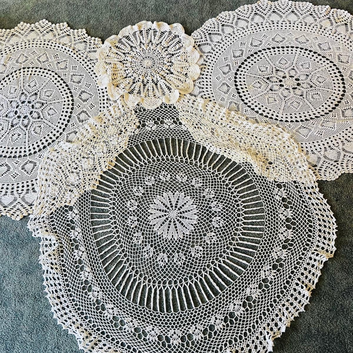Collection of beautifully detailed crocheted pieces. Two round crocheted table coverings measure 48” D and larger covering measures 56”D. Lot also includes a 26”D crocheted table covering and a 36”runner. Three smaller place mats also included.