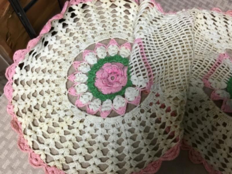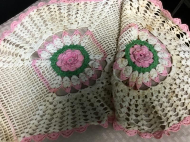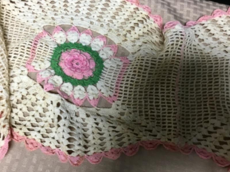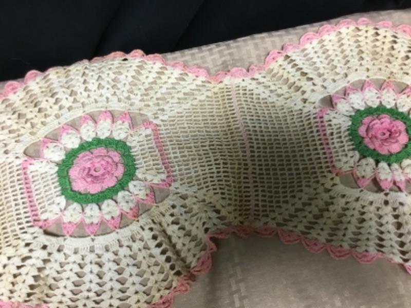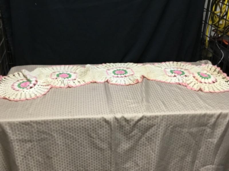 Crochet Dollie table runner with pink roses. It does have some stains 65” L